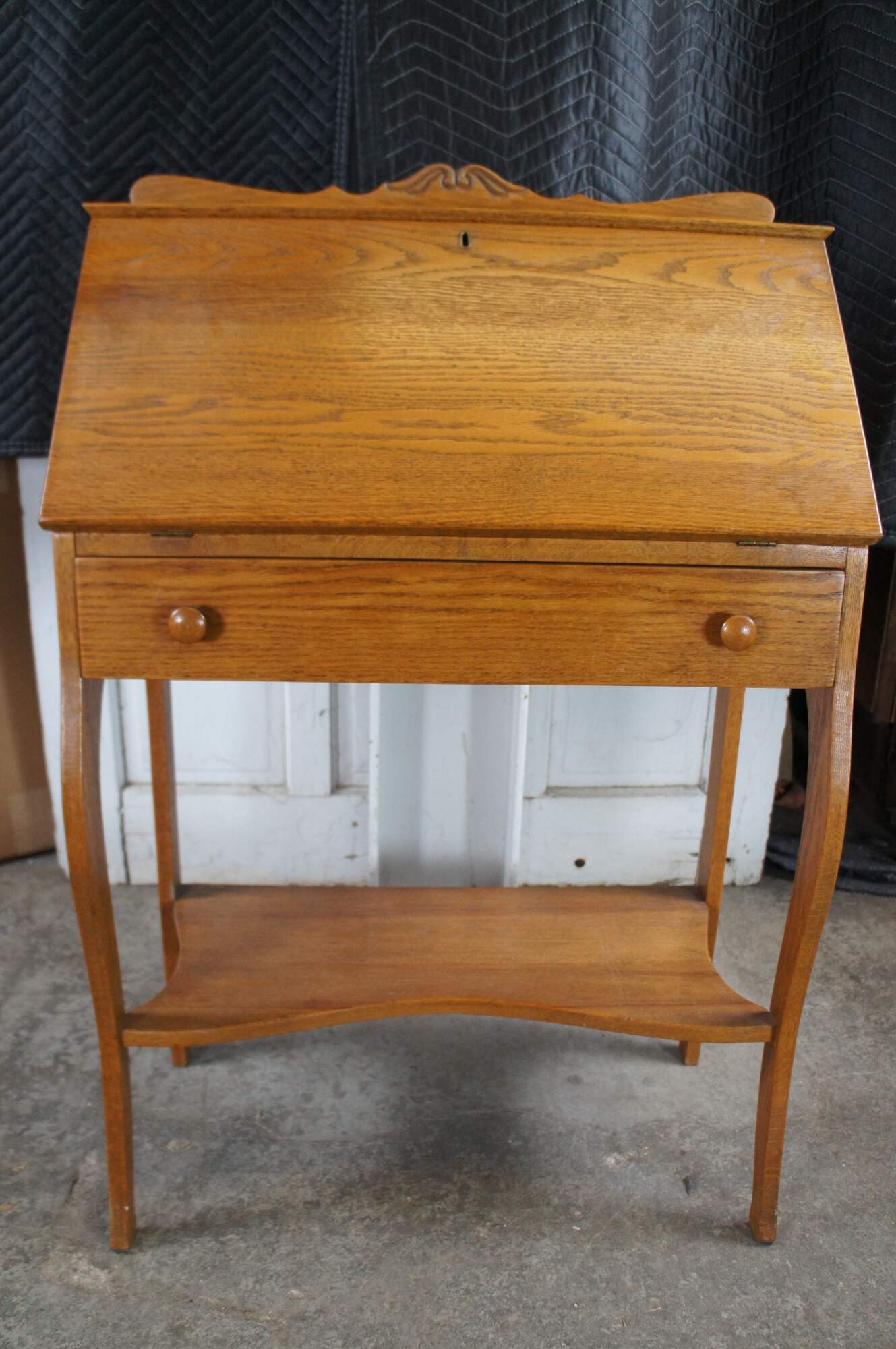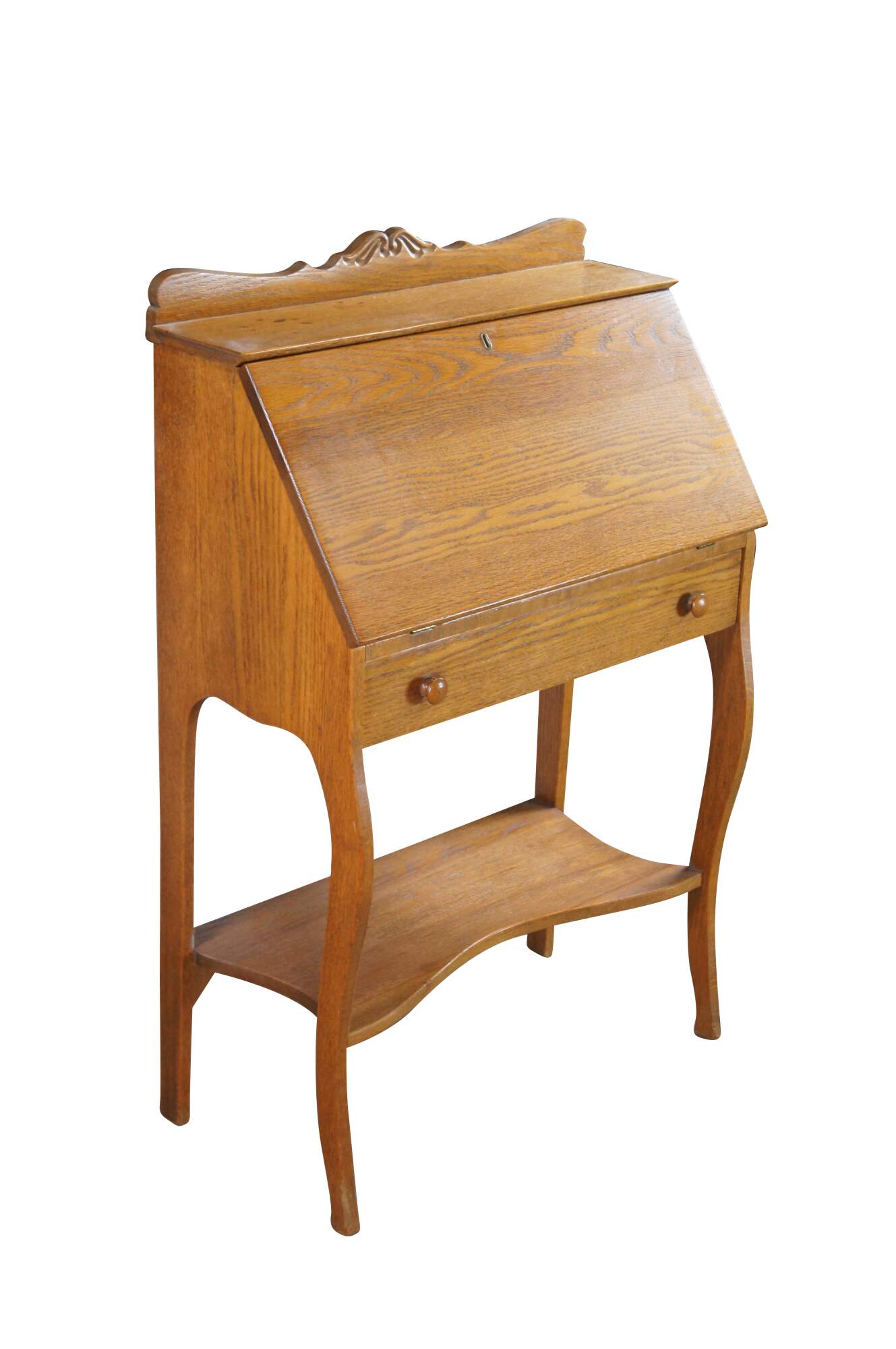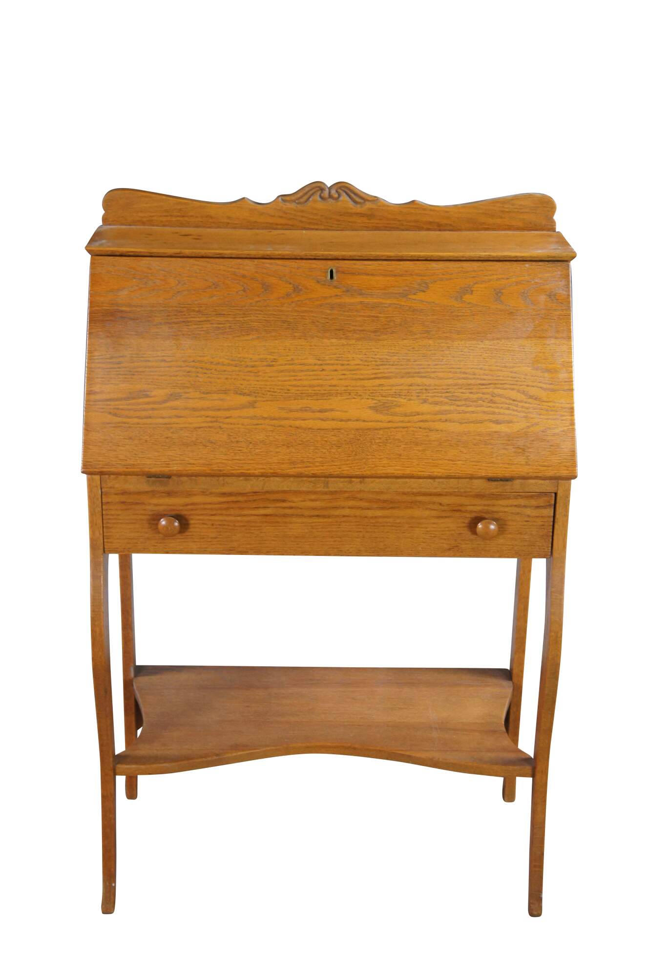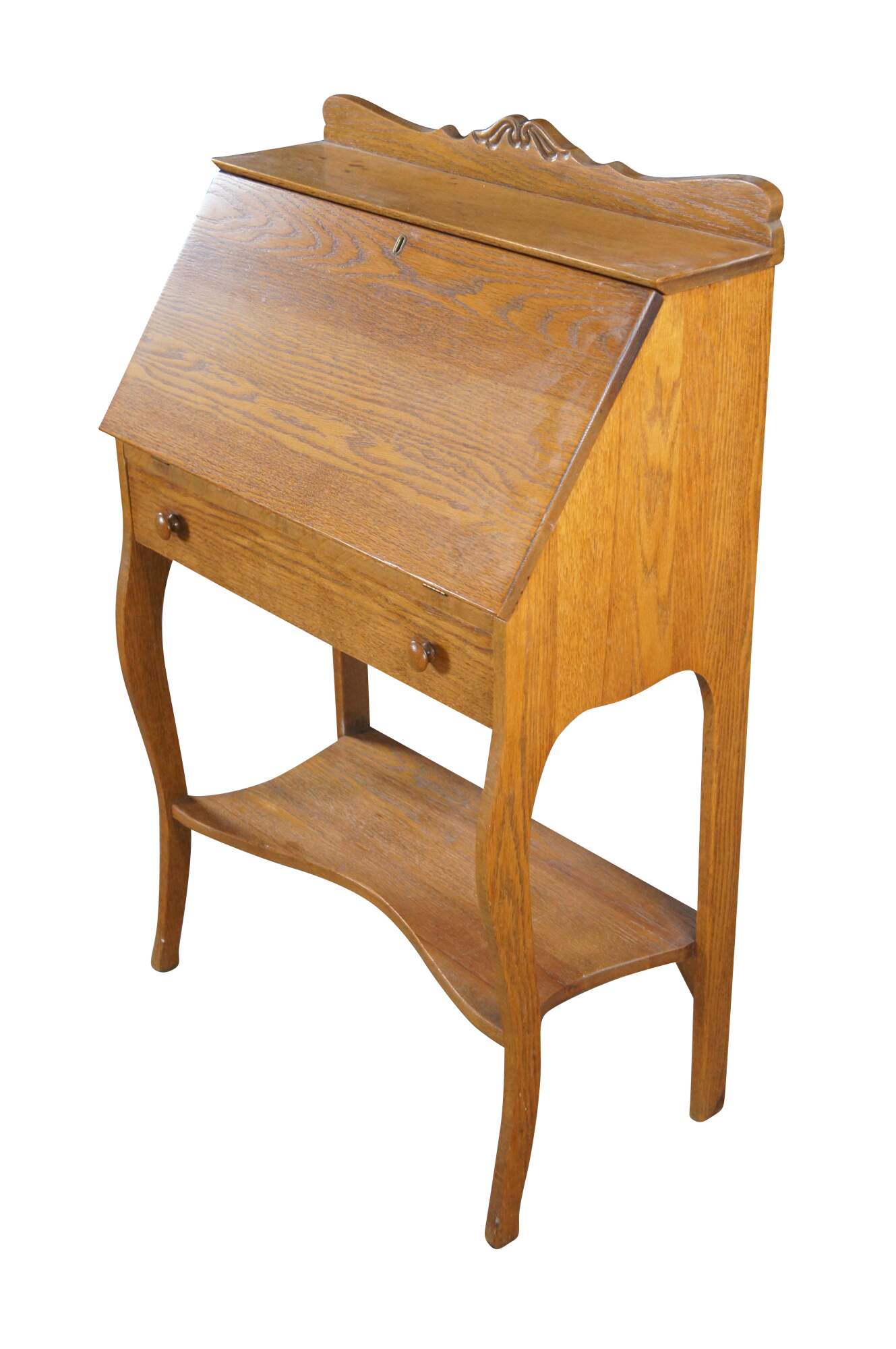 Late Victorian Oak Ladies Secretary Deks, Circa 1900. Features a carved backspash over shelf and slant front. Desk opens to a work surface, pigeon holes and one interior drawer. A larger dovtailed drawer with turned pulls sits beneath the slant front. Legs are contoured along the front and straight at the rear. Lower shelf centered between the legs.