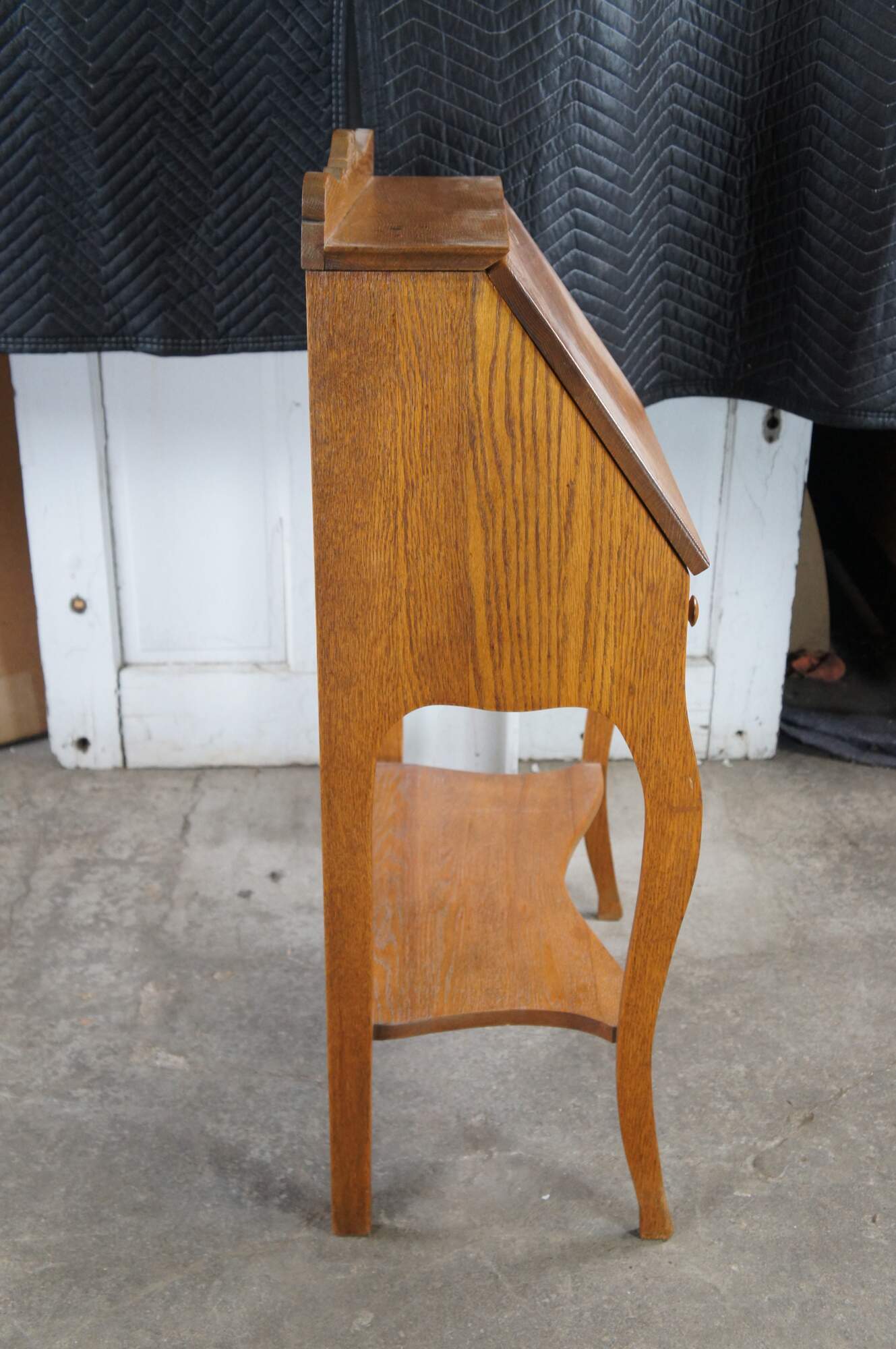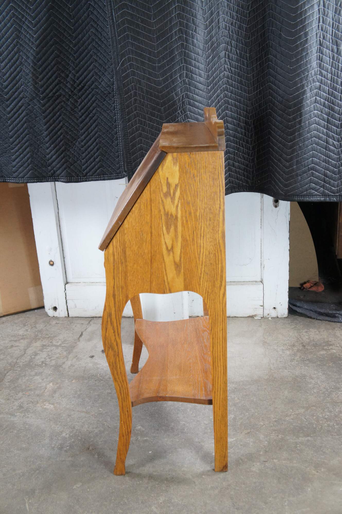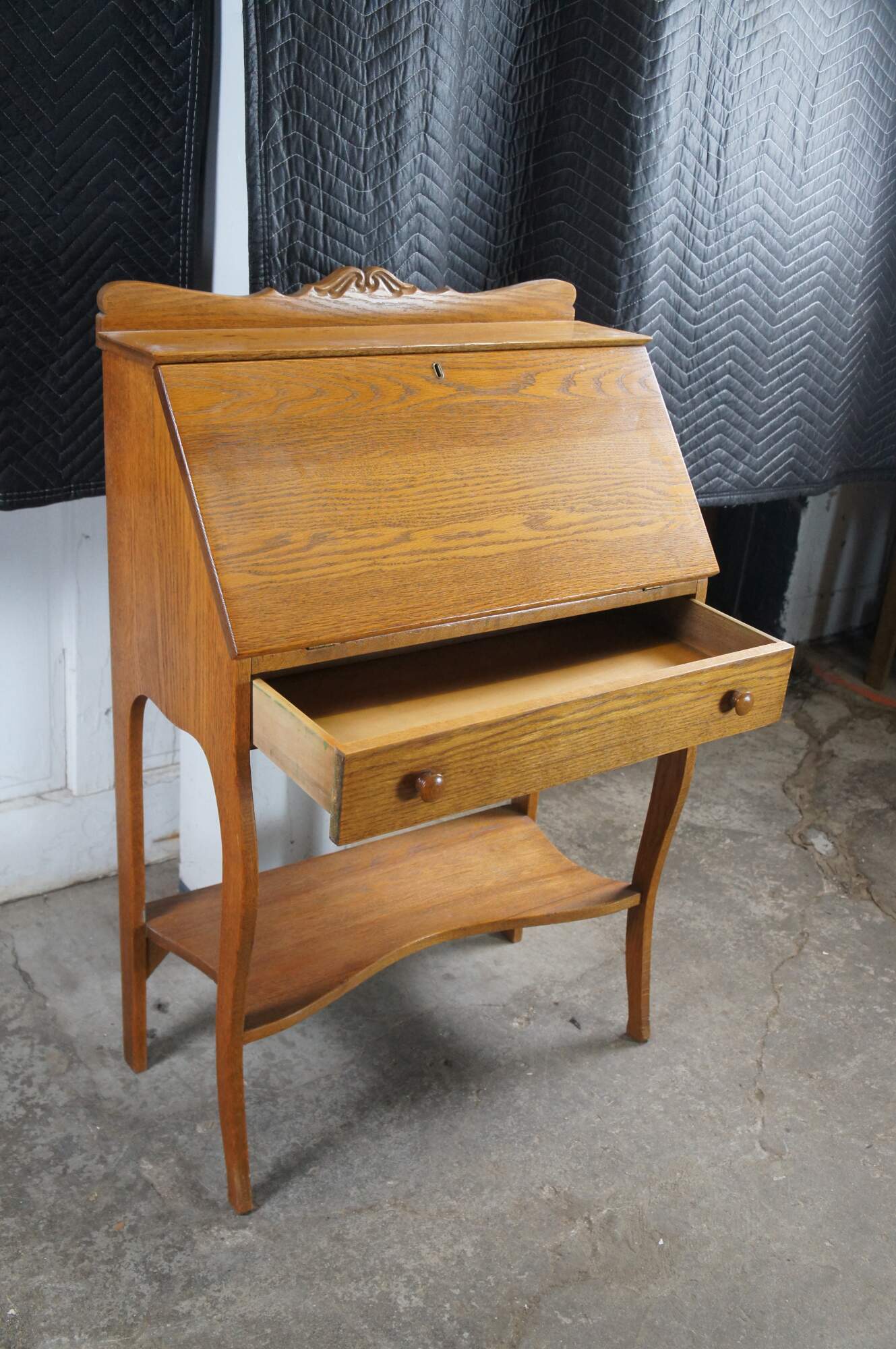 Late Victorian Oak Ladies Secretary Deks, Circa 1900. Features a carved backspash over shelf and slant front. Desk opens to a work surface, pigeon holes and one interior drawer. A larger dovtailed drawer with turned pulls sits beneath the slant front. Legs are contoured along the front and straight at the rear. Lower shelf centered between the legs.
