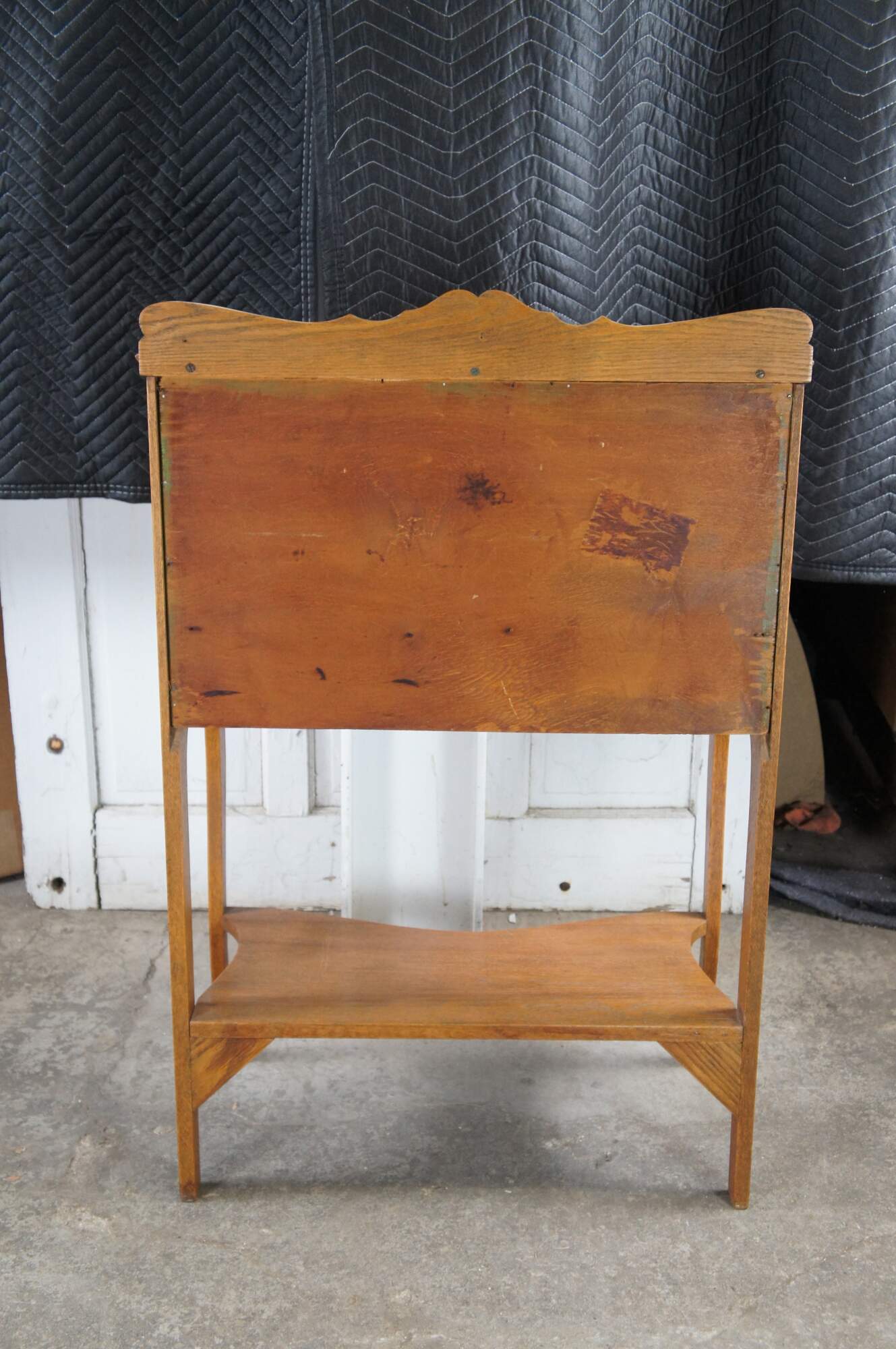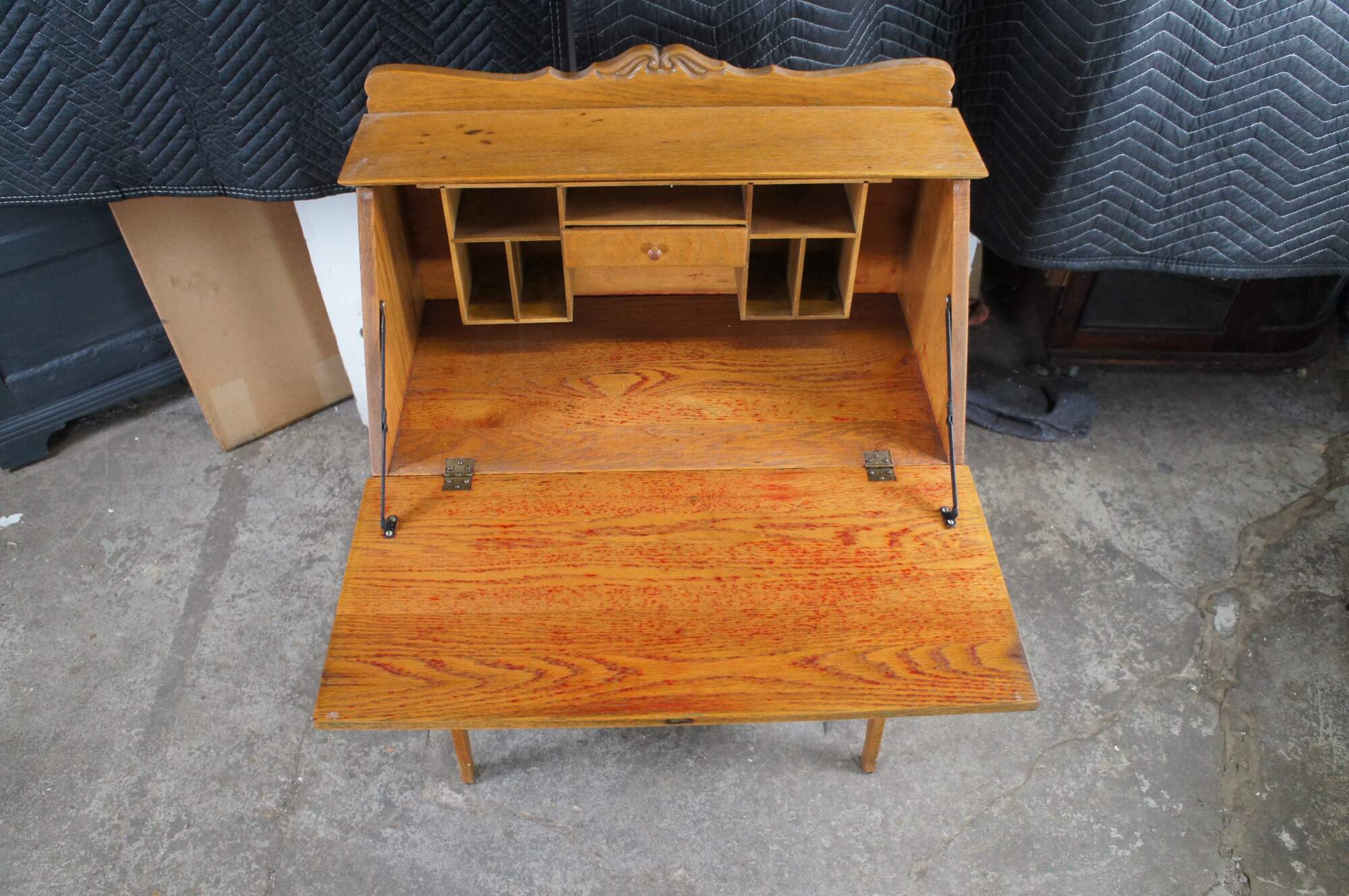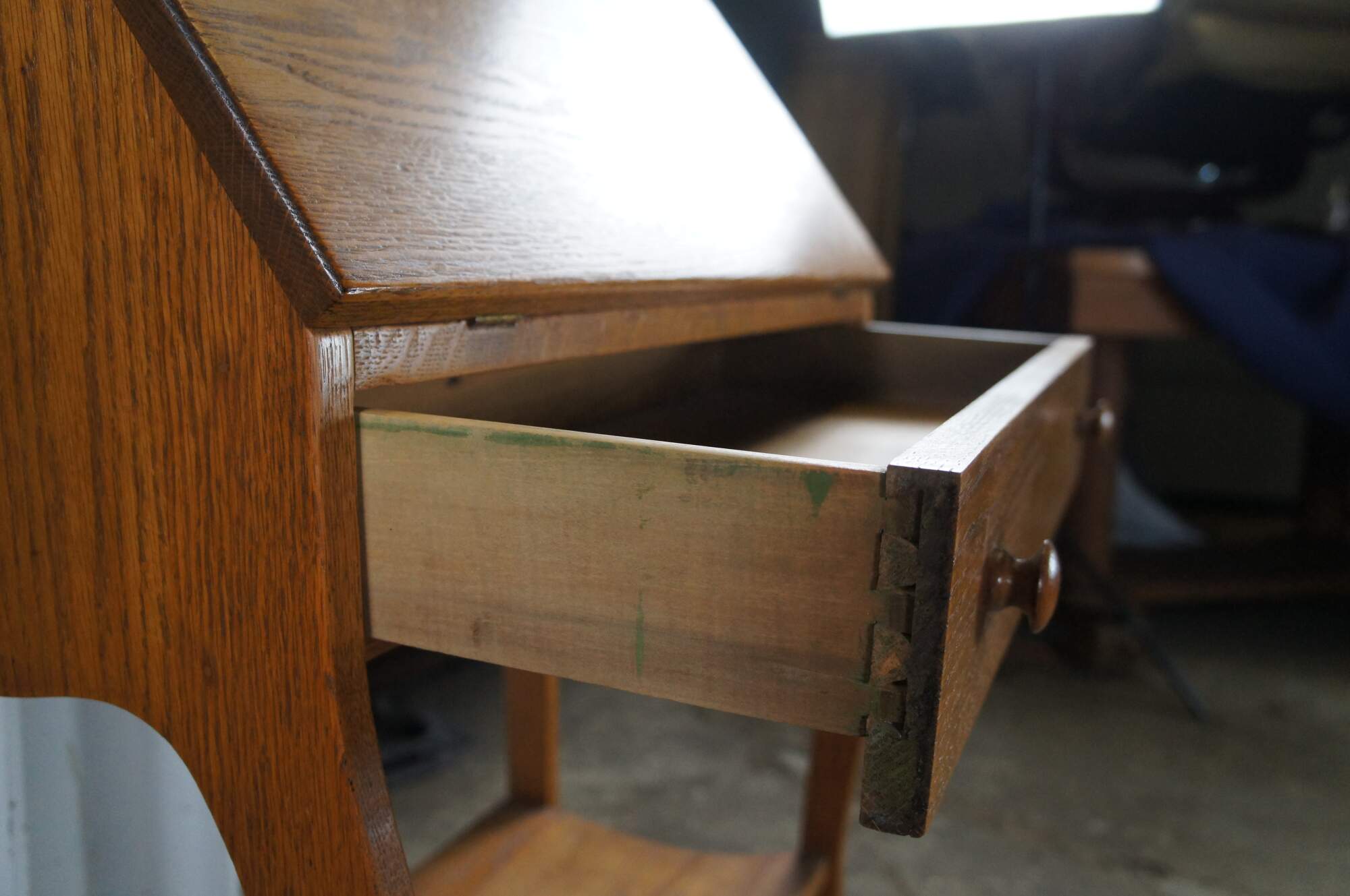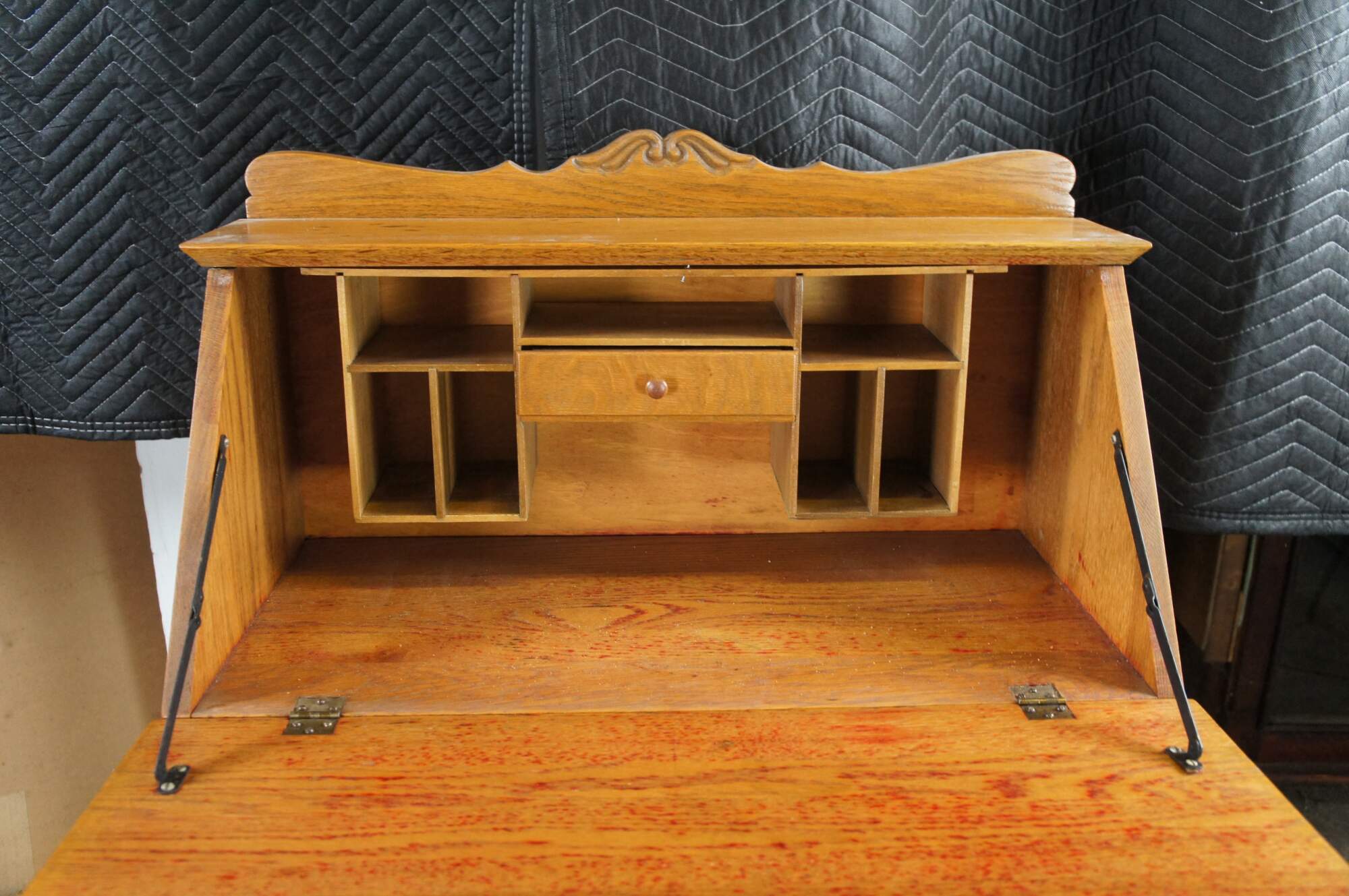 Late Victorian Oak Ladies Secretary Deks, Circa 1900. Features a carved backspash over shelf and slant front. Desk opens to a work surface, pigeon holes and one interior drawer. A larger dovtailed drawer with turned pulls sits beneath the slant front. Legs are contoured along the front and straight at the rear. Lower shelf centered between the legs.