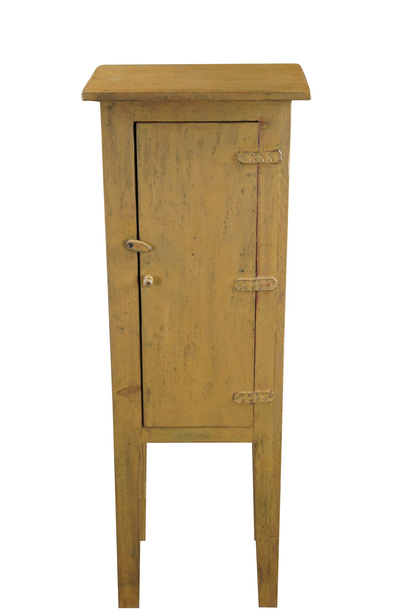 A neat rustic linen cabinet. Made from Pine with a painted finish. Features 2 fixed interior shelves, leather hinges and a latch along the door.