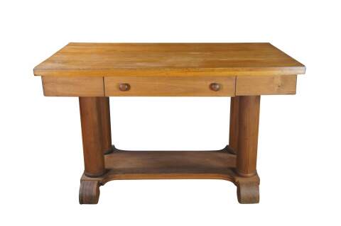 Early 20th Century Arts & Crafts / Mission Library Table. Features a rectangular form made from oak and pine `with a central drawer over columnar supports leading to a trestle base with scrolled feet.