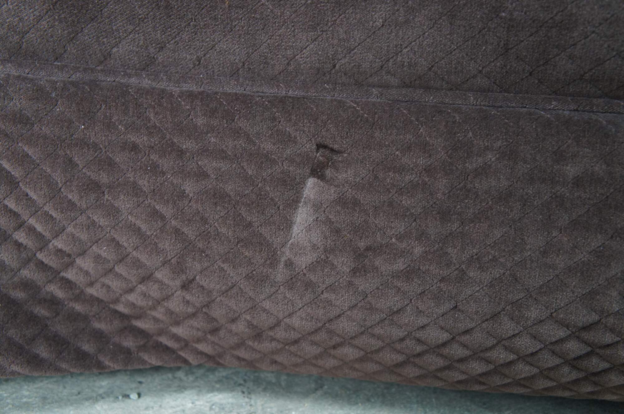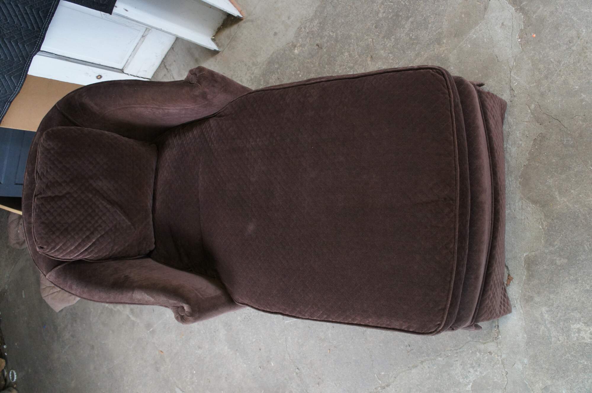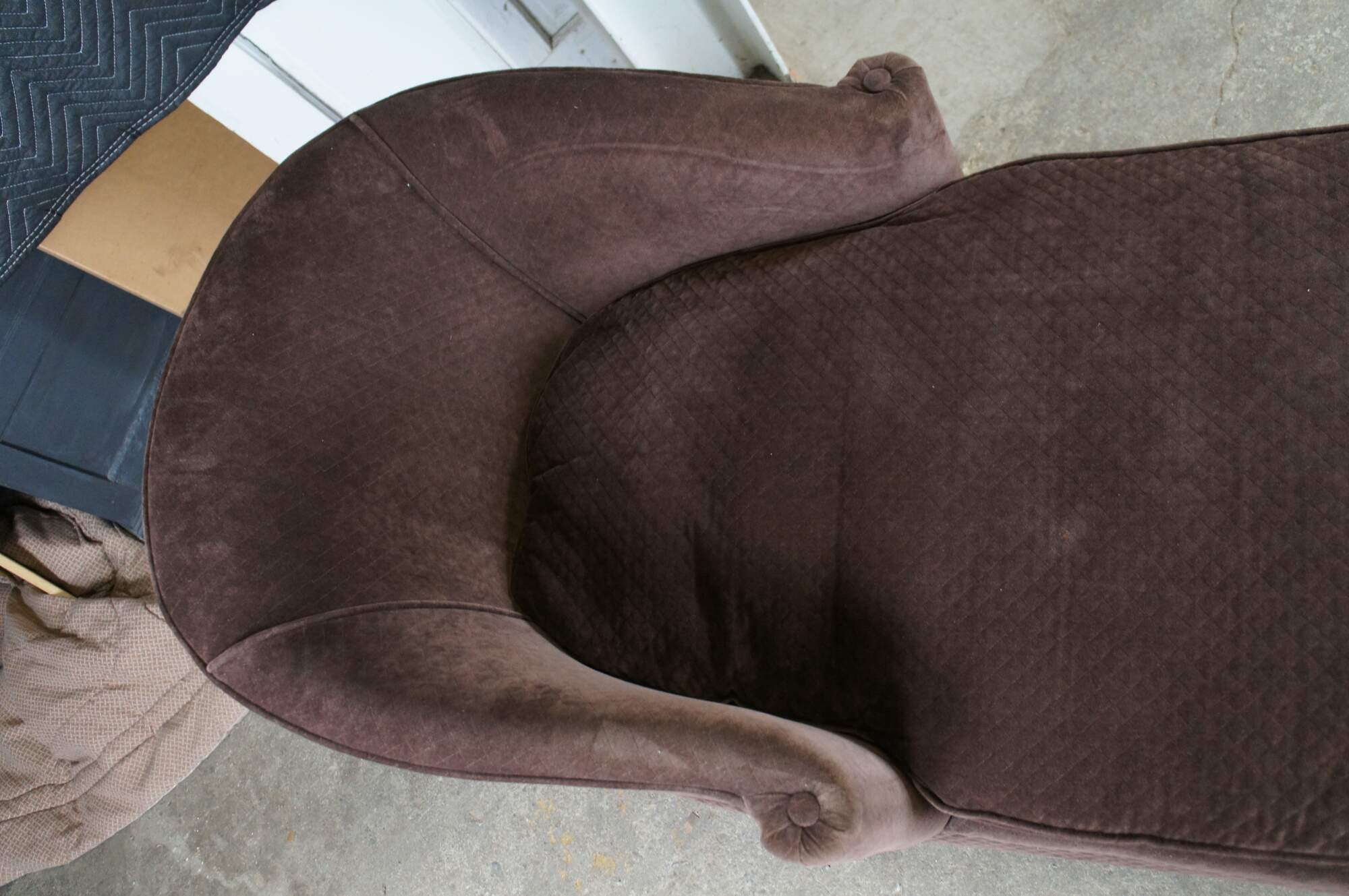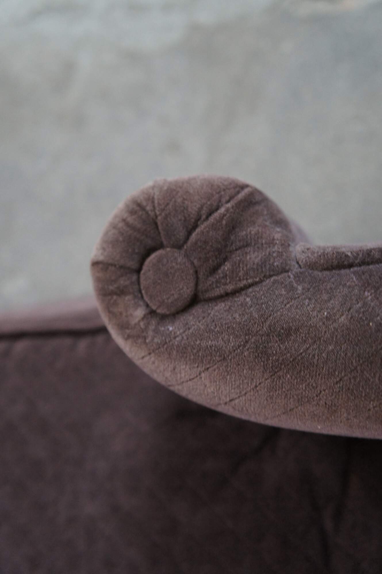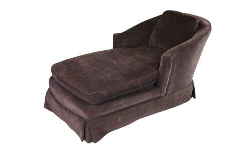 Late 20th Century Modern Chaise Lunge by Edwards Furniture Inc. Features a brown upholstered and quilted velvet fabric with a scrolled barrel back and comfy cushions.