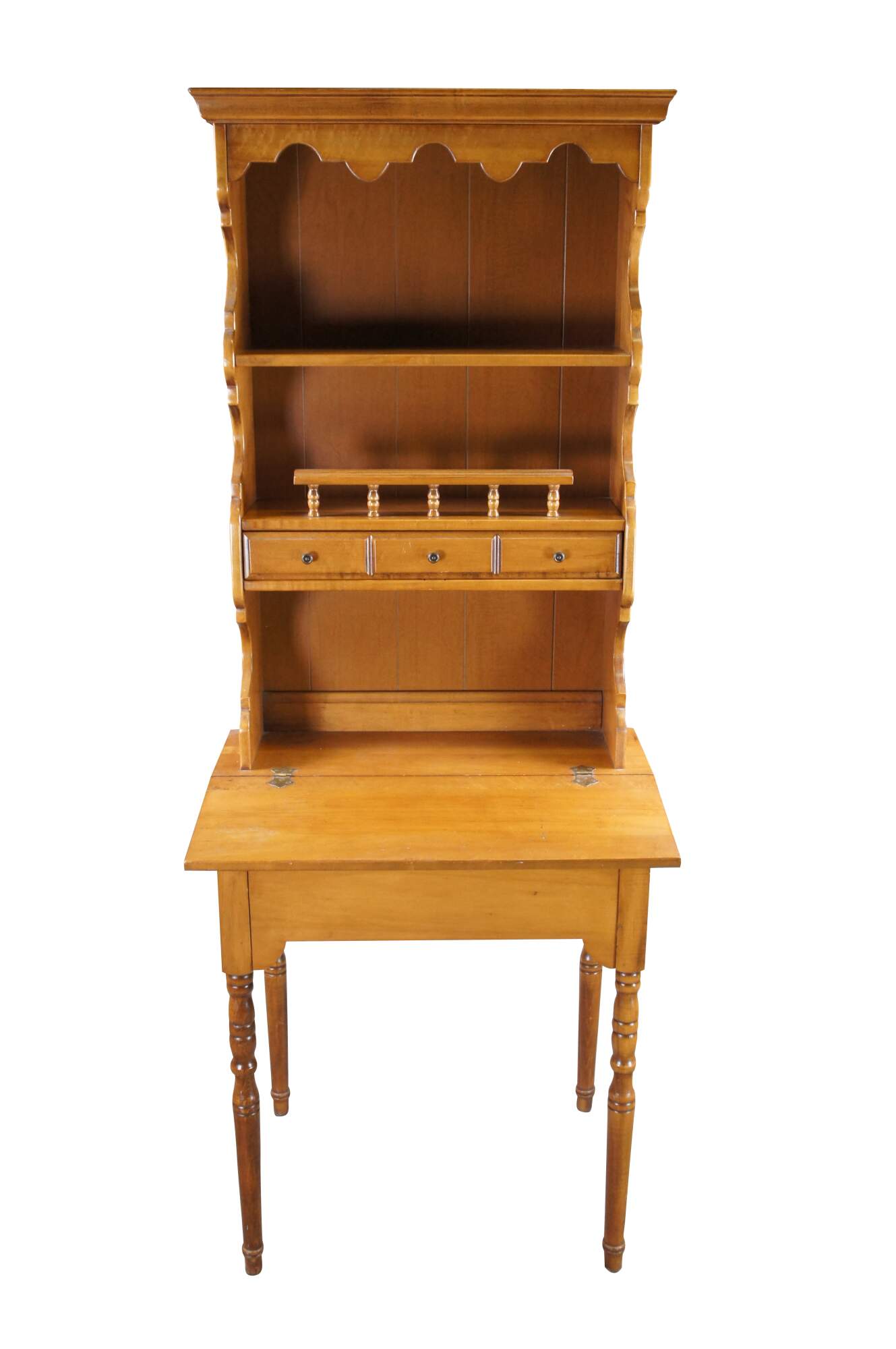 1960s American Country Dimunitive Desk & Hutch. Made from maple with a lift top writing desk topped by a large backsplash with shelves and drawer. Great for use as a bookshelf. Backsplash has serpentine cut sides, panelled back and one large dovetailed drawer made to look like it is three smaller ones. The desk is supported by turned legs with ribbed accents.