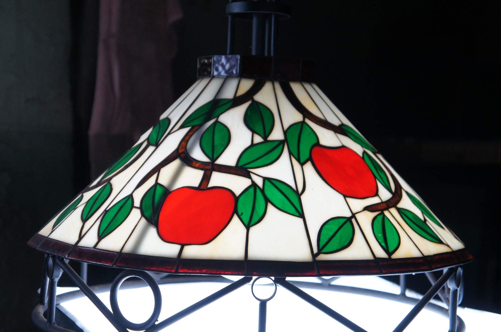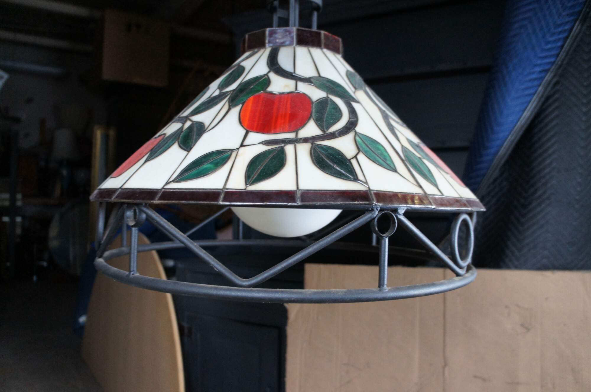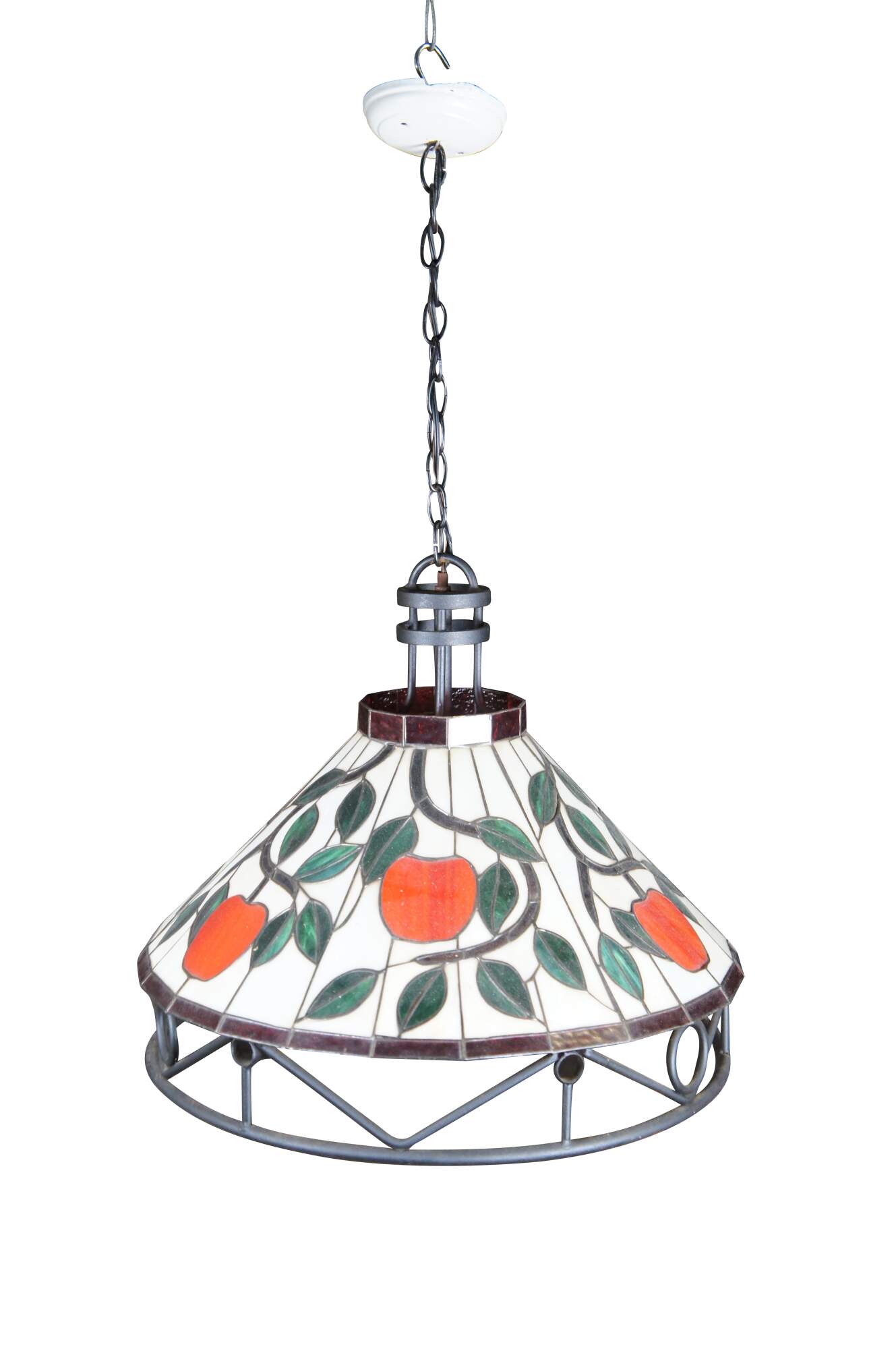 20th Century Tiffany Style Pendant Light / Chandelier. Made from iron with leaded stained glass panels featuring an apple and vine motif. Interior light is covered by a milk glass globe. The light hangs via a short chain with white pendant cap. Could be altered to use as a swag light. Circa 1970s