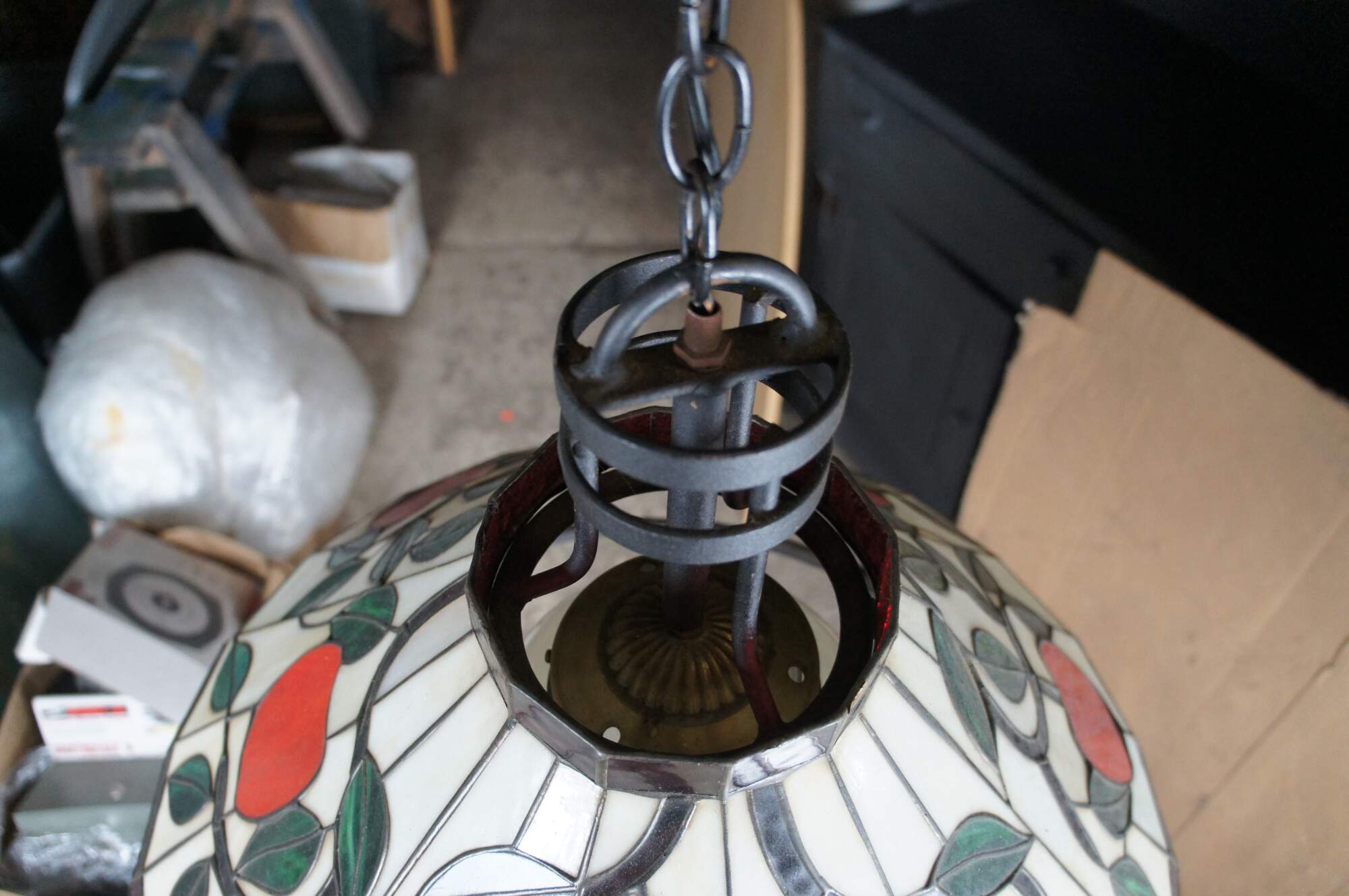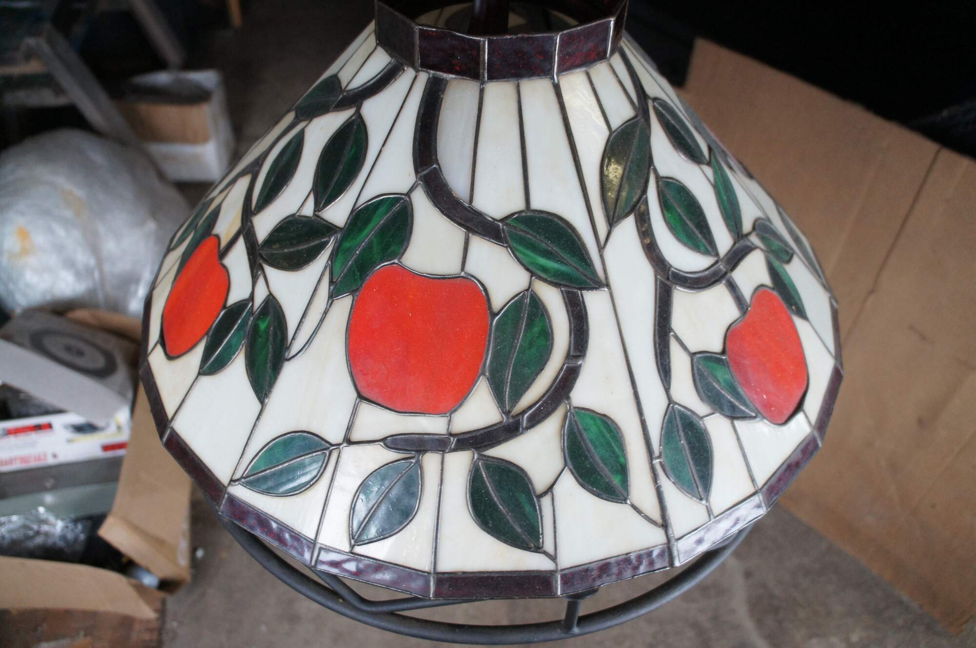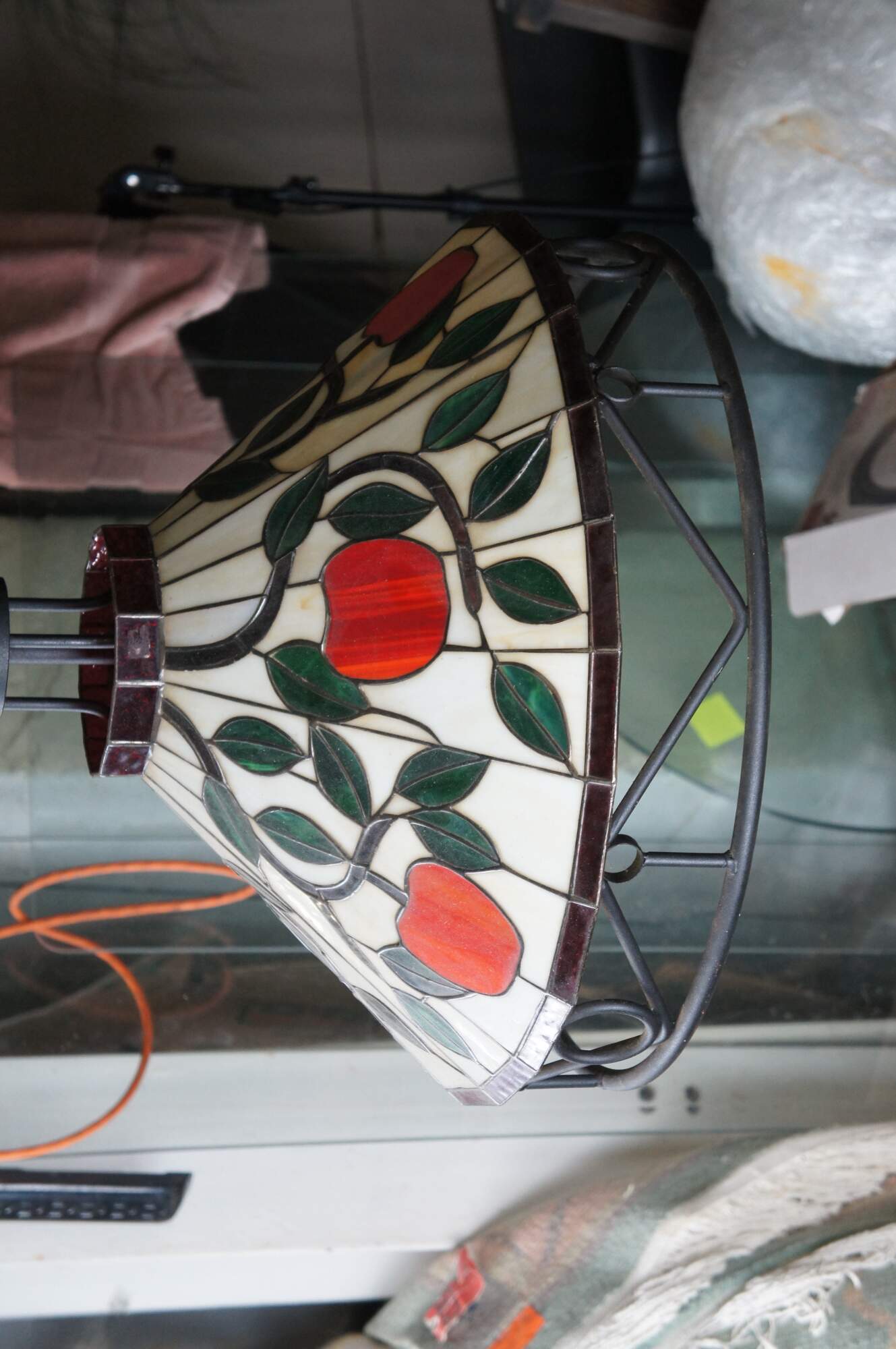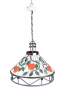 20th Century Tiffany Style Pendant Light / Chandelier. Made from iron with leaded stained glass panels featuring an apple and vine motif. Interior light is covered by a milk glass globe. The light hangs via a short chain with white pendant cap. Could be altered to use as a swag light. Circa 1970s