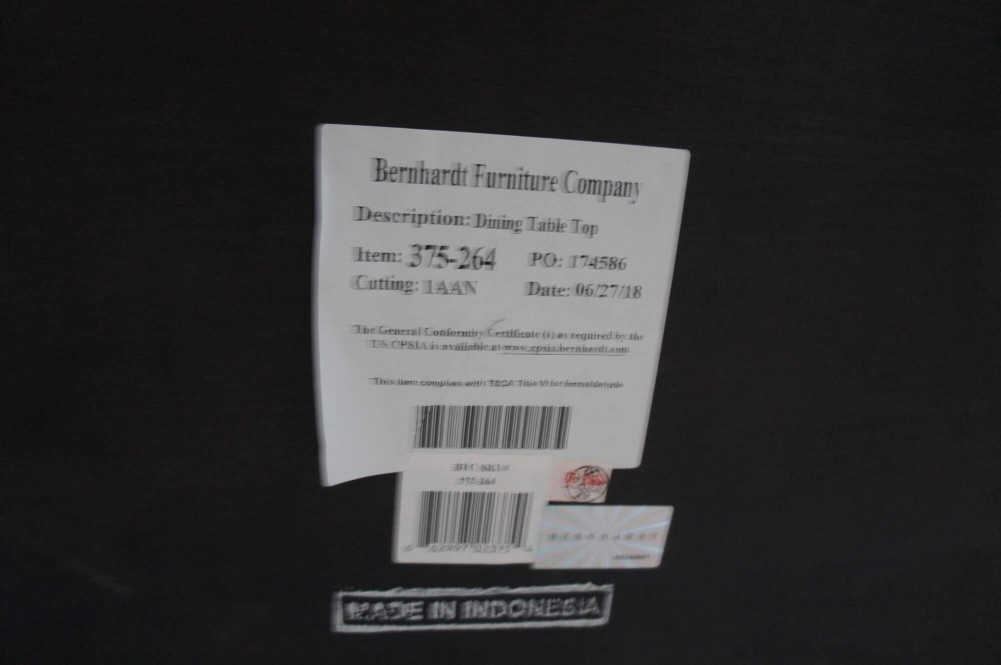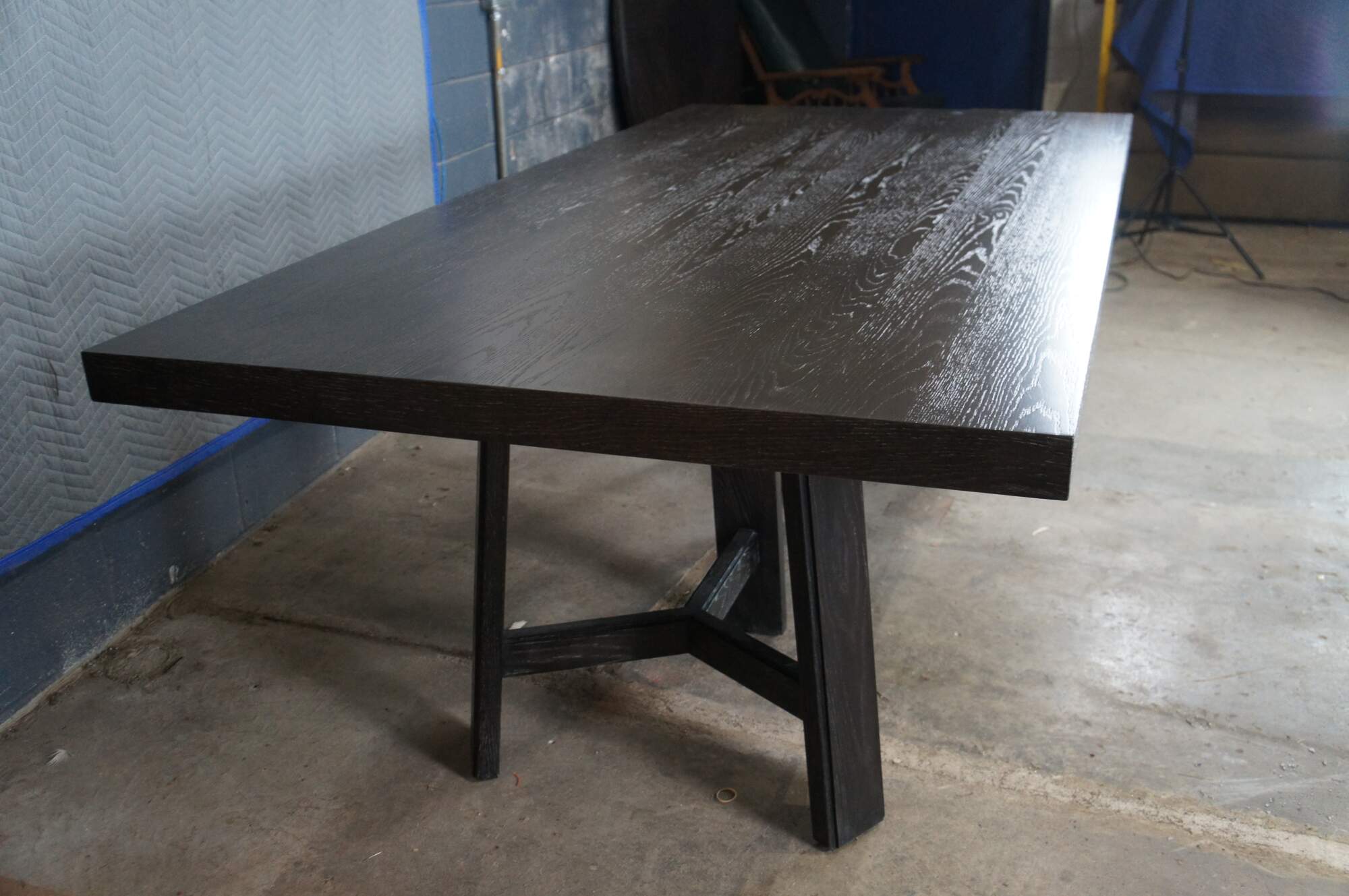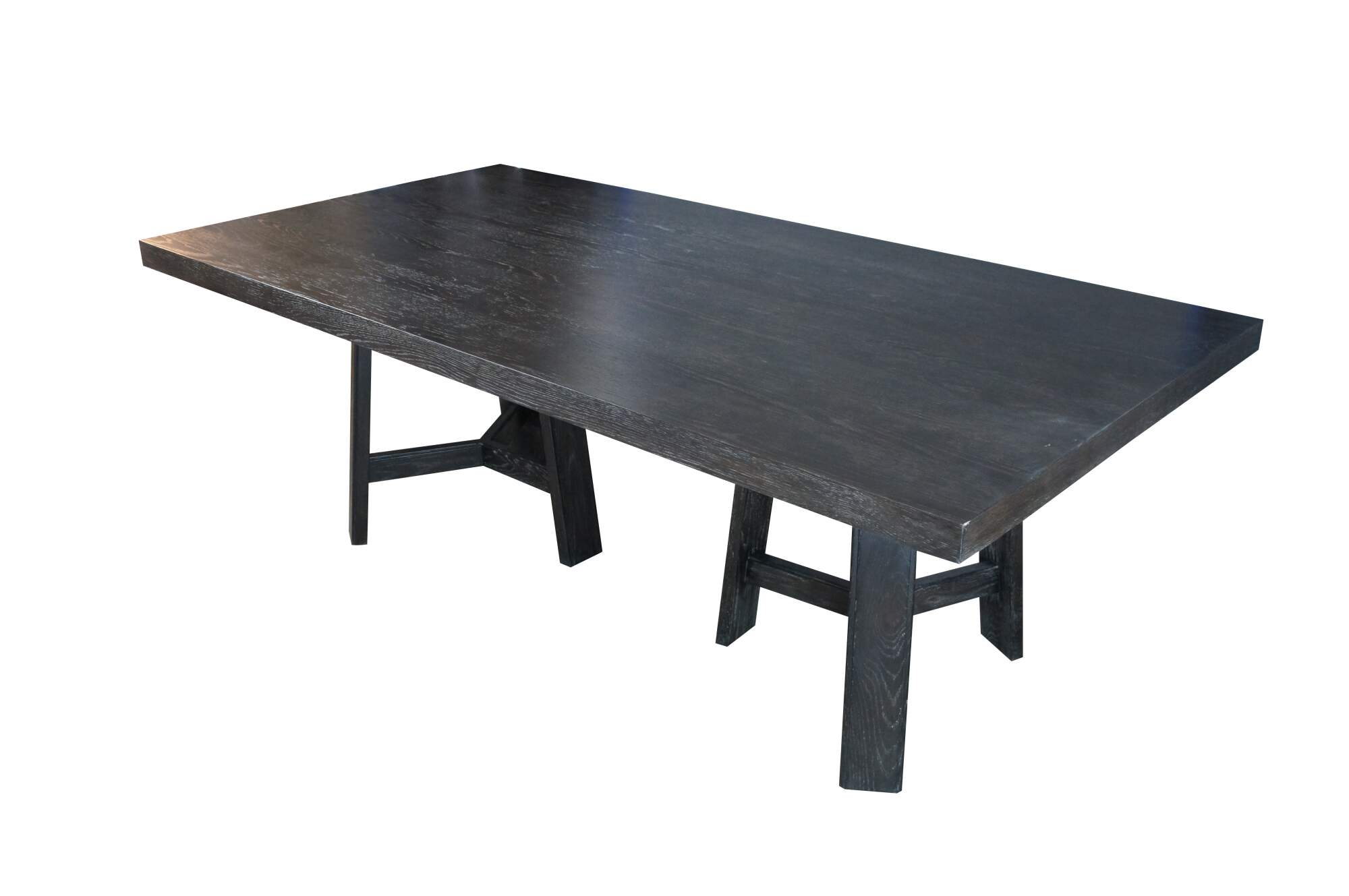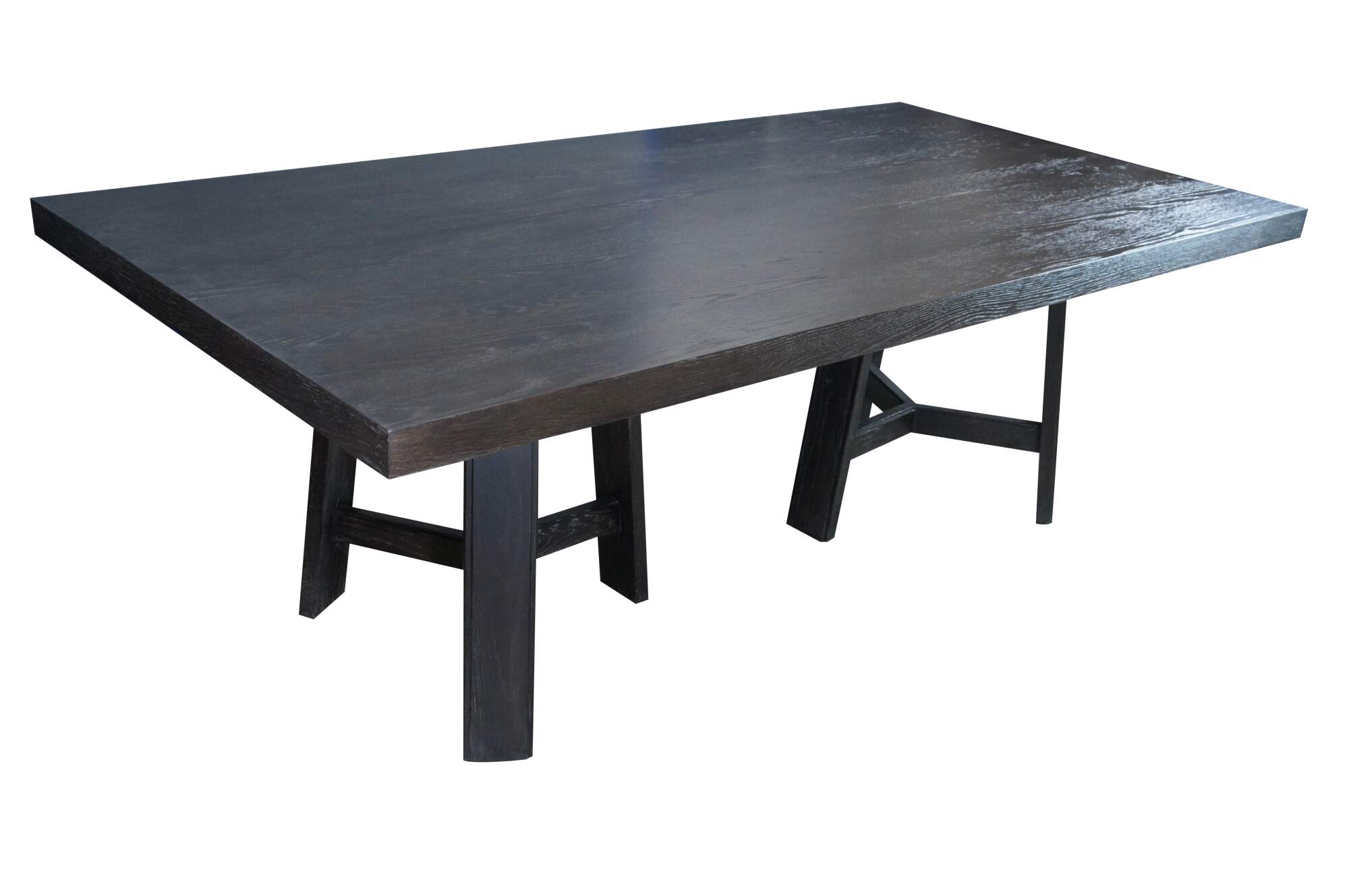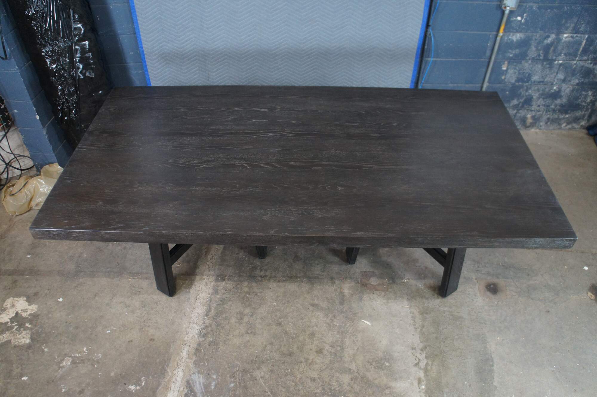 Bernhardt Colworth Rectangular Dining Table #375-264, Circa 2018. Features a rectangular form made from oak with double pedestal tripod bases. The table is designed in a rustic modern styling with a black truffle finish.