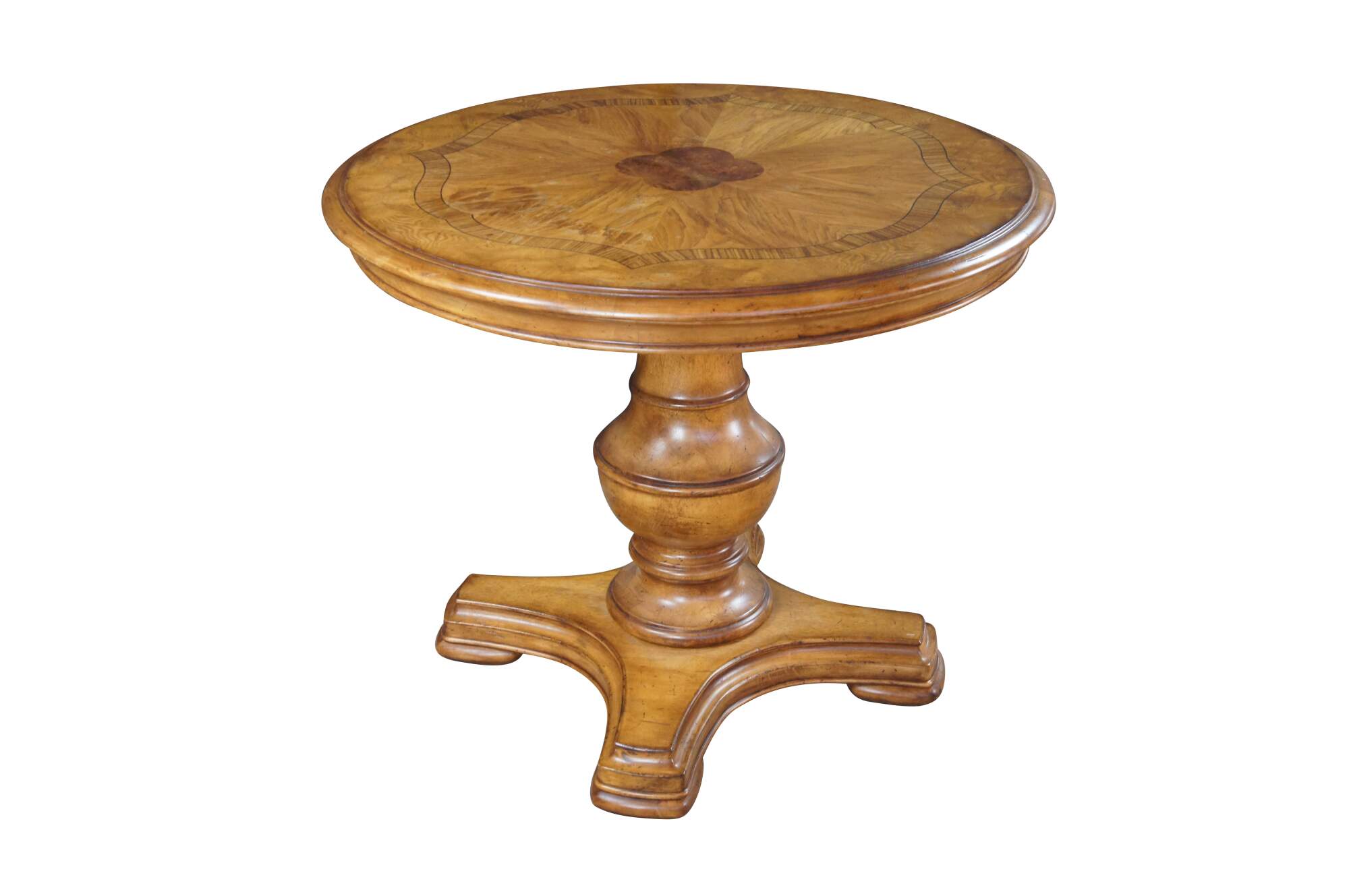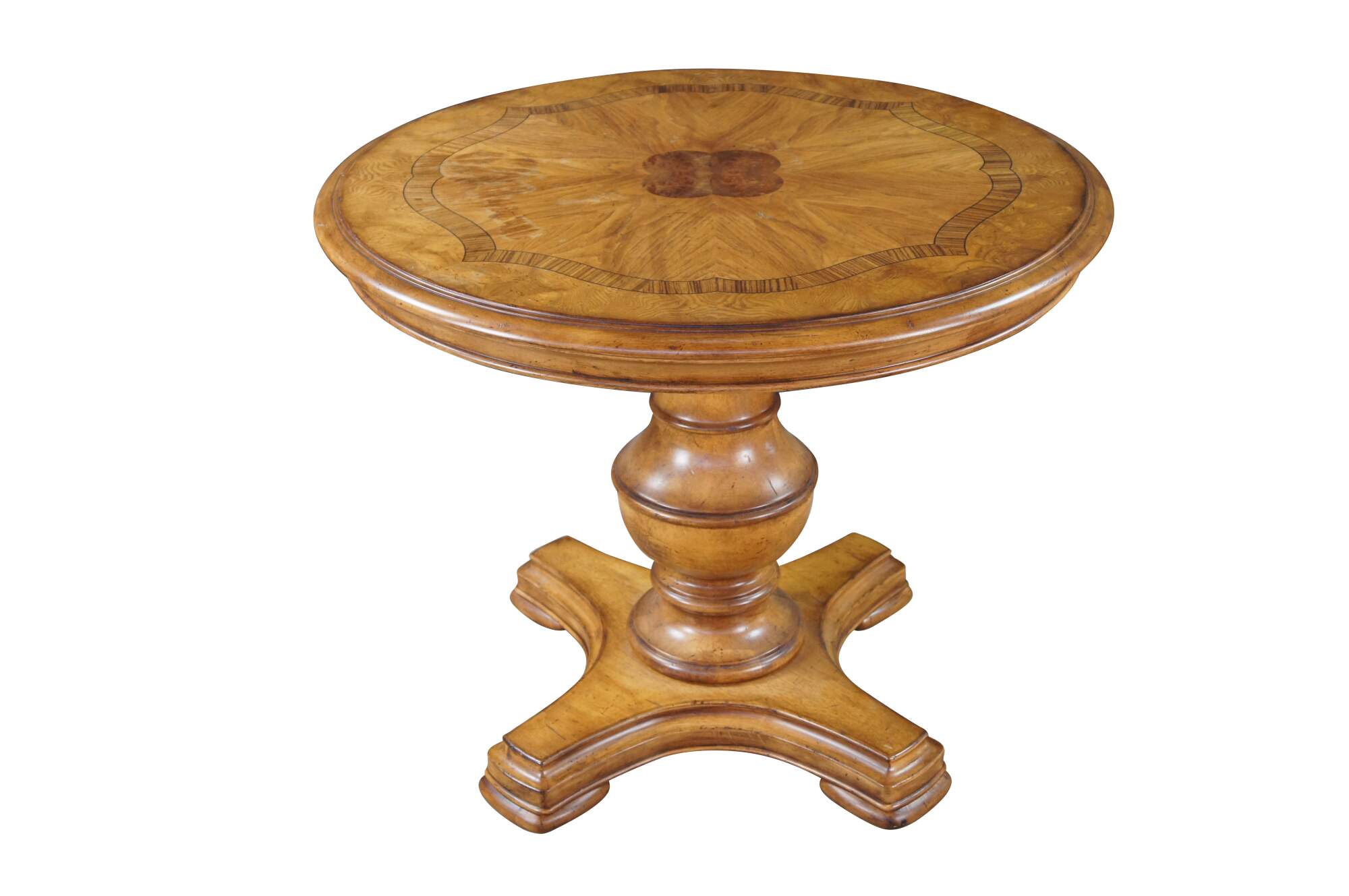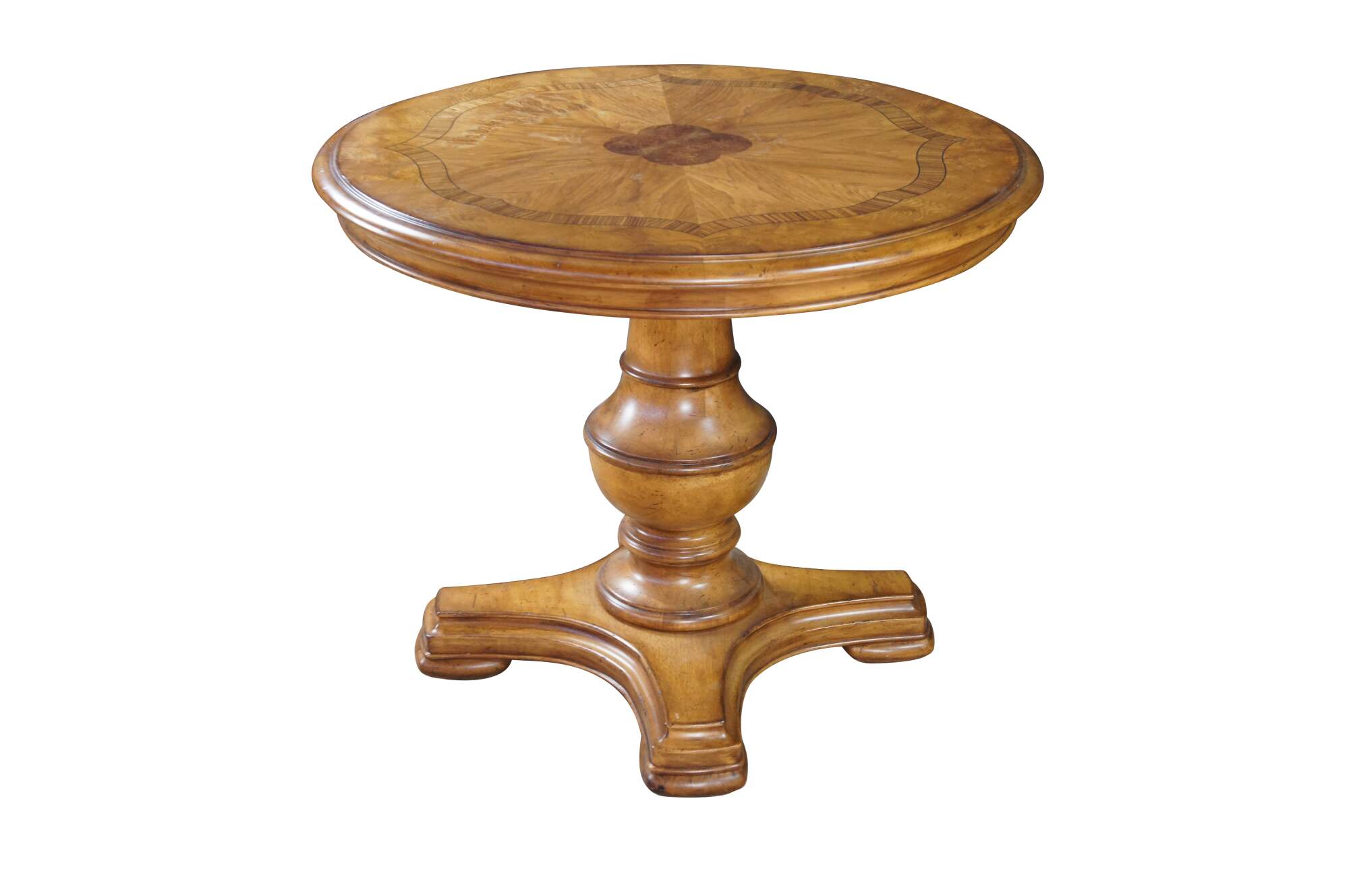 Vintage Thomasville center pedestal table featuring round form with inlaid Walnut veneers in a quatrefoil design. 43631-230