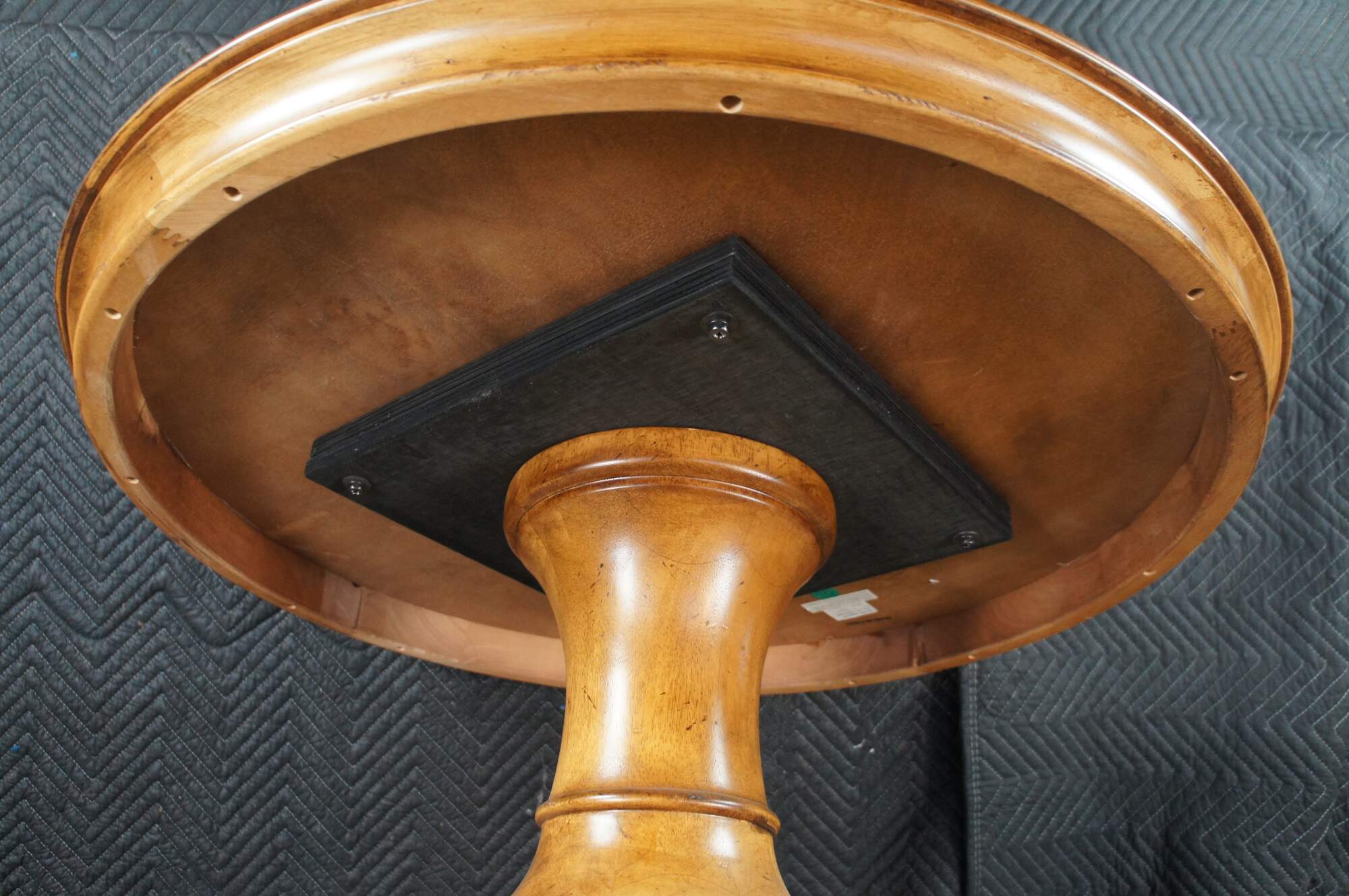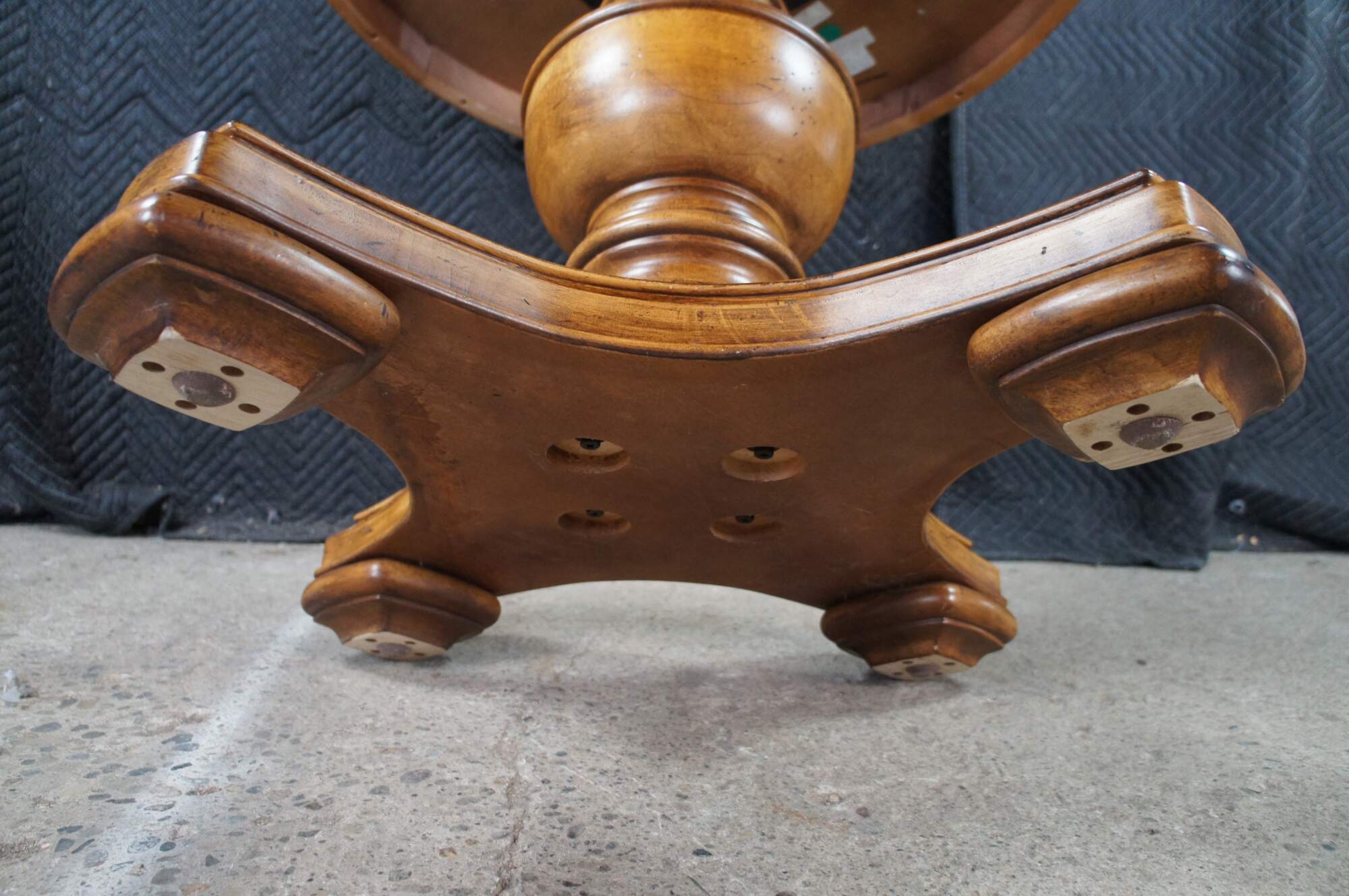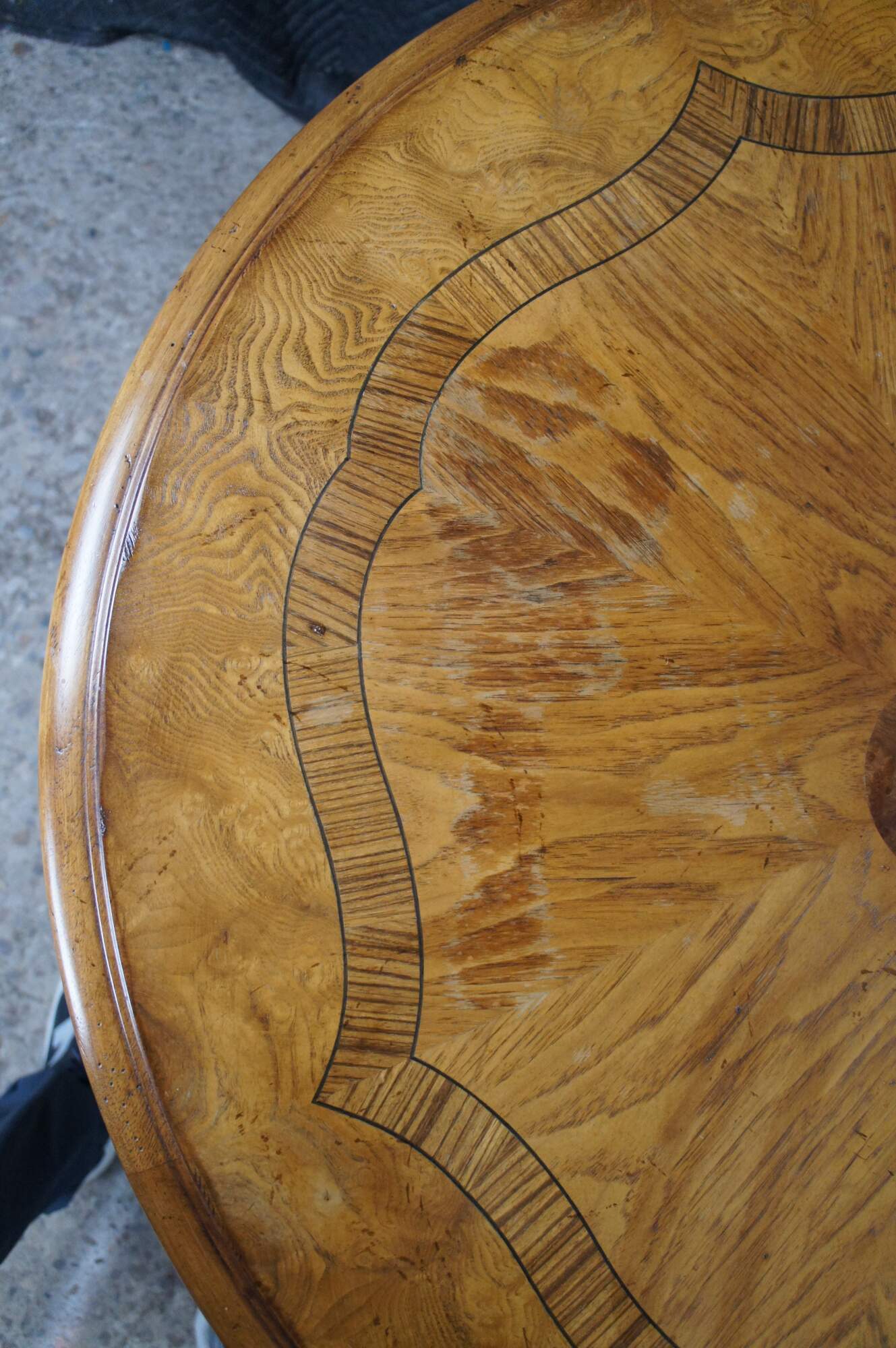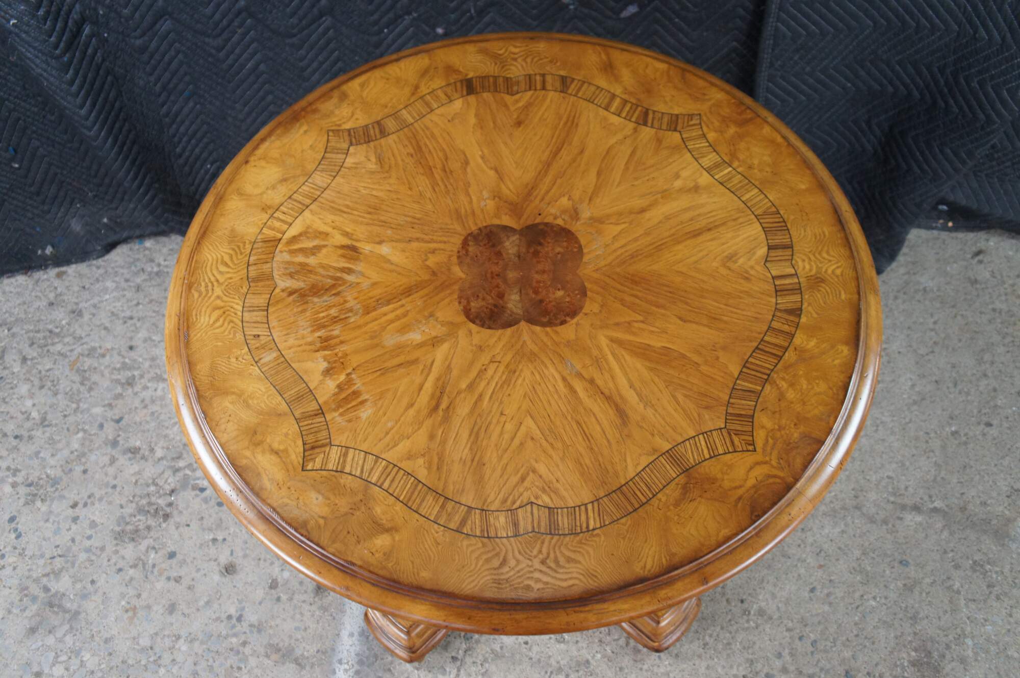 Vintage Thomasville center pedestal table featuring round form with inlaid Walnut veneers in a quatrefoil design. 43631-230