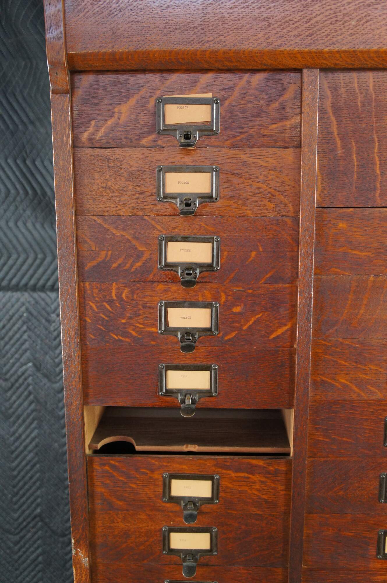 Antique Ohmer's administrative industrial apothecary office filing cabinet. Made of quartersawn oak featuring 48 slide up drawers for storage of index cards, letters and documents. The sides are paneled and the top has egg and dart molding. Previous users of this cabinet have labels reading Police, Ammo, Maps, and Dates. Manufactured by The M. Ohmers Sons Co., Dayton Ohio. Circa 1920s.