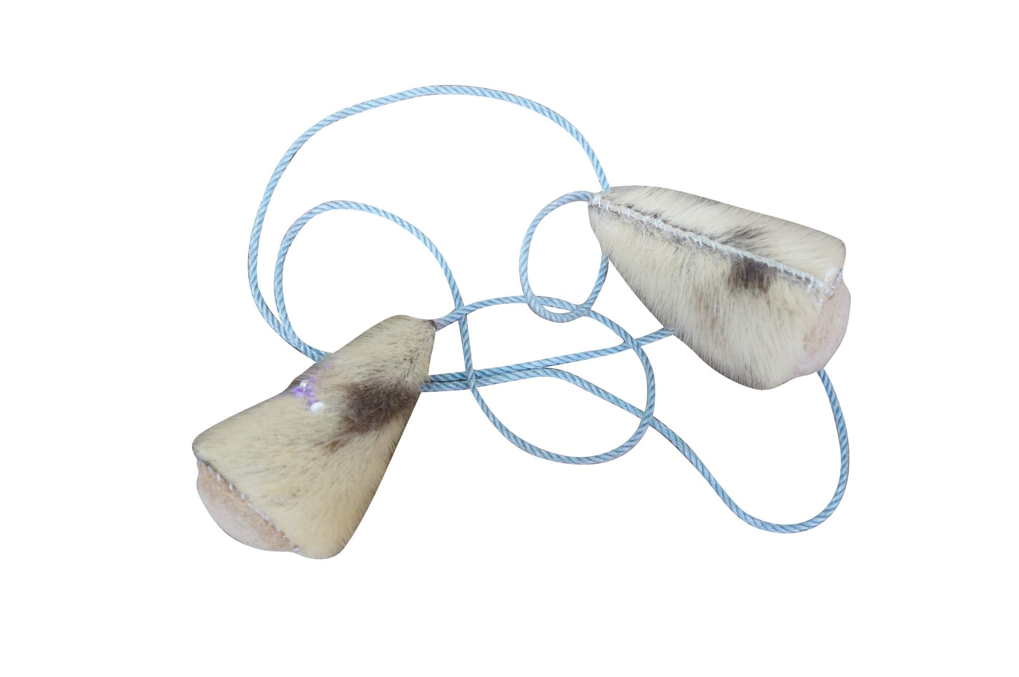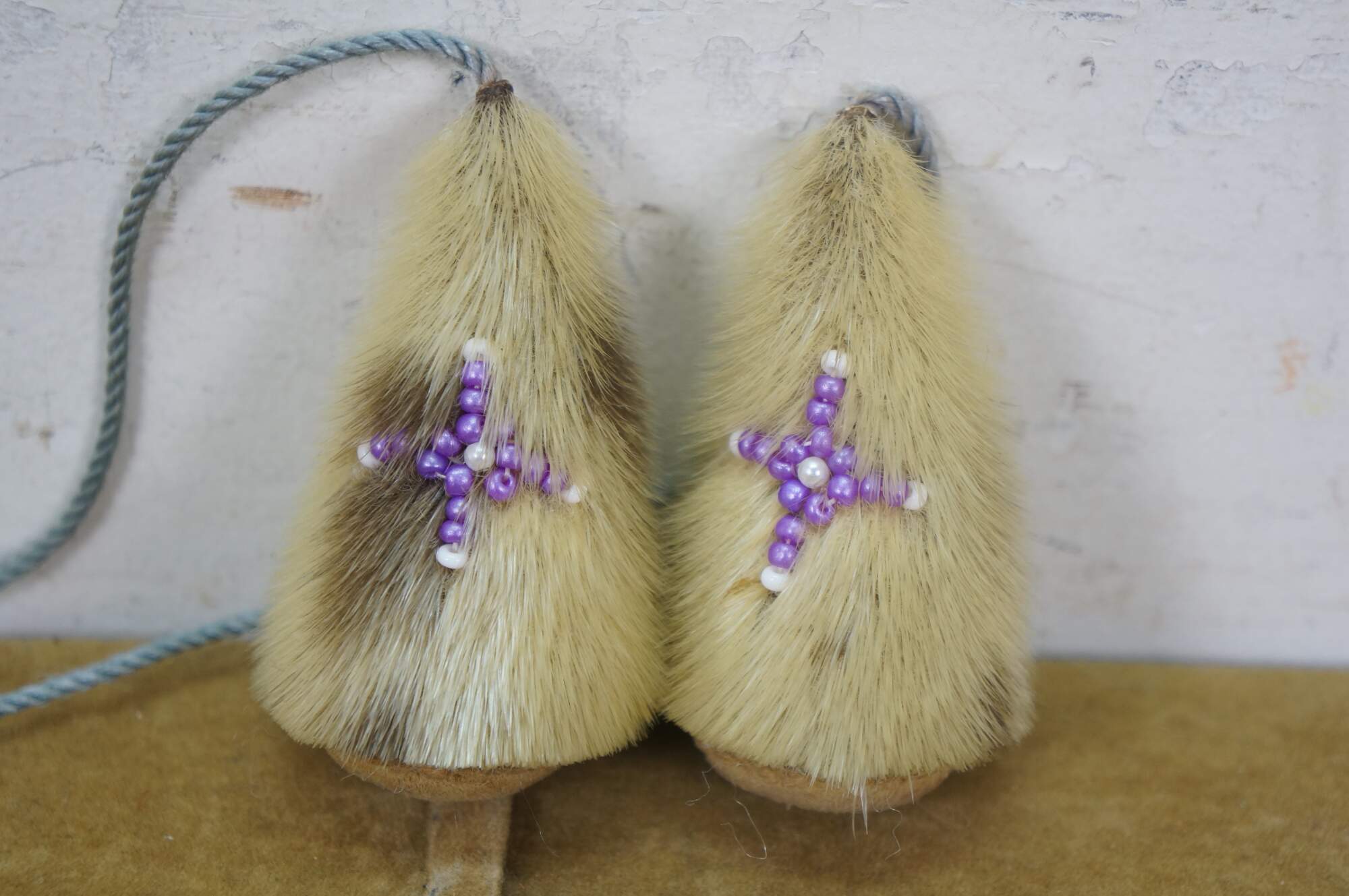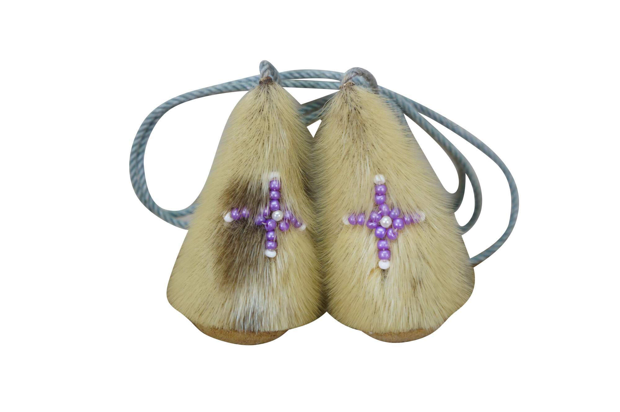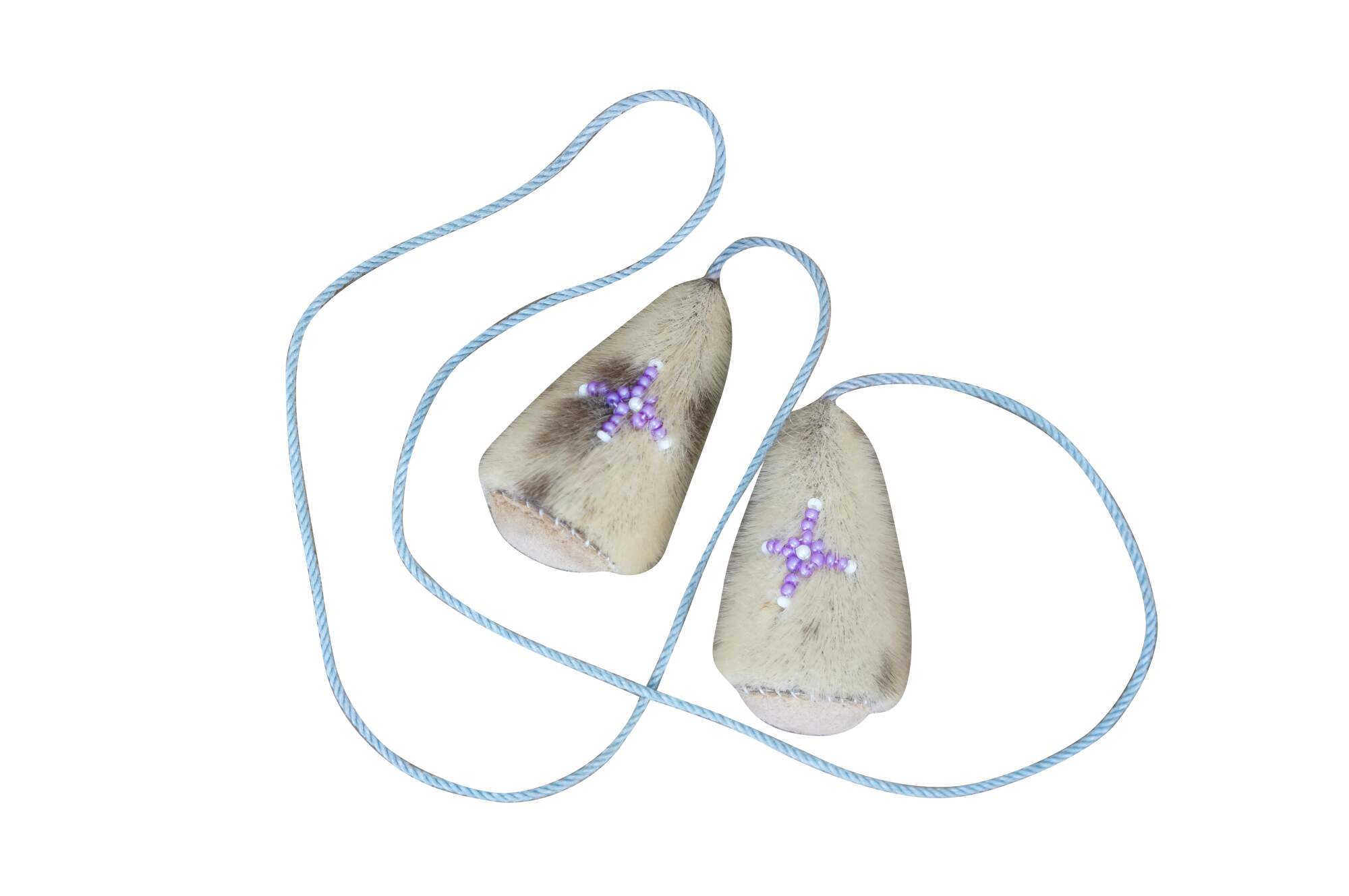Vintage 20th century native Alaskan / Inuit yo-yo toy - two stuffed cone shaped baubles made of seal fur and leather, with beaded purple and white crosses on one side, strung on a pale blue cord.