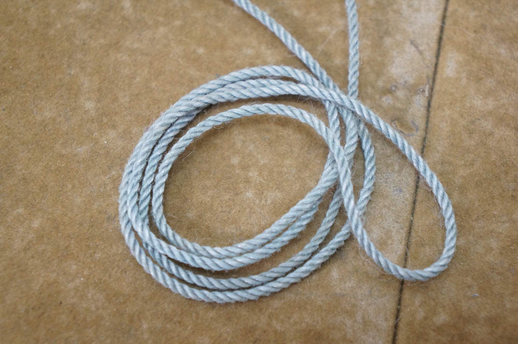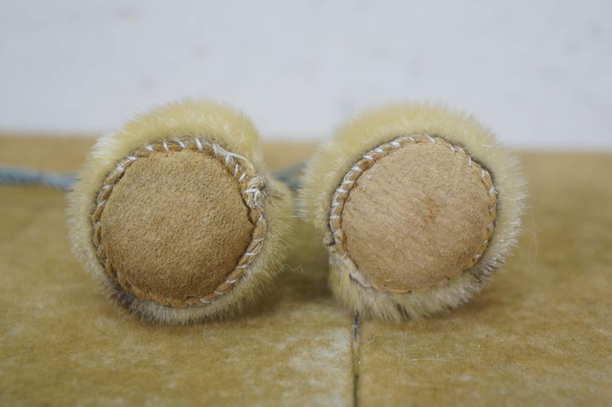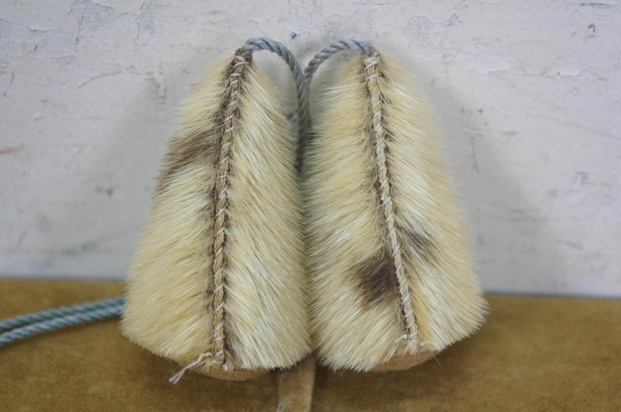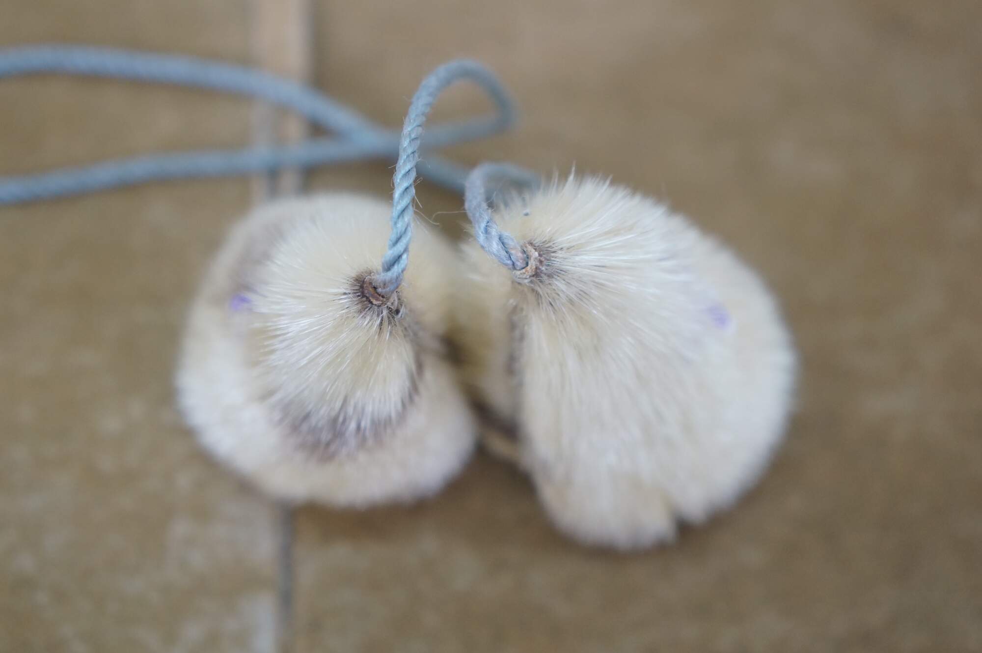 Vintage 20th century native Alaskan / Inuit yo-yo toy - two stuffed cone shaped baubles made of seal fur and leather, with beaded purple and white crosses on one side, strung on a pale blue cord.