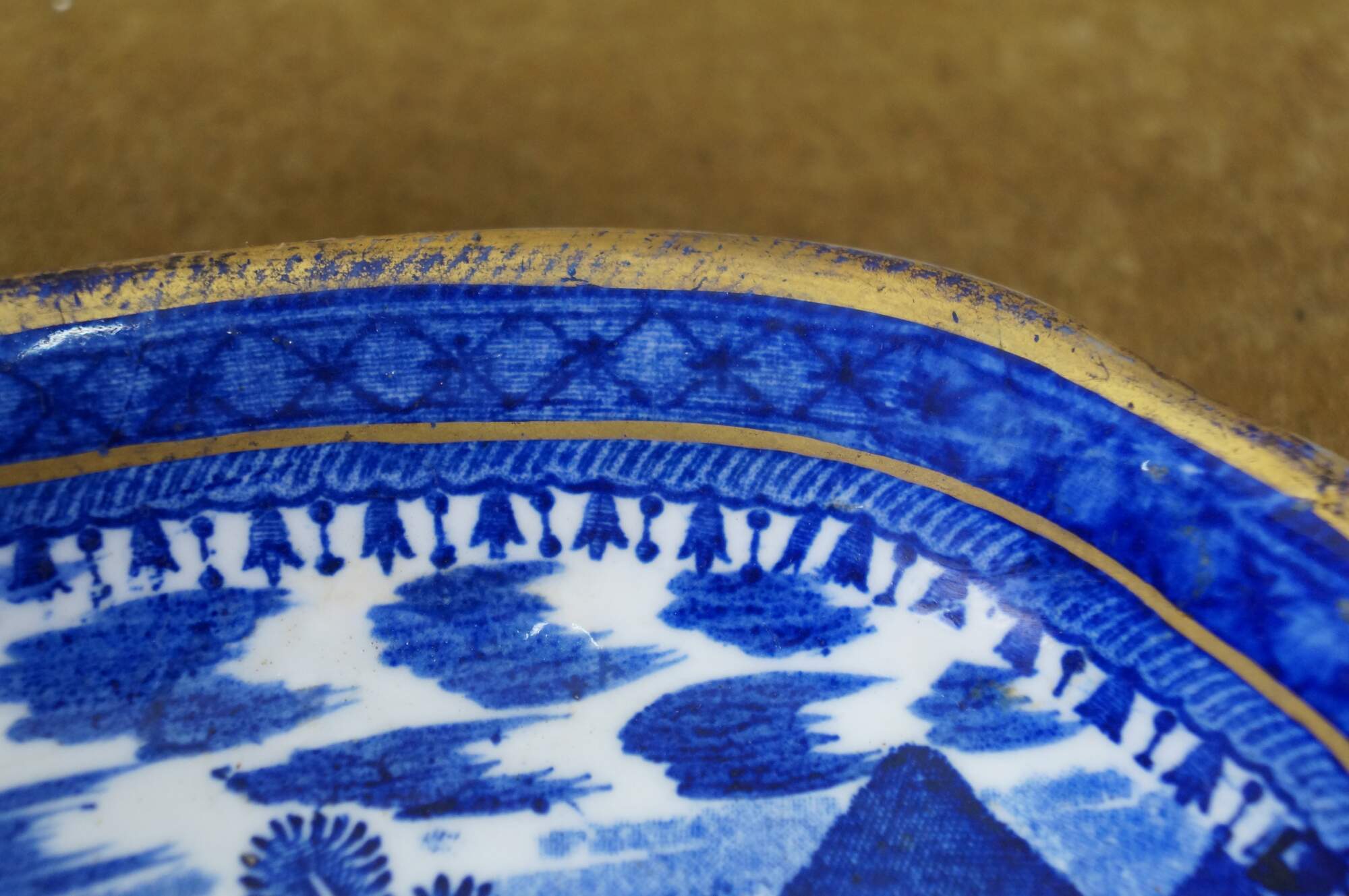 Small late 19th to early 20th century Chinese Export porcelain platter / plate - rectangular in shape with rounded corners and gilt detail at the edge, decorated with a Blue Willow style lands and water scape with pagoda roofs, sail boat, and bridge.