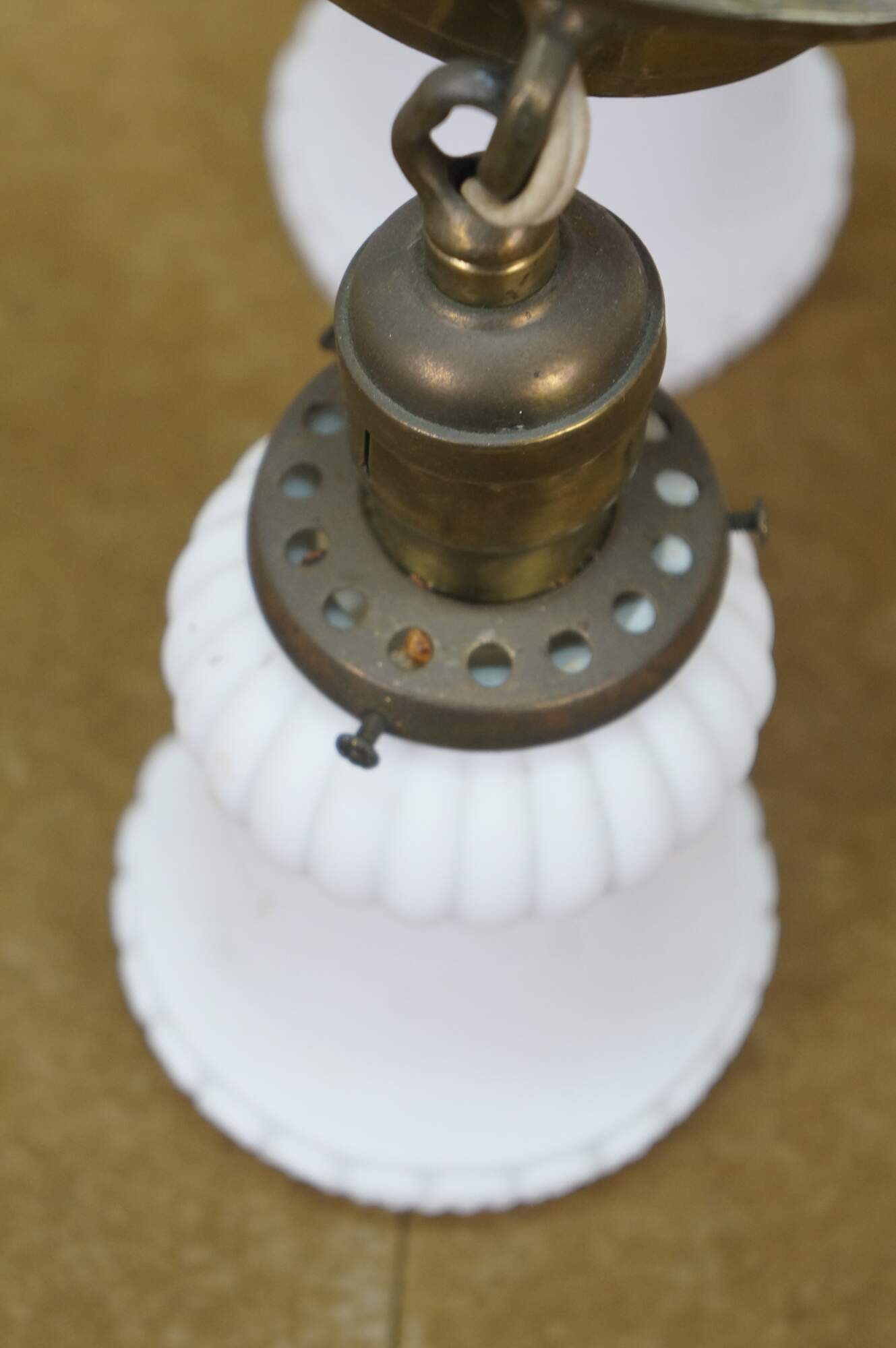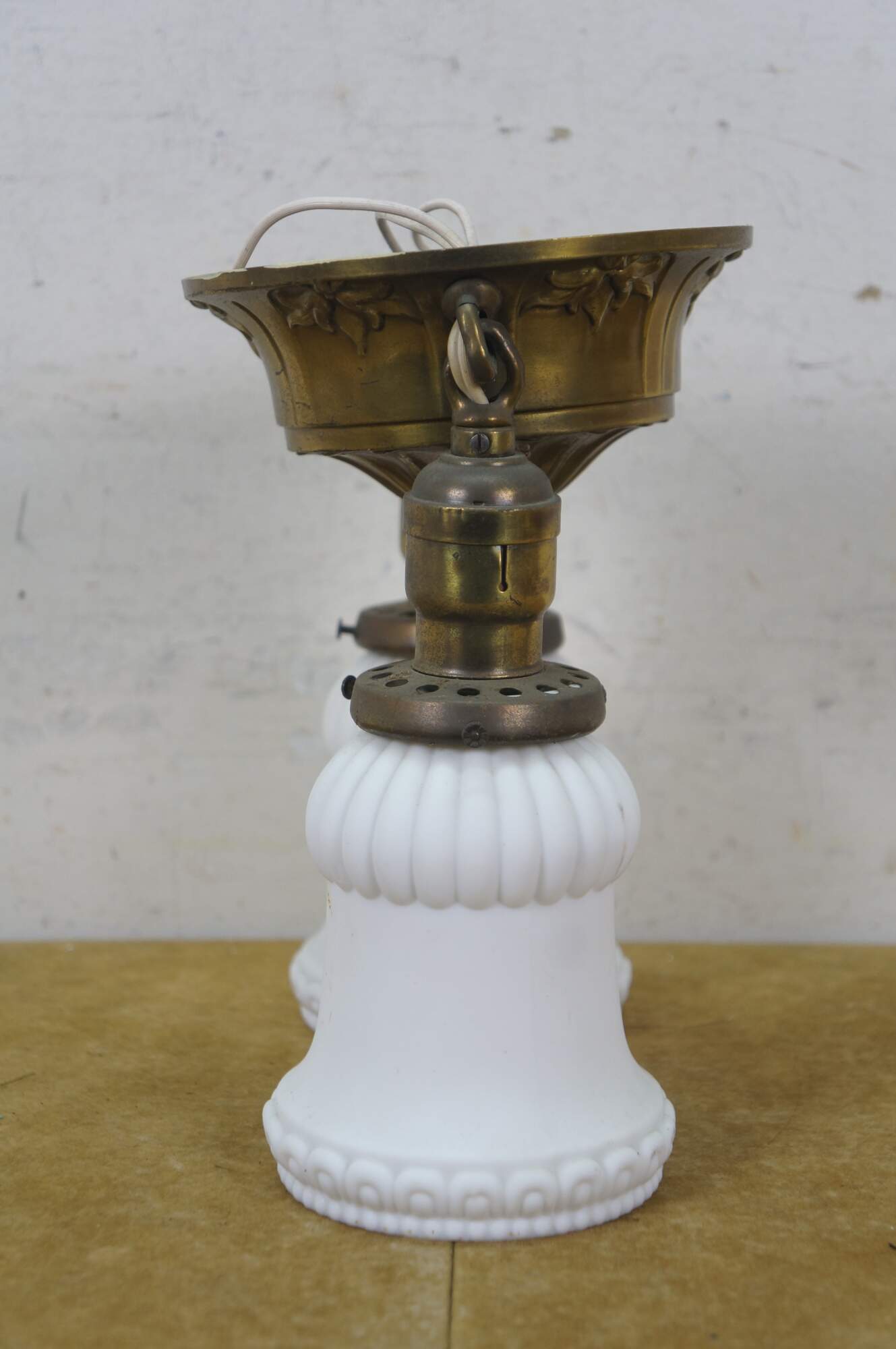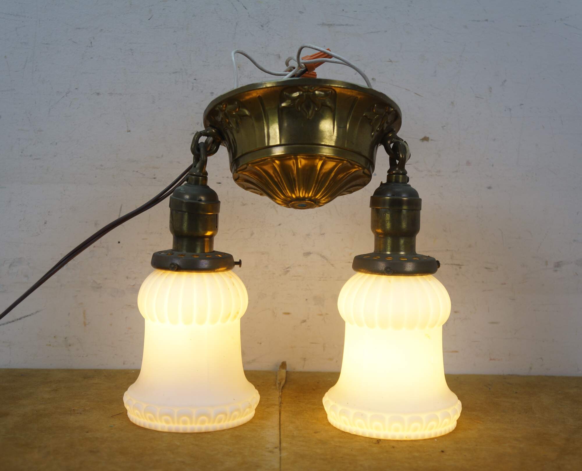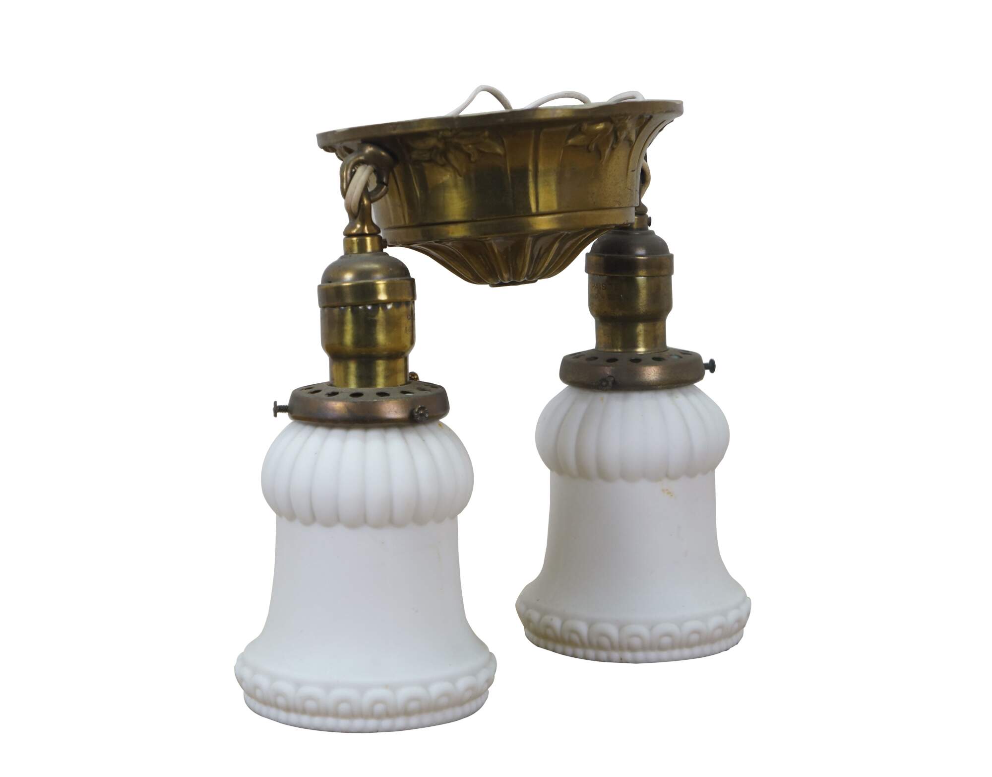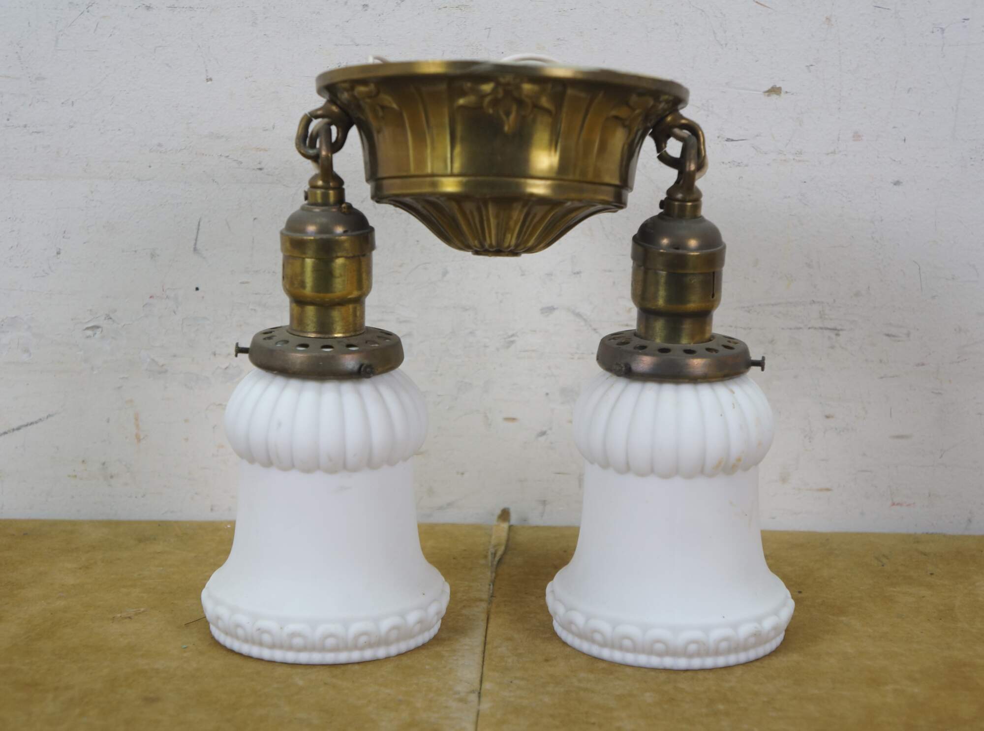 Early 20th century shower light - brass flush / ceiling mount medallion with umbrella shape sunburst and lily details supporting a pair of dangling Paiste light bulb sockets with matte milk glass shades / globes. Hardwired.