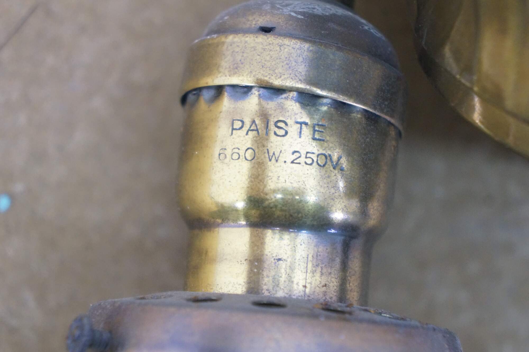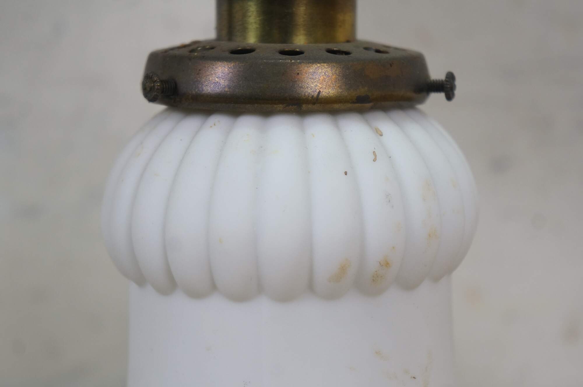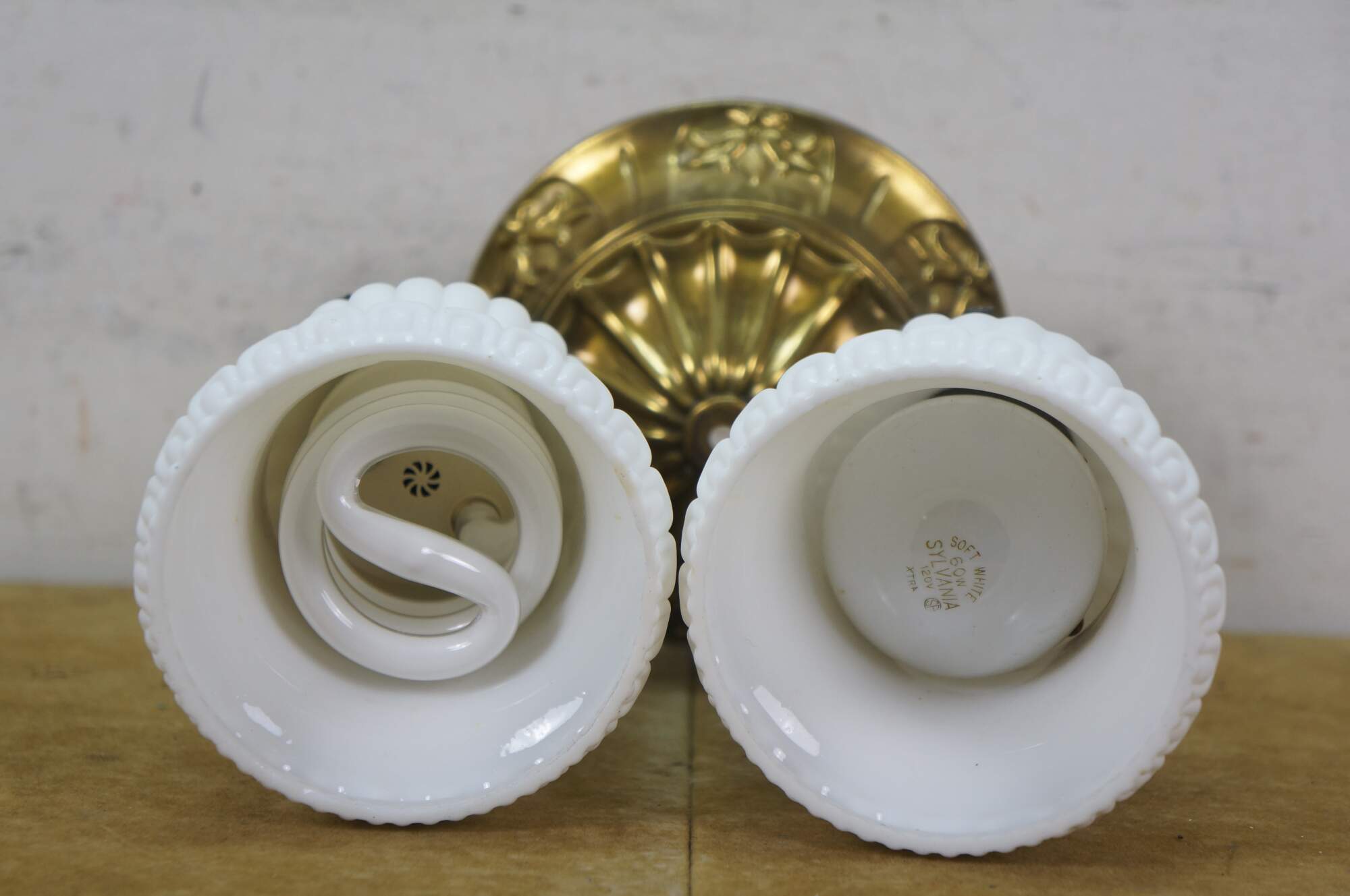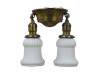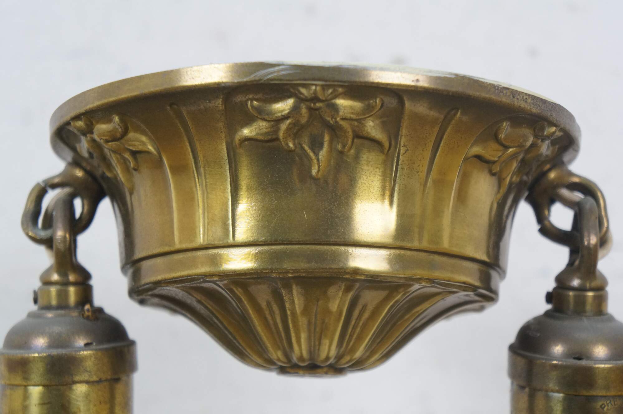 Early 20th century shower light - brass flush / ceiling mount medallion with umbrella shape sunburst and lily details supporting a pair of dangling Paiste light bulb sockets with matte milk glass shades / globes. Hardwired.