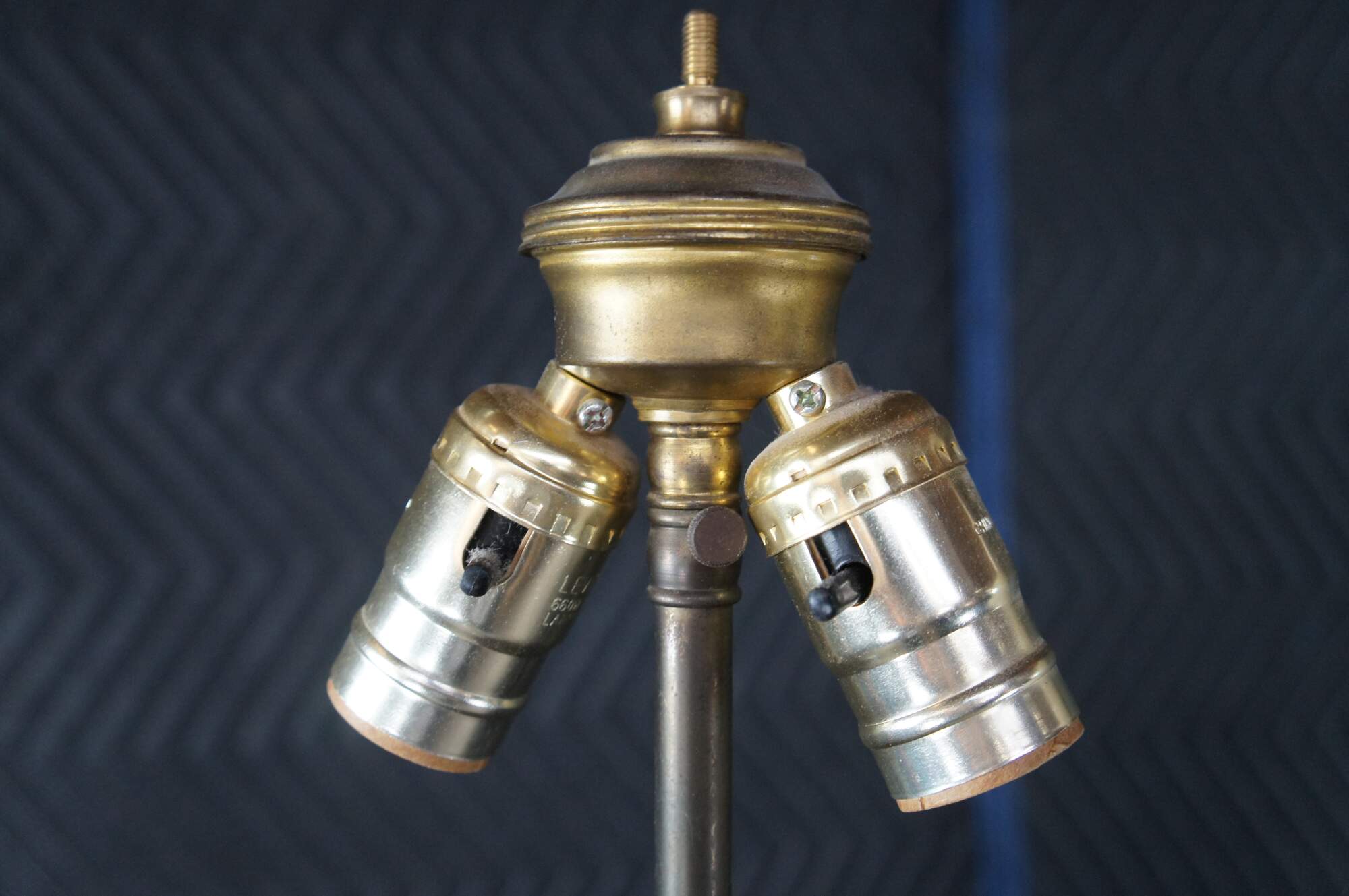 Good Condition; wear from use and age. Lifting to one of the brass mounts. Marking and edge wear. Tears to the shade lining.