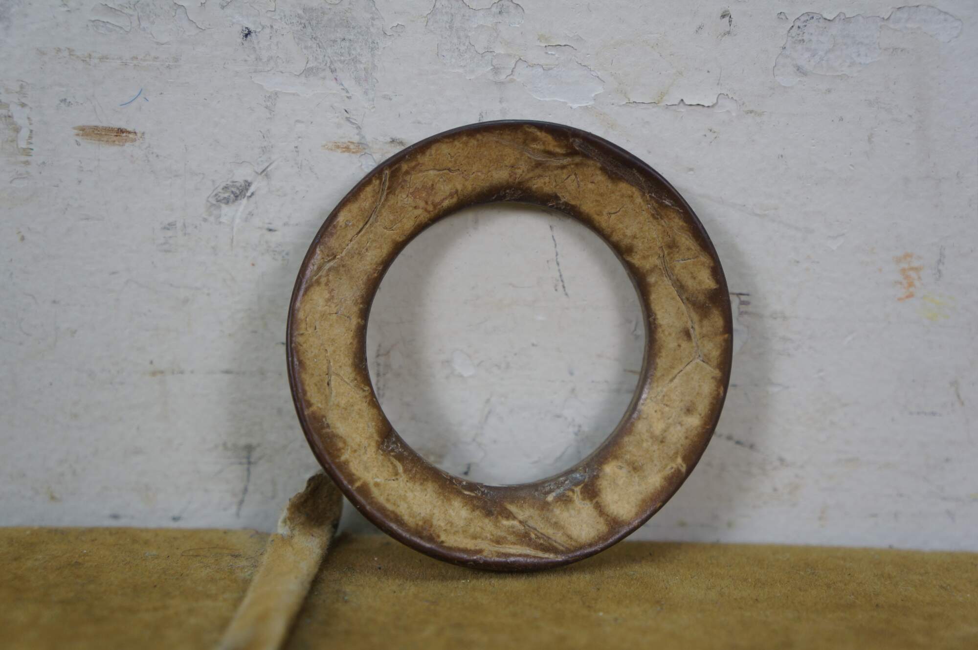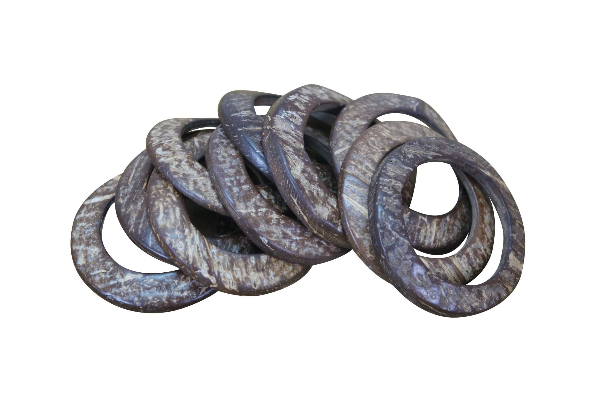 Set of 10 late 20th century coconut shell napkin rings / ring pendants for use as decoration on macrame / crochet bags and other craft projects.