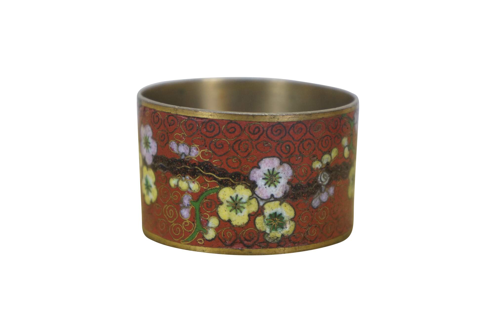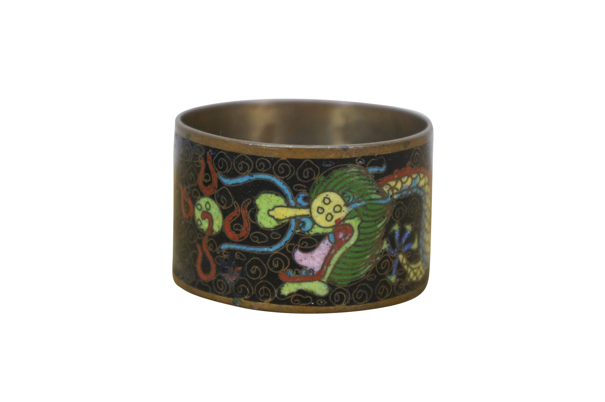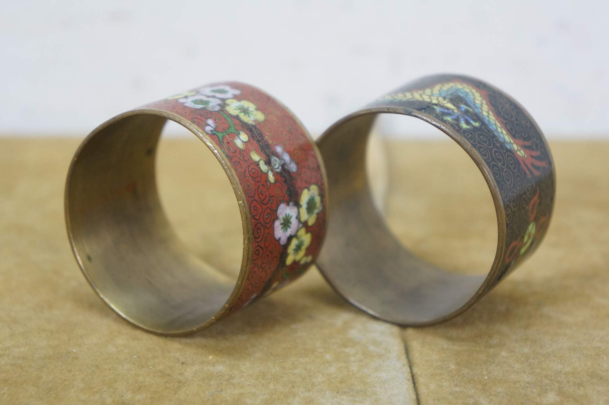 Pair of mid 20th century Chinese cloisonne enamel on brass napkin rings. One red with branches of cherry blossoms. The other black with a multicolored dragon.