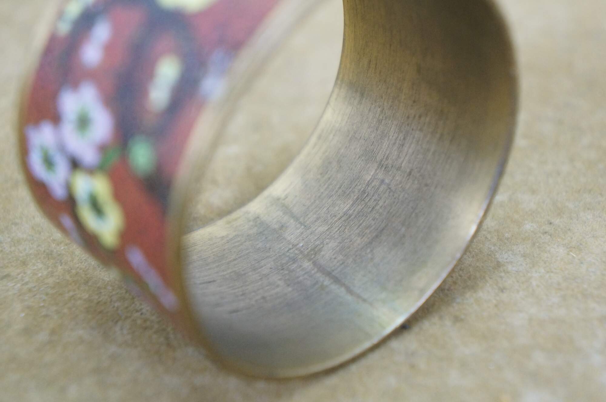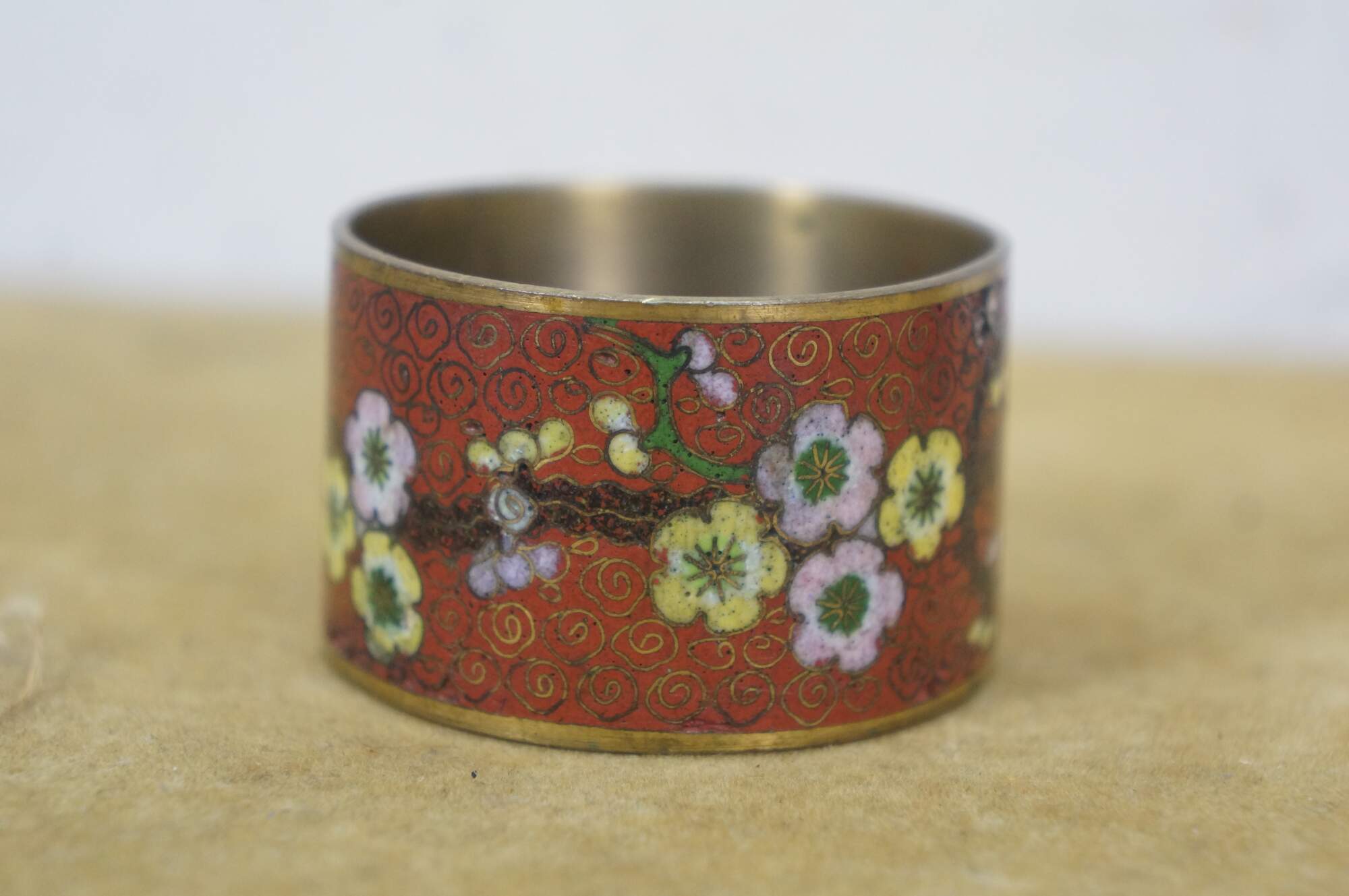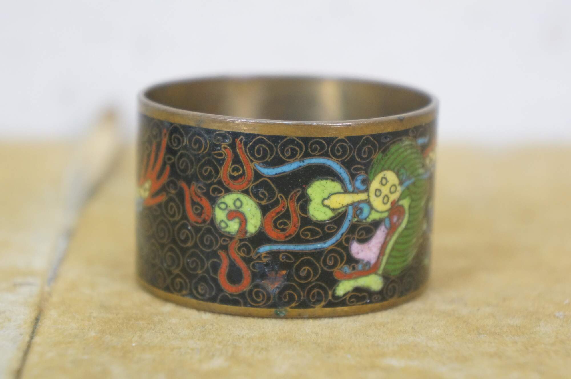 Pair of mid 20th century Chinese cloisonne enamel on brass napkin rings. One red with branches of cherry blossoms. The other black with a multicolored dragon.