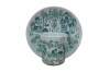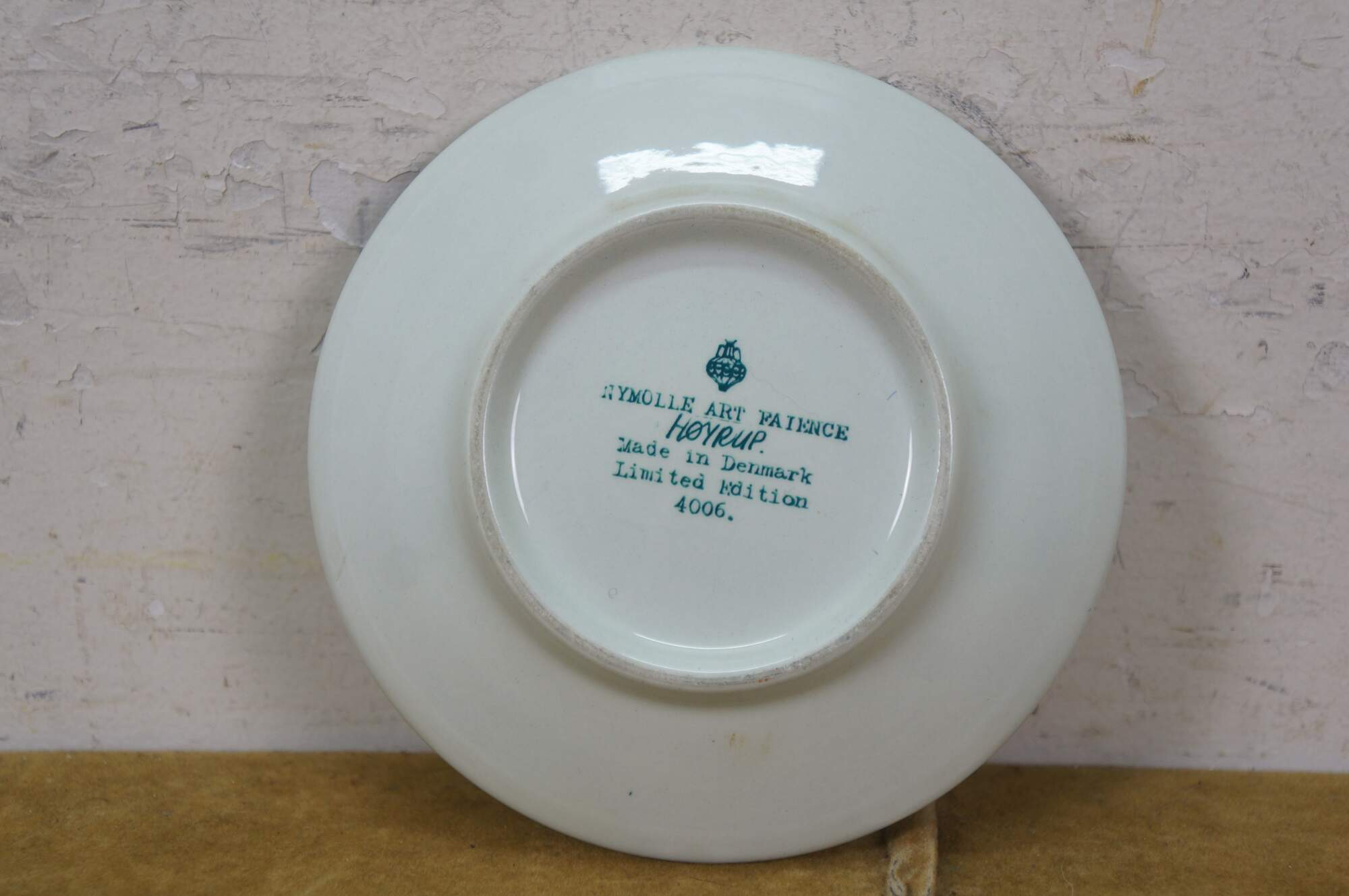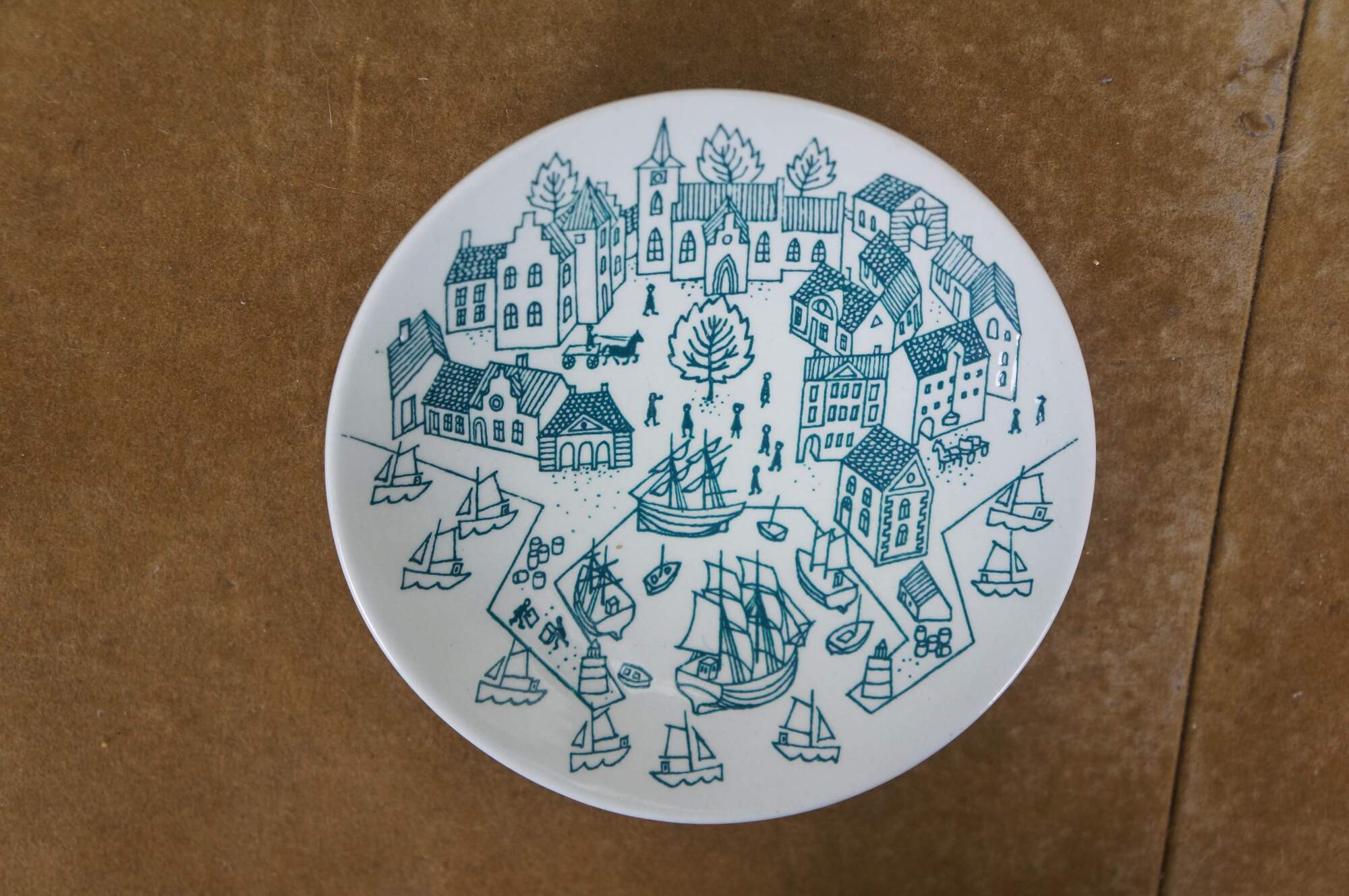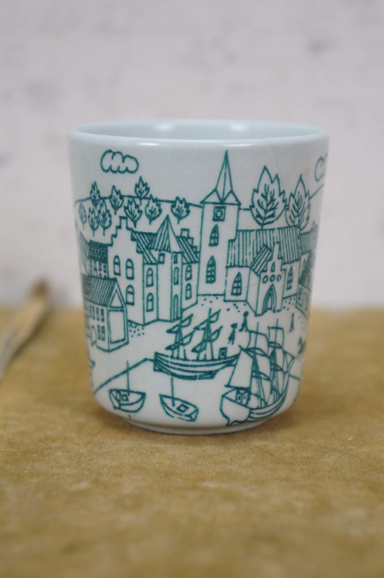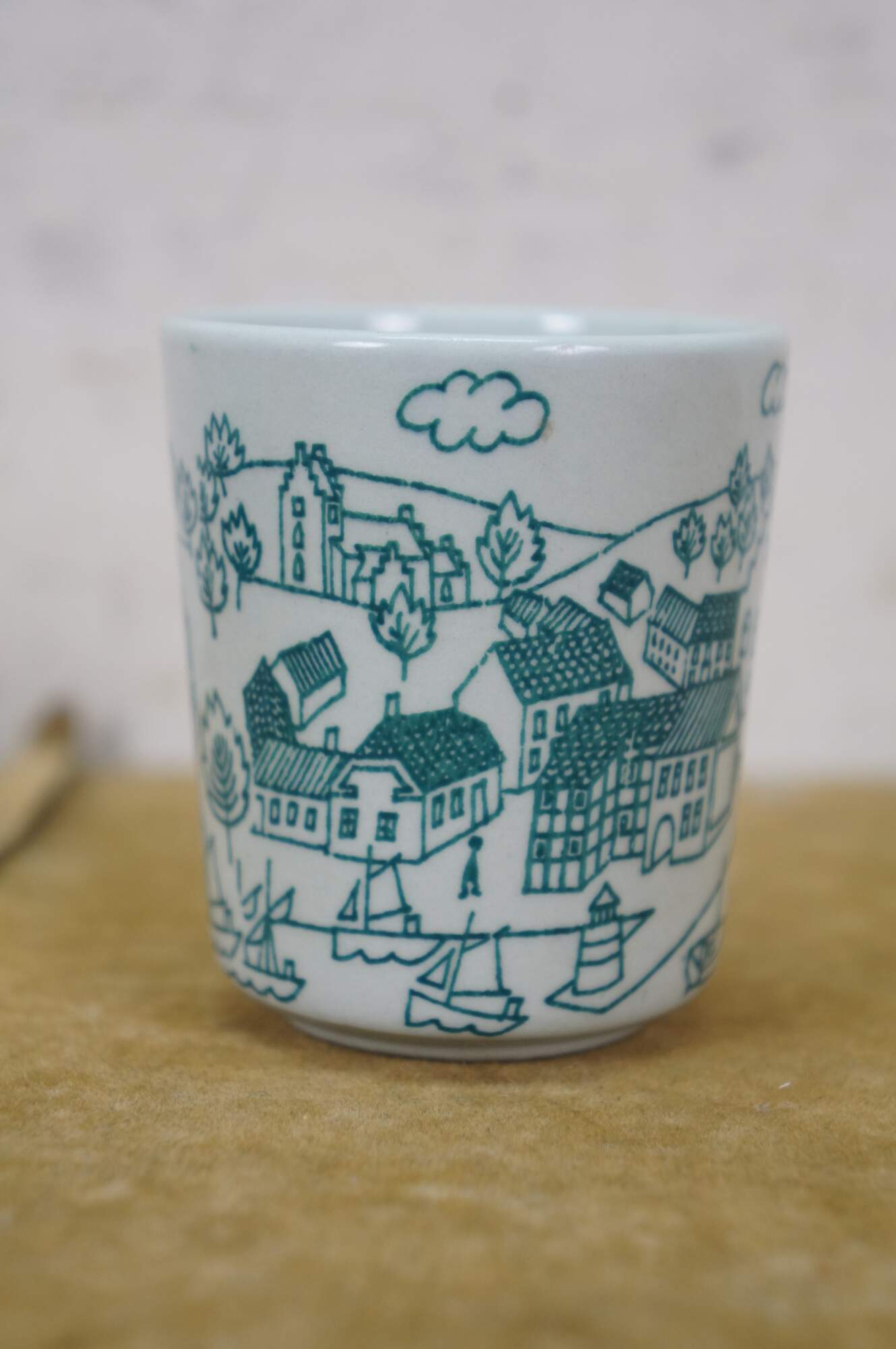 Mid 20th century Nymolle Denmark porcelain demitasse cup and saucer with dark teal green scene by Paul Hoyrup depicting a village with harbor filled with boats. Made in Denmark. Limited Edition 4006.