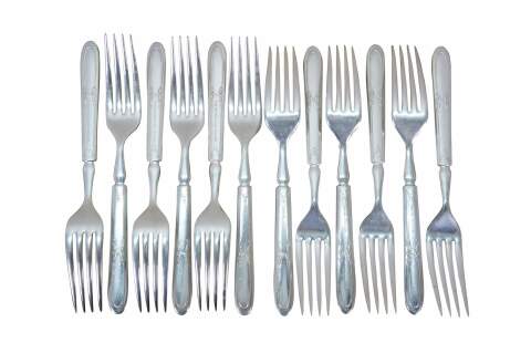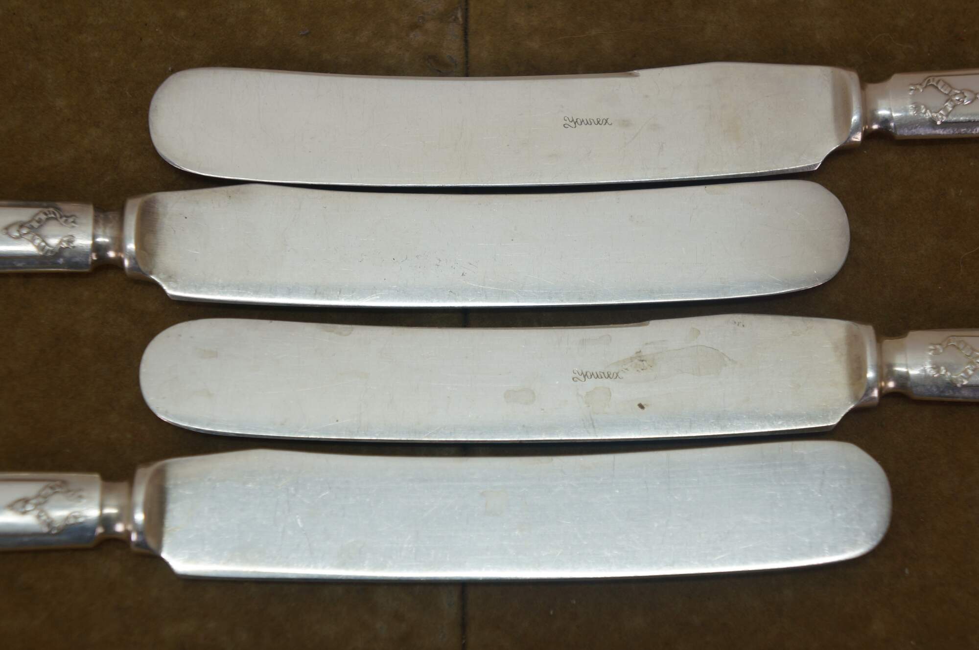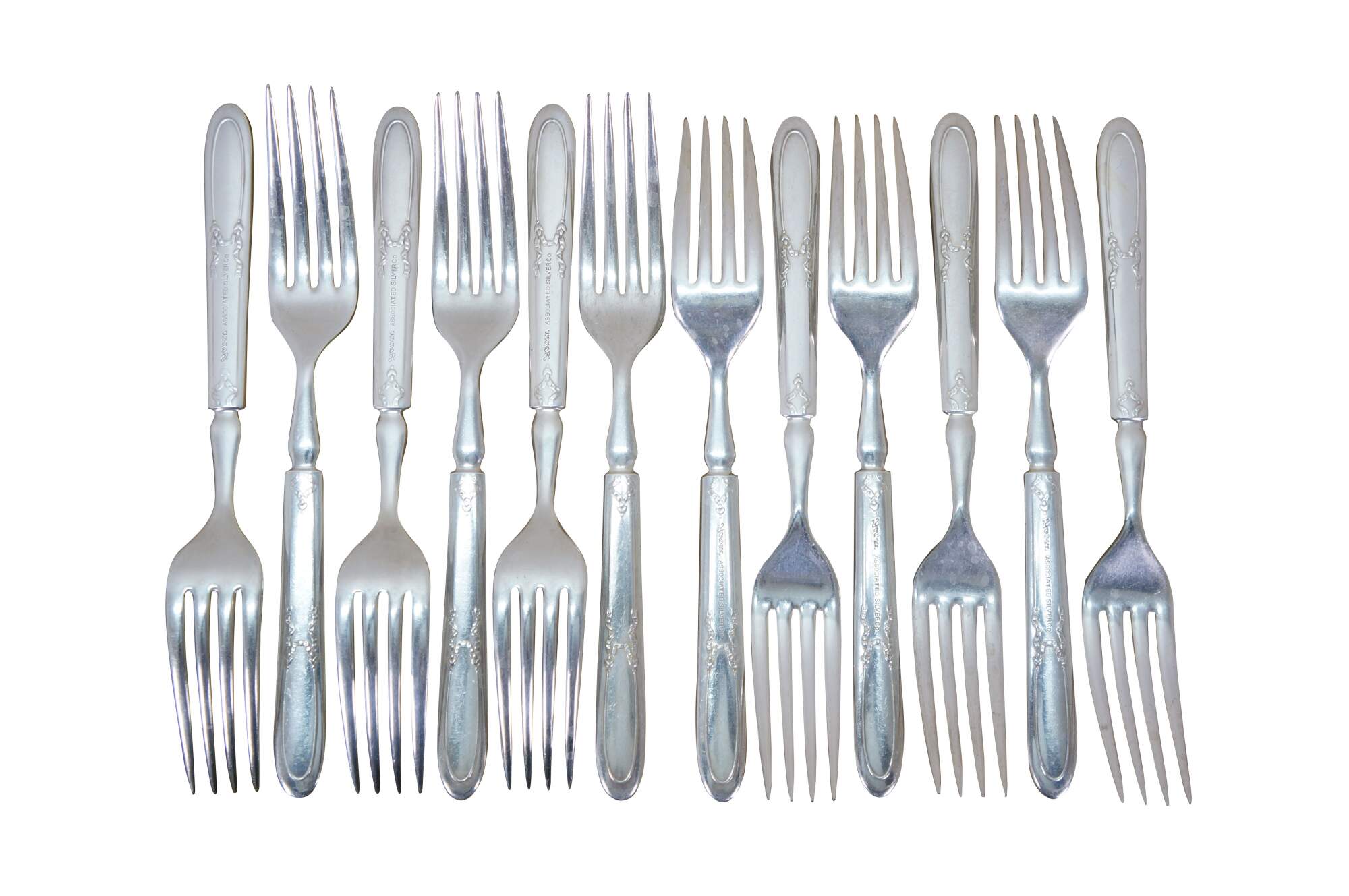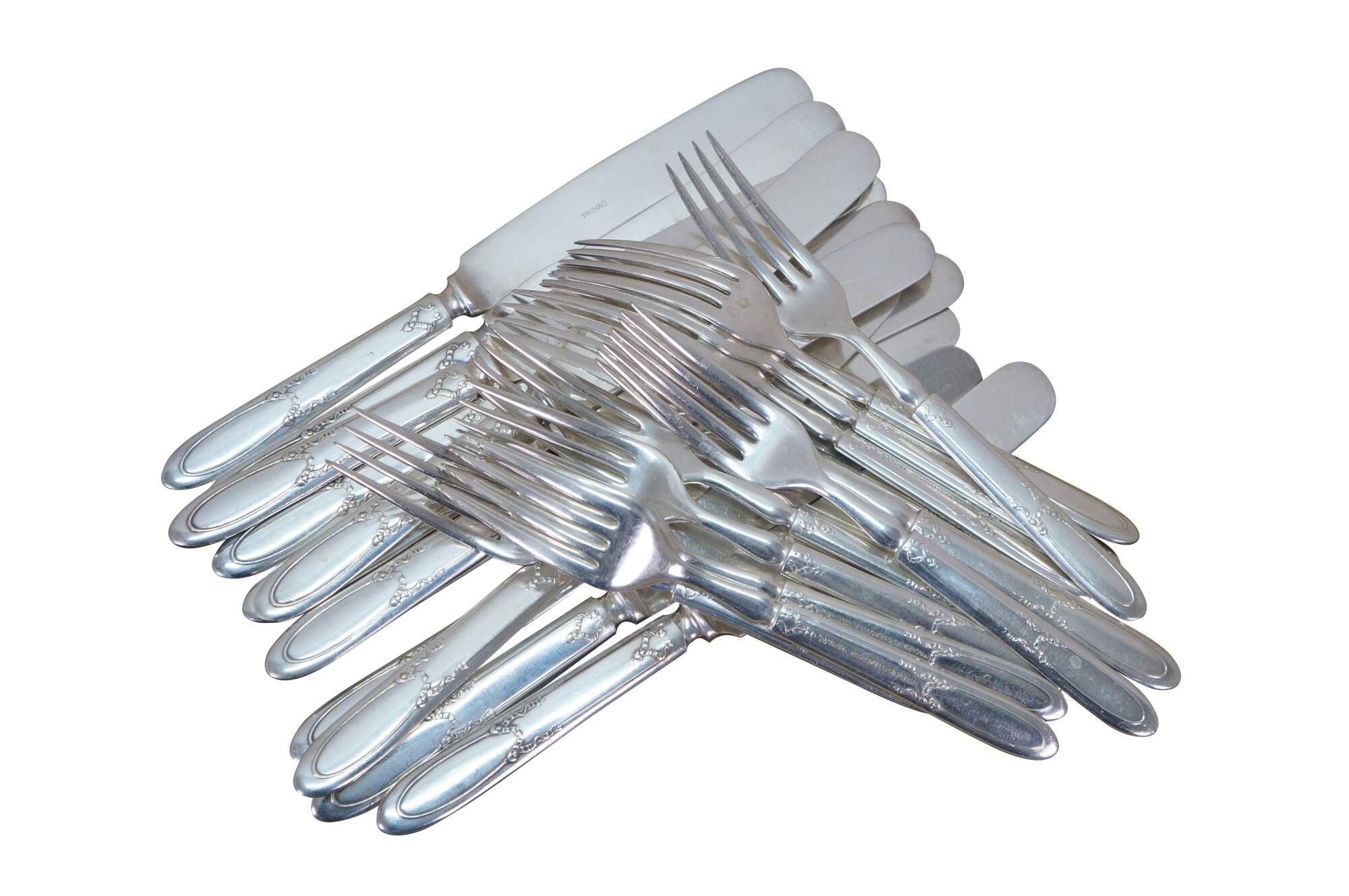 Early 20th century set of 24 Yourex table knives and dinner forks in the Panama pattern by the Associated Silver Company. Design features rounded ends, bell shaped drooping flowers and ribbon swags. Service for 12.