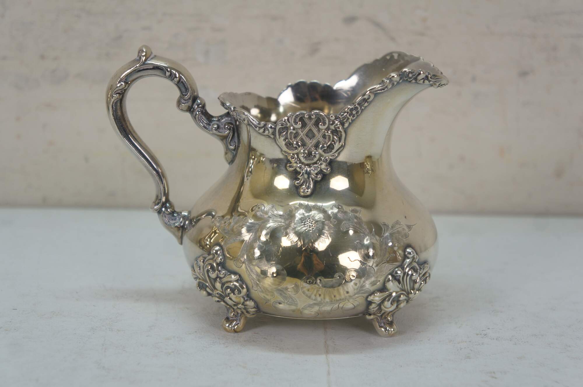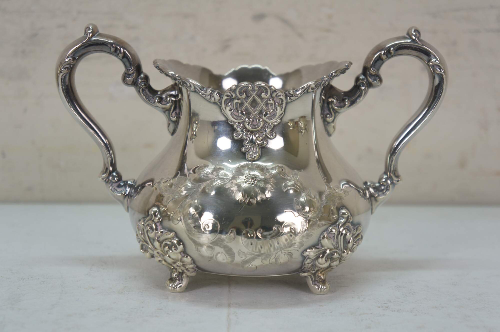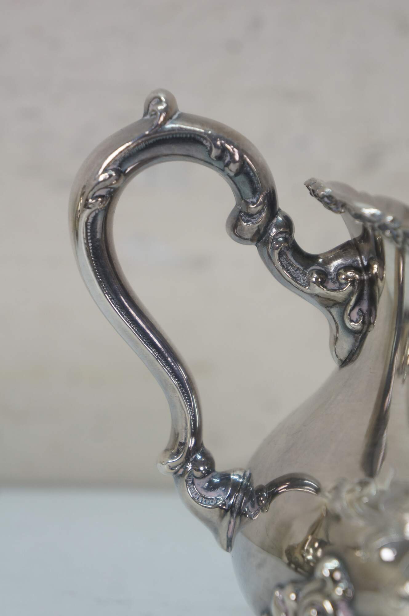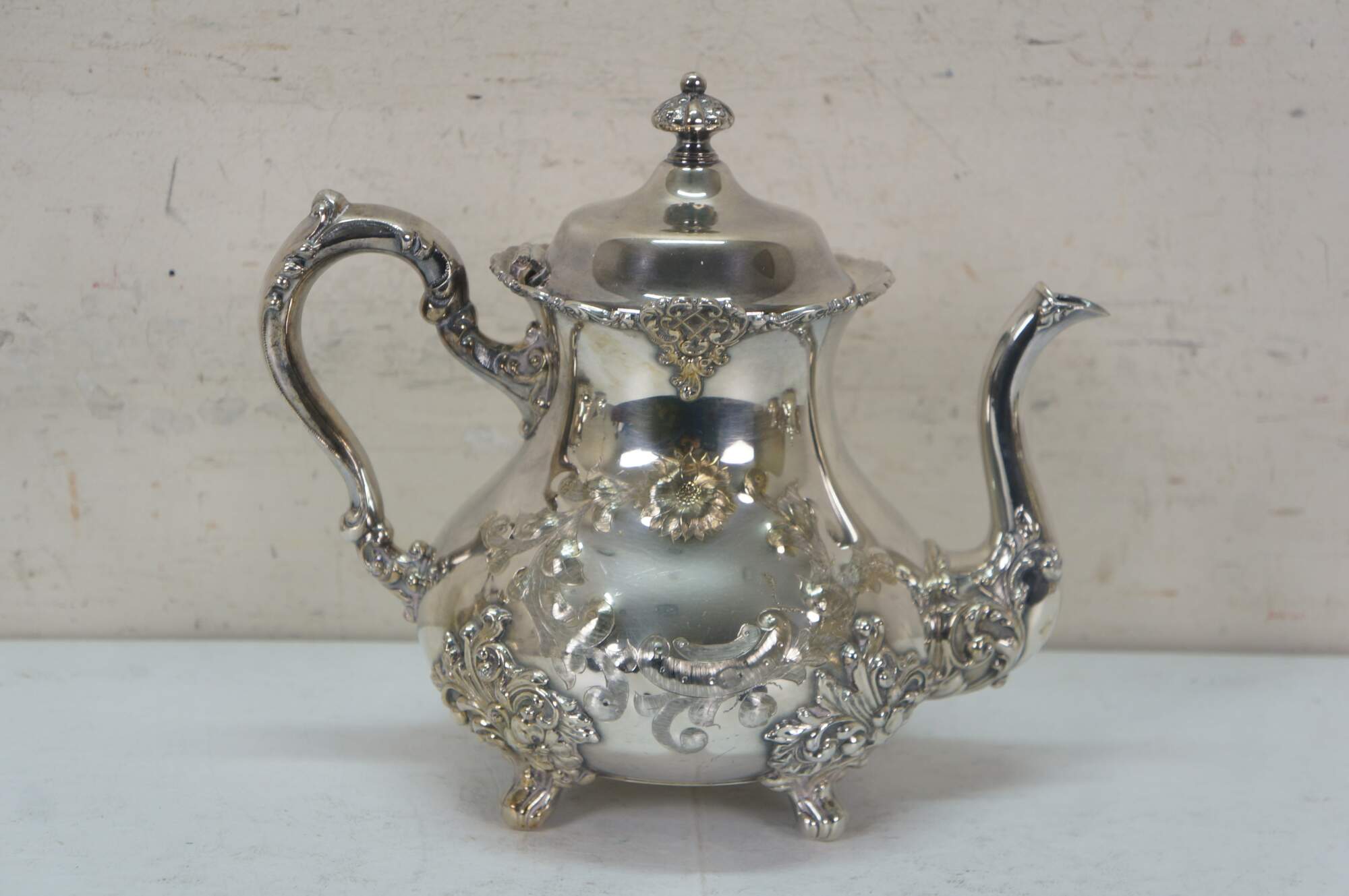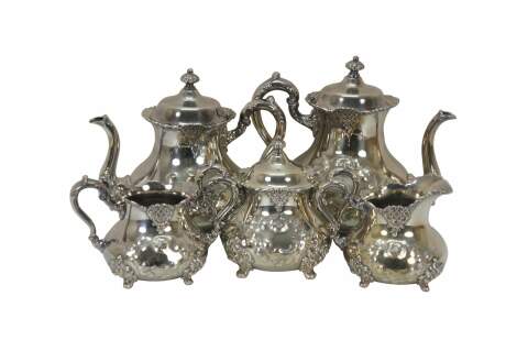 Vintage 20th century number 931 Poole silverplate tea set including: Teapot, Coffee Pot, Creamer, Sugar Bowl, and Waste Pot with Lid. Features a scrolling floral, foliate, and lattice design etched on the sides with additional flowers.