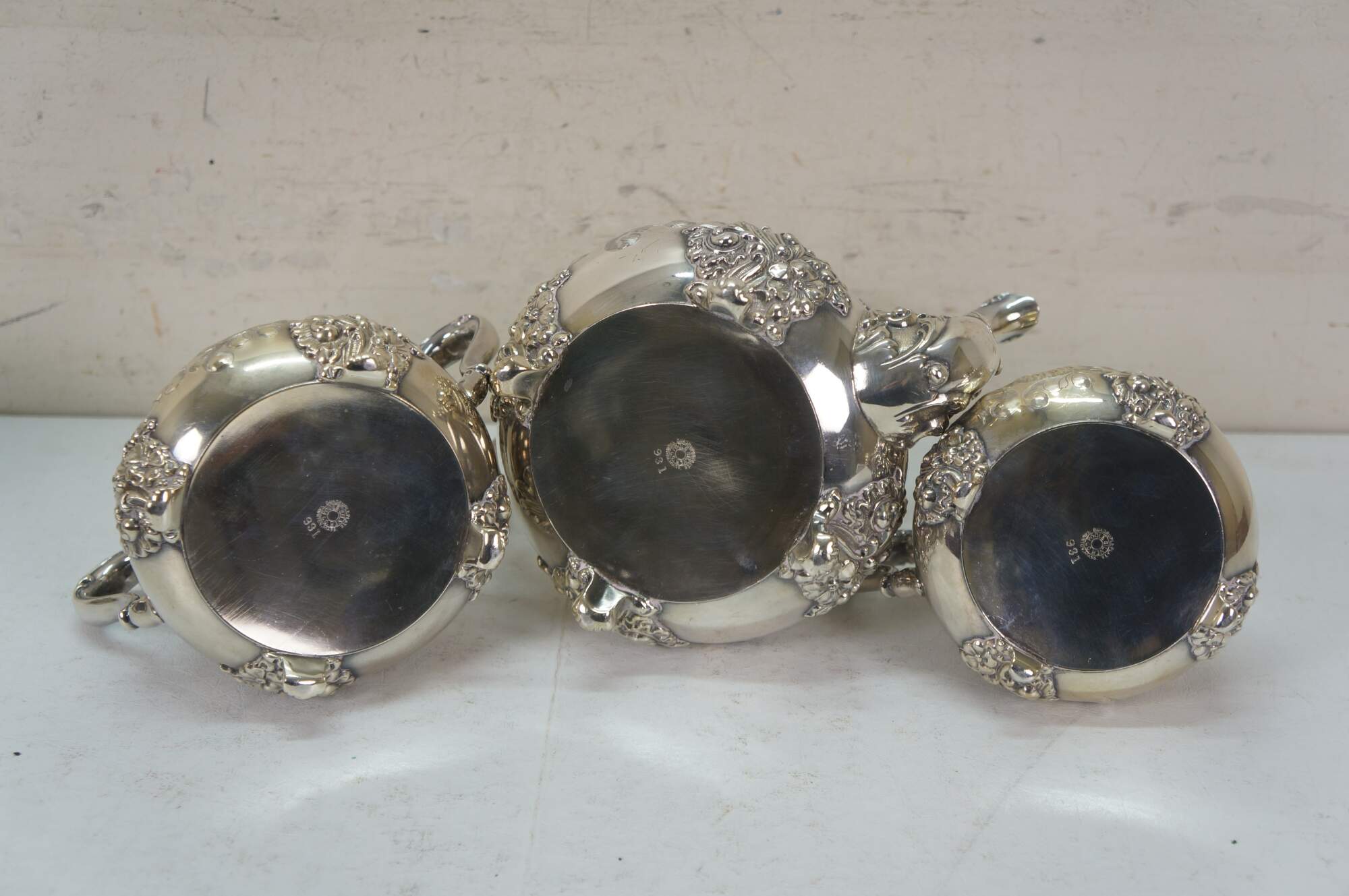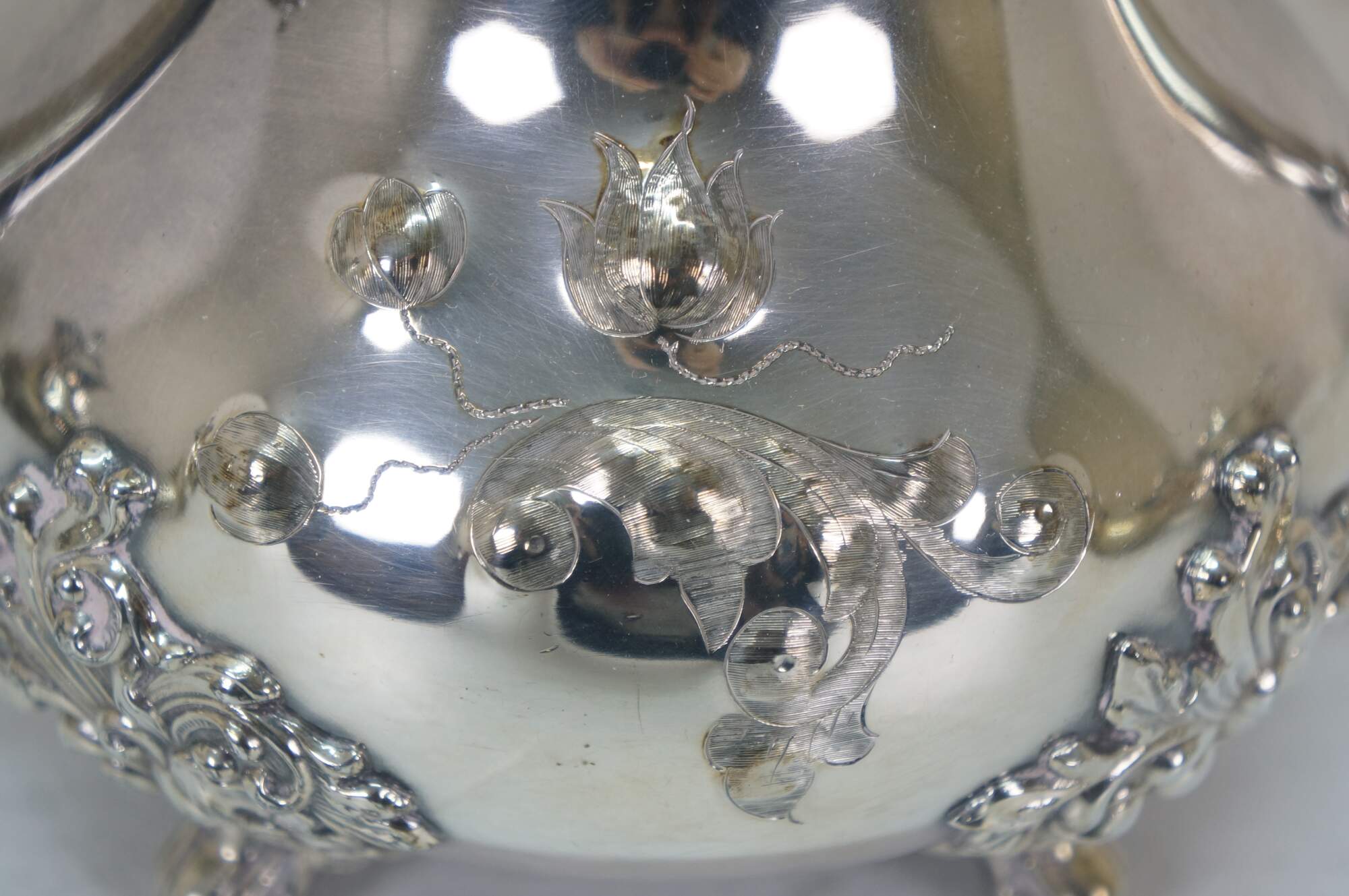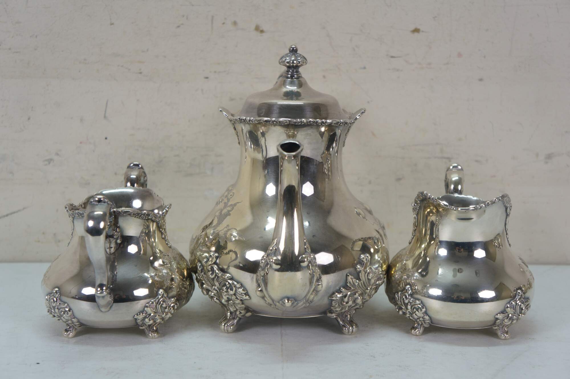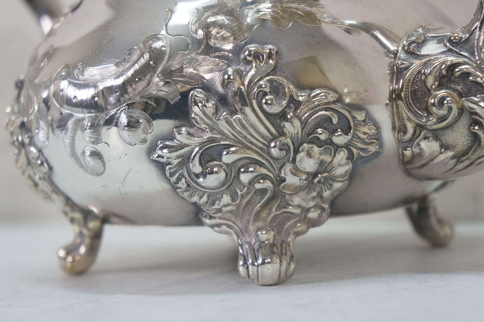 Vintage 20th century number 931 Poole silverplate tea set including: Teapot, Coffee Pot, Creamer, Sugar Bowl, and Waste Pot with Lid. Features a scrolling floral, foliate, and lattice design etched on the sides with additional flowers.
