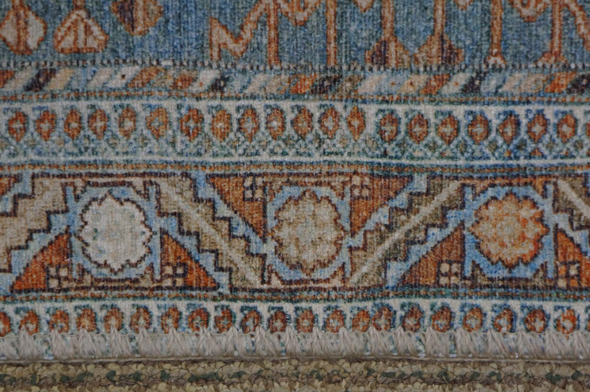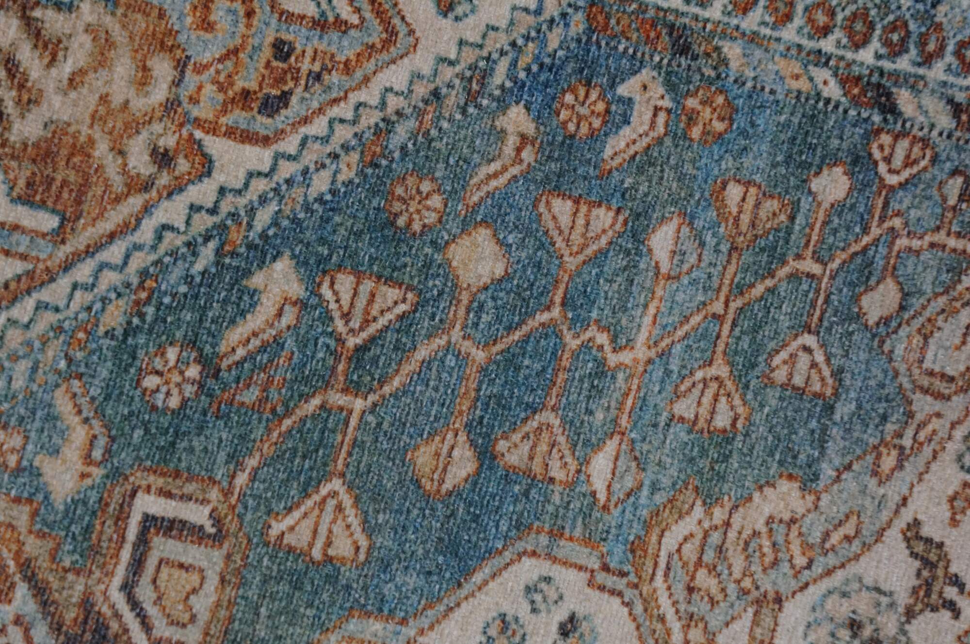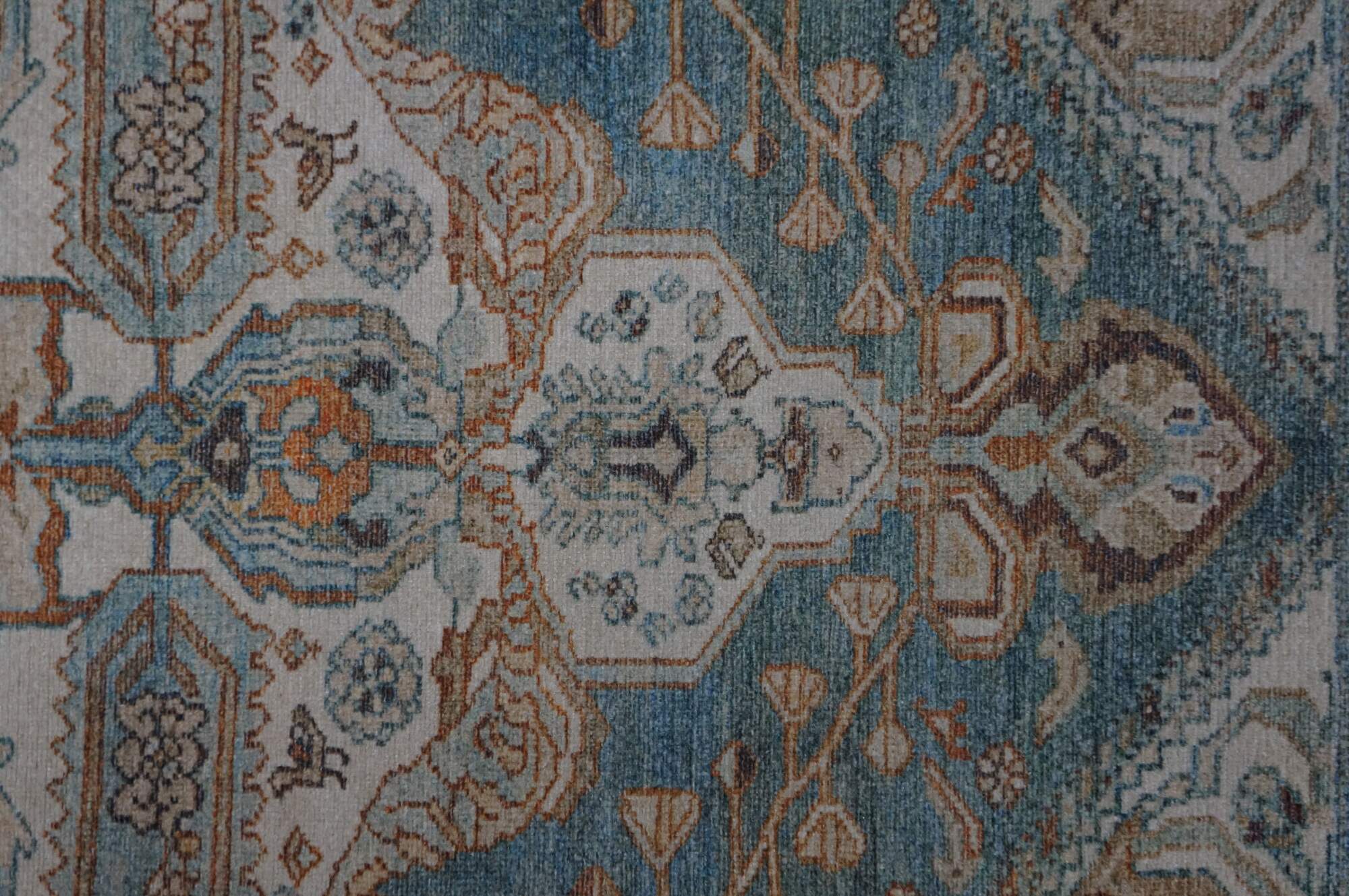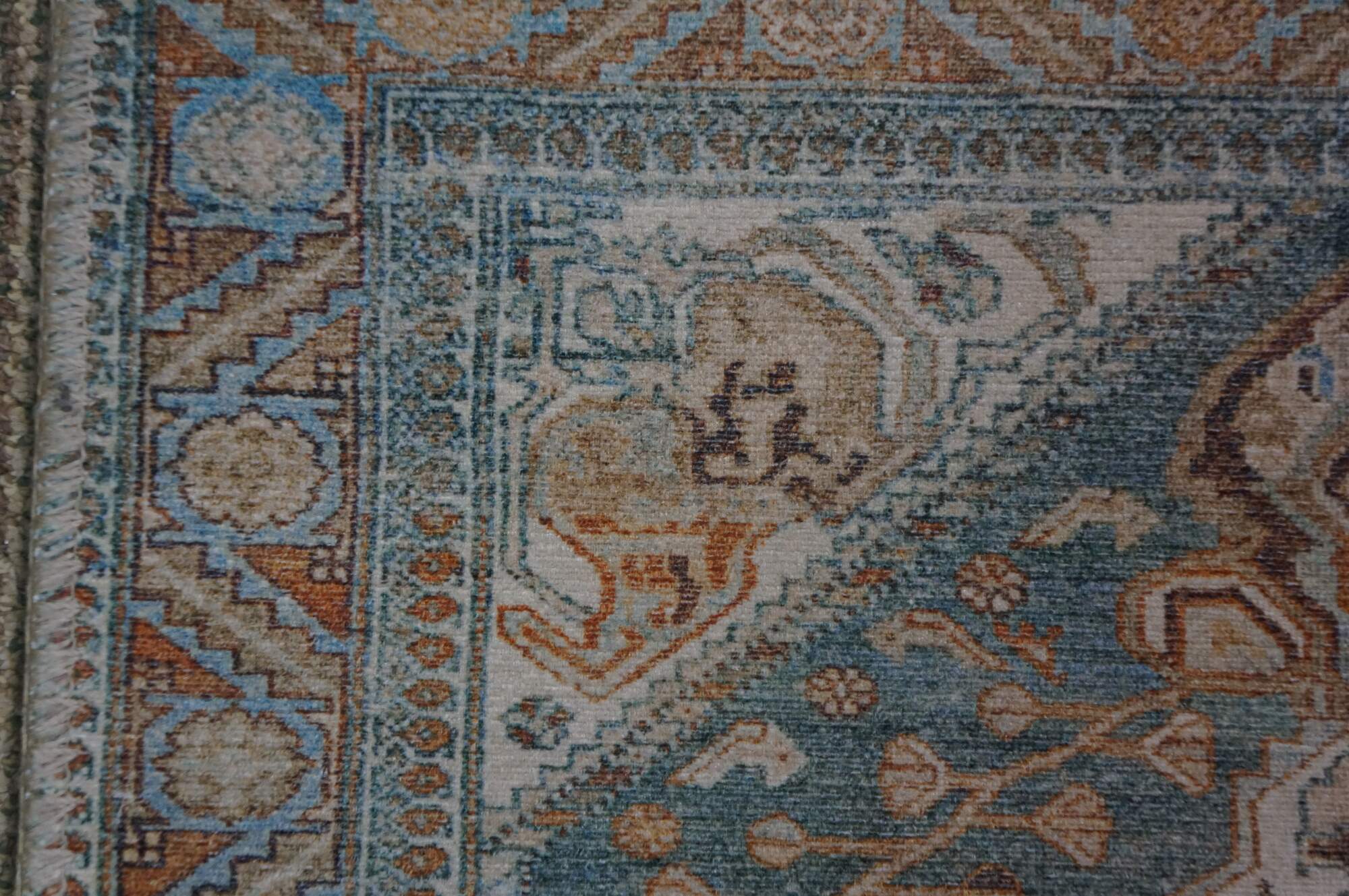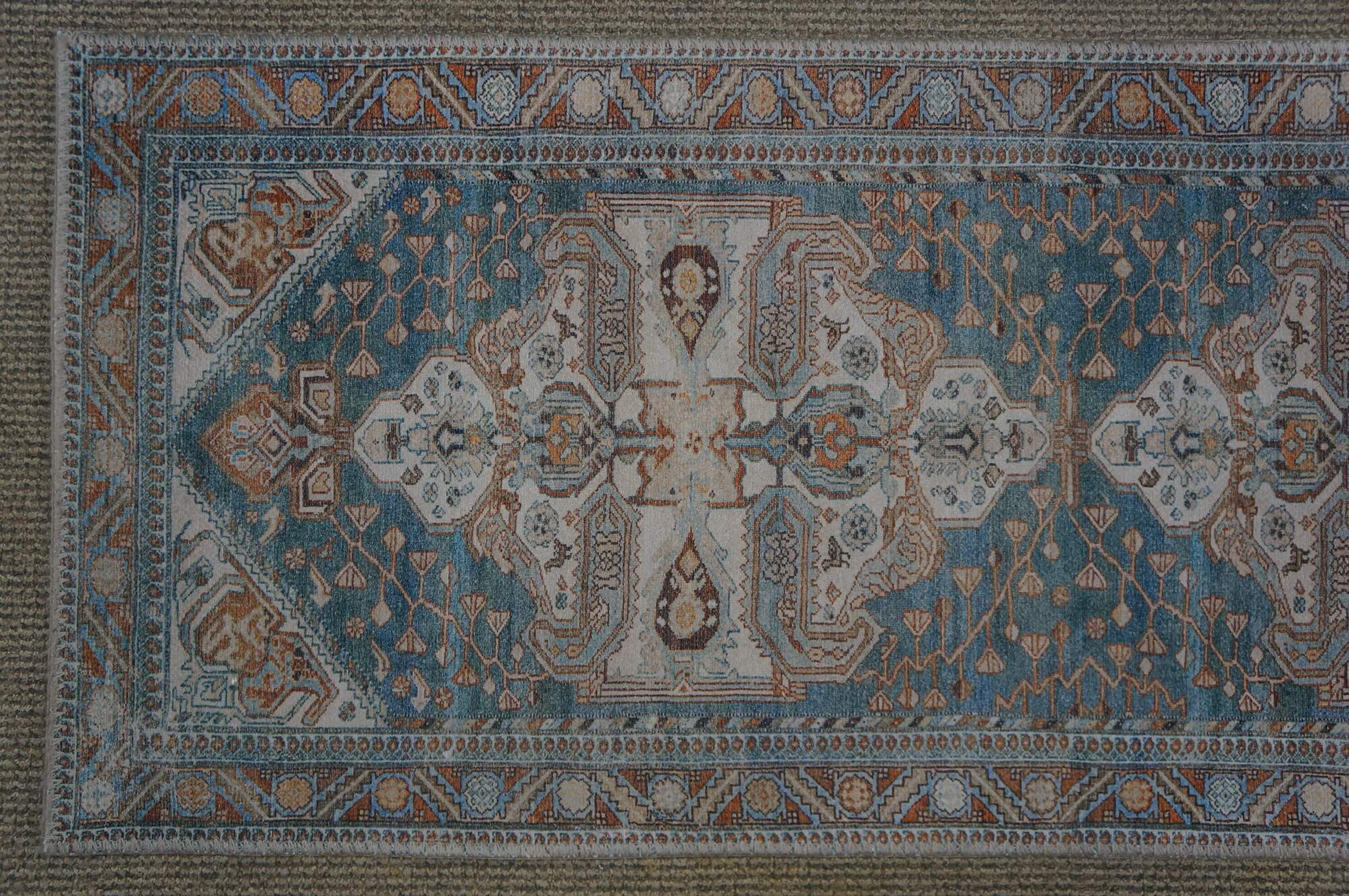 Late 20th century carpet runner / mat. Traditional geometric and floral design in turquoise, rust and beige.
