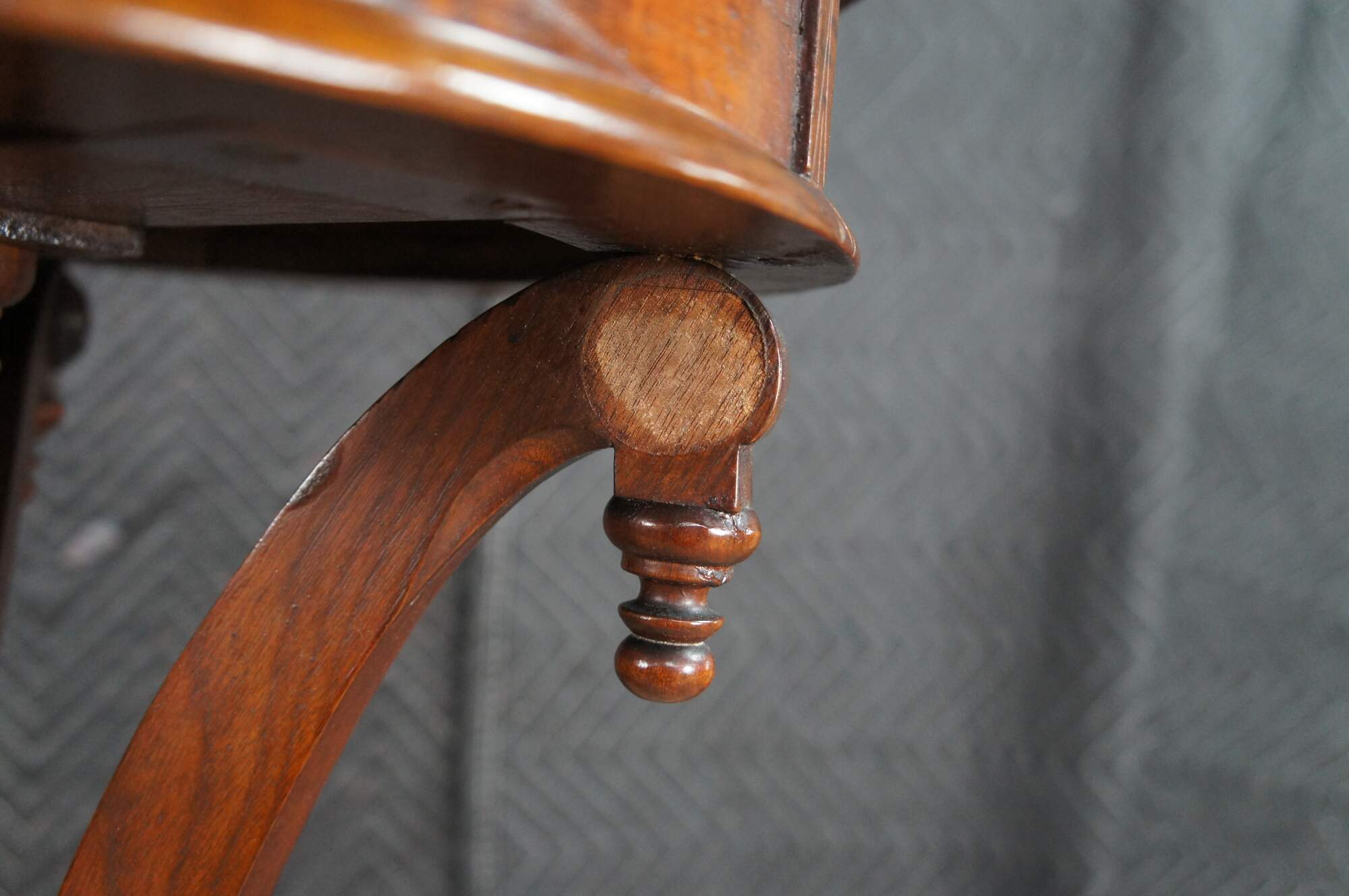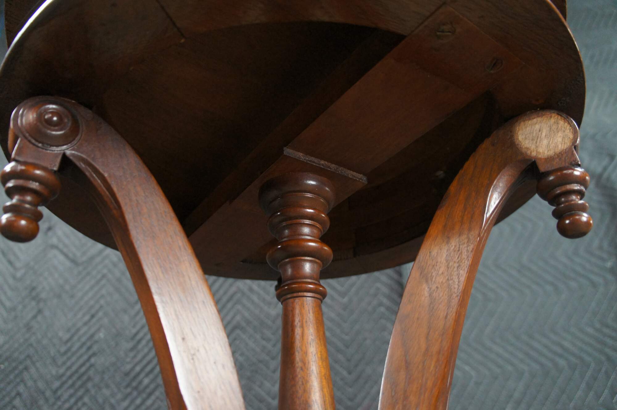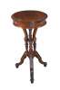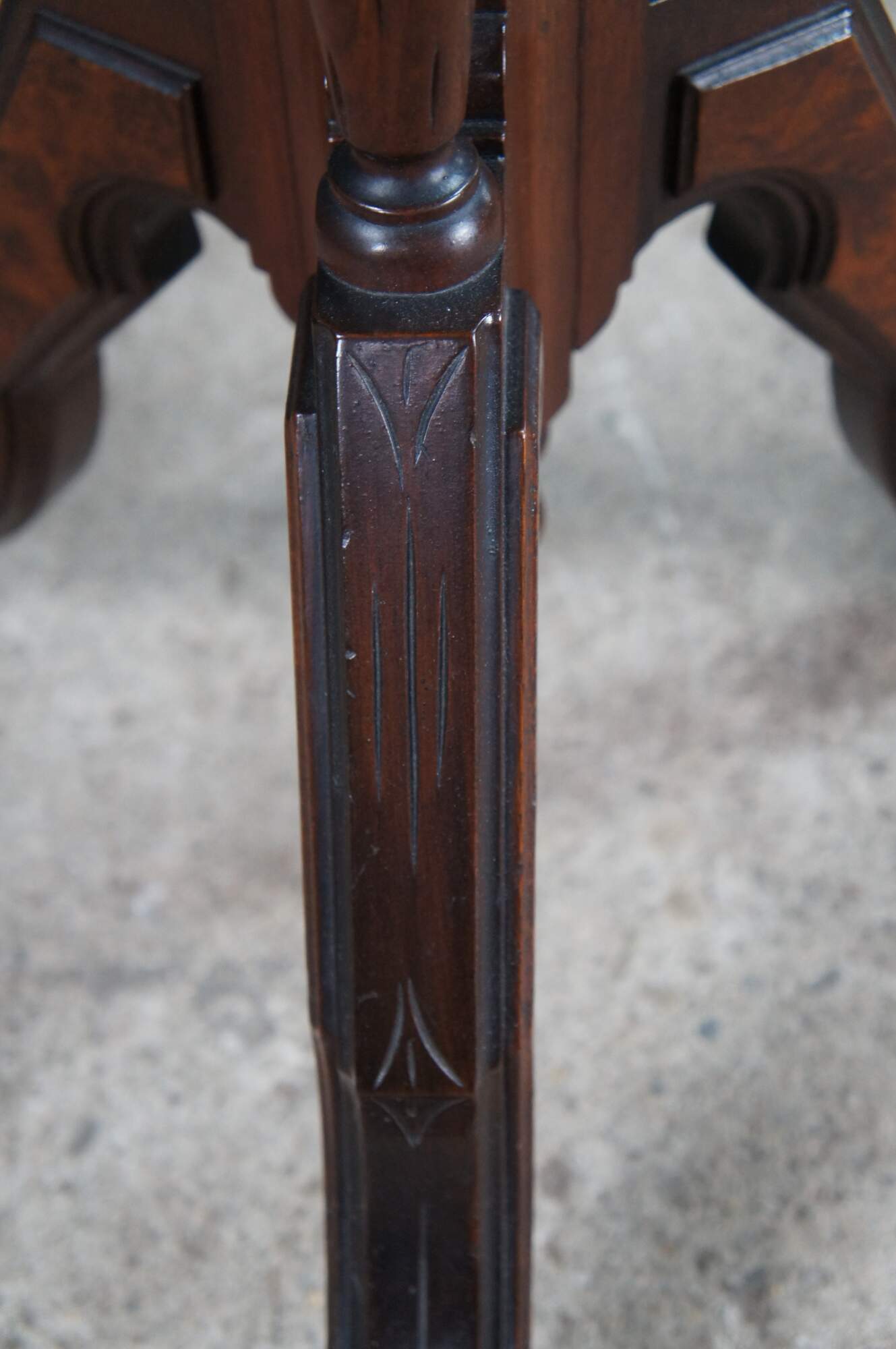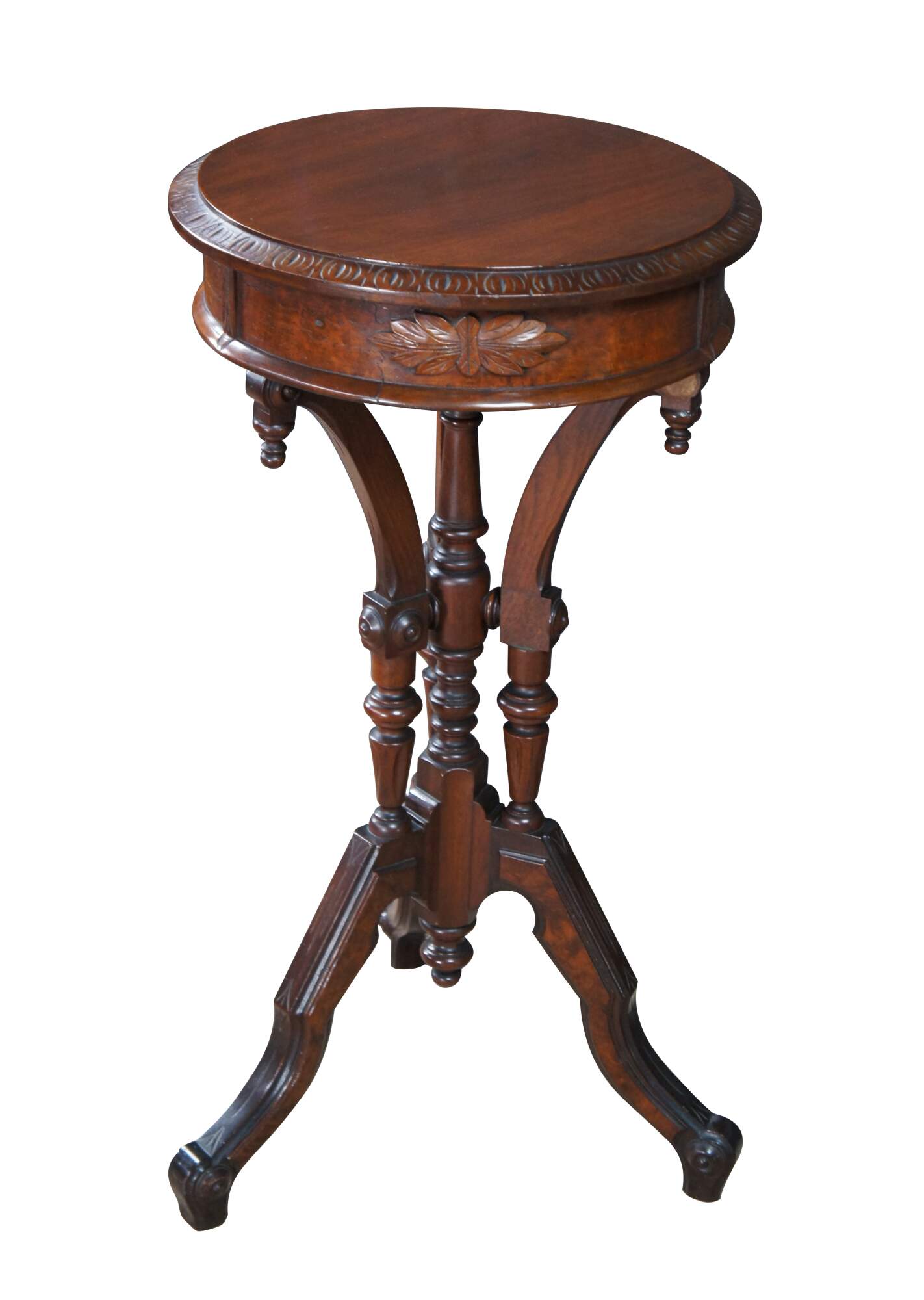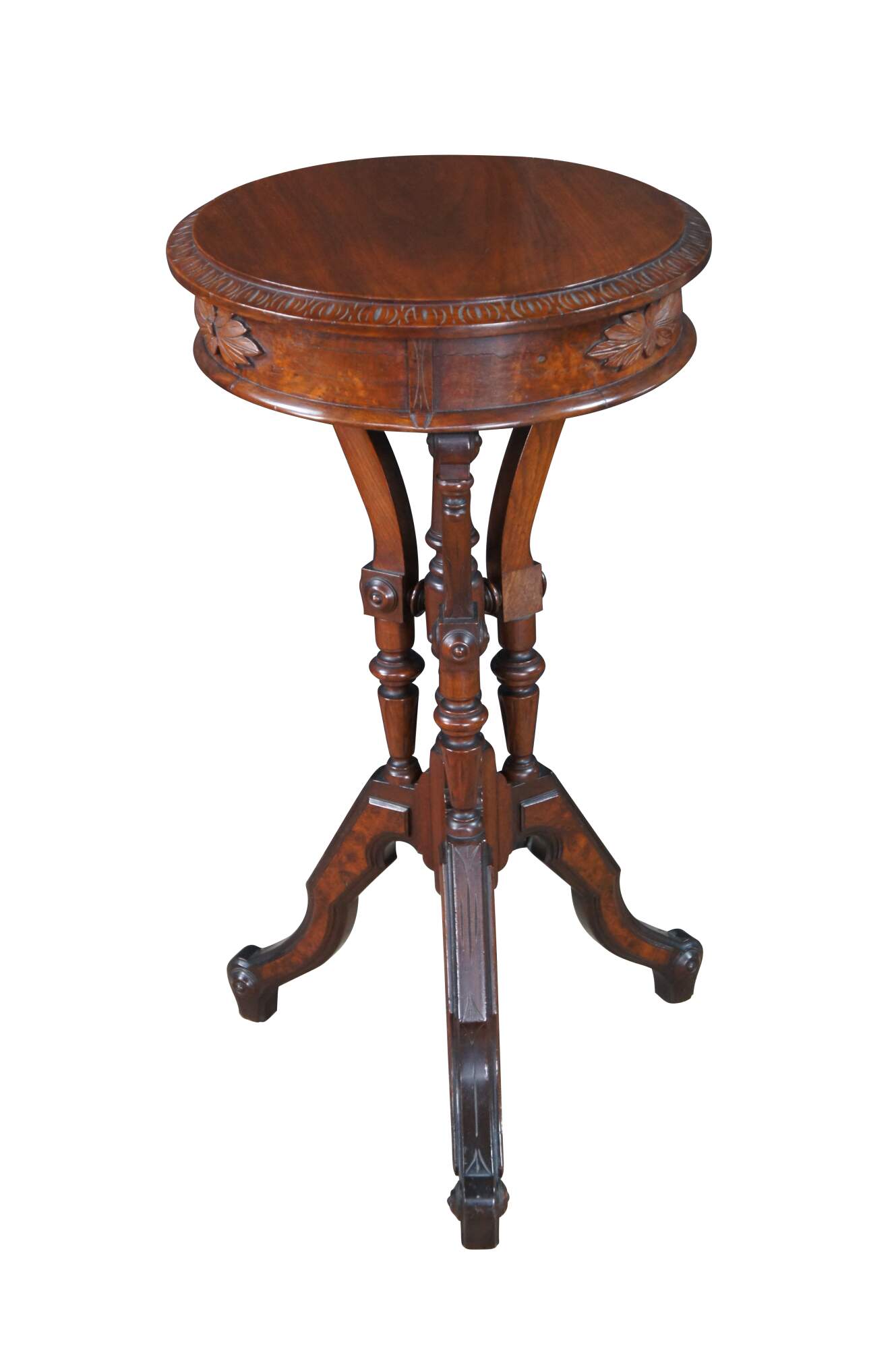 An antique Victorian era Eastlake parlor pedestal table or plant stand, circa 1880s. Made from walnut with a round top with carved edge over a burled frieze with leaf carving over a tripod base leading to downswept legs.