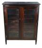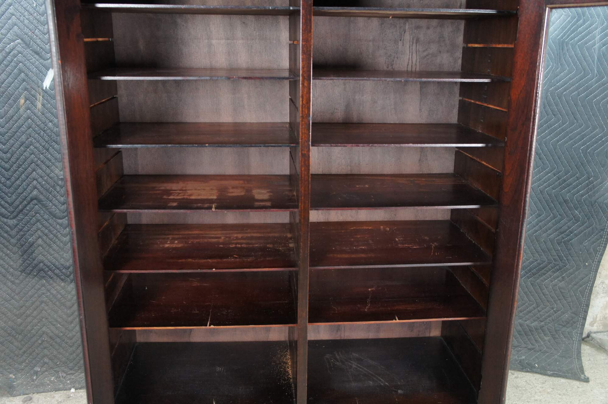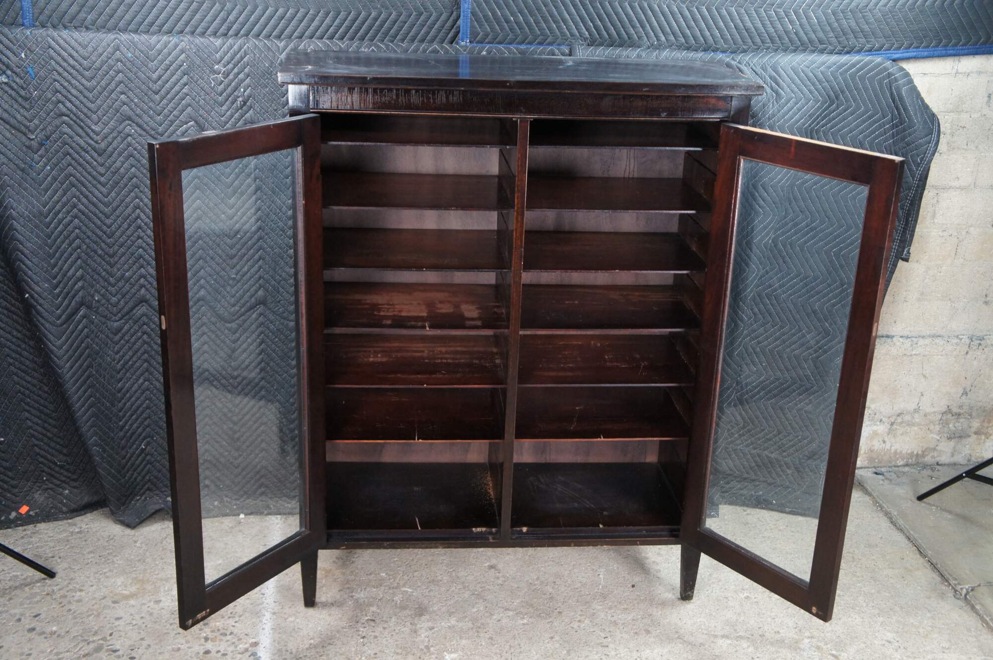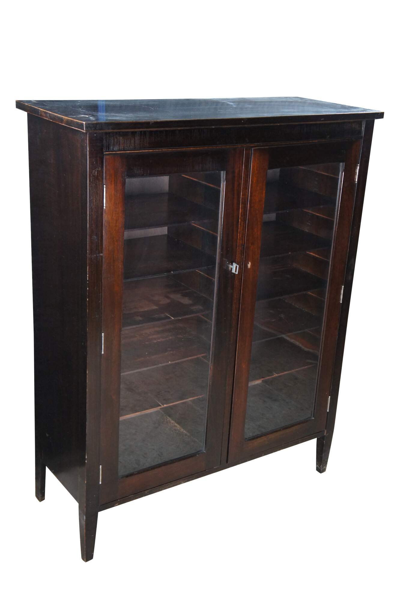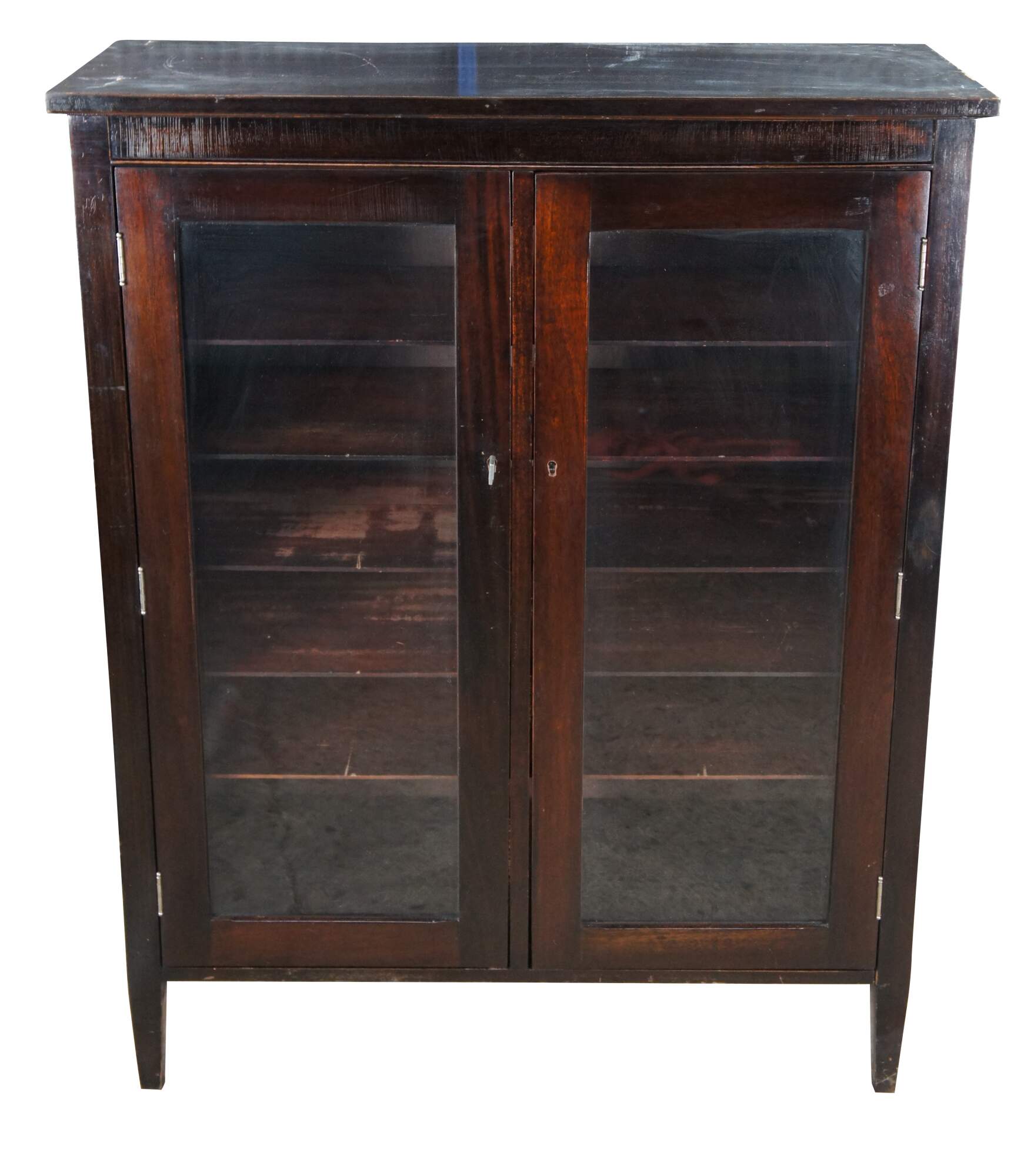 Early 20th Century Novelty Wood Works Company Craftsman Style Bookcase. Made from mahogany with two glass locking front doors that open to a divided interior with 10 shelves. The cabinet is supported by square tapered legs.