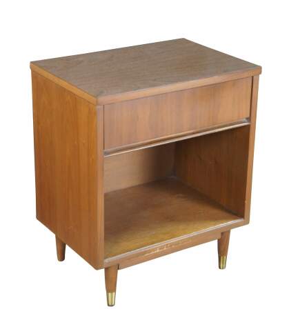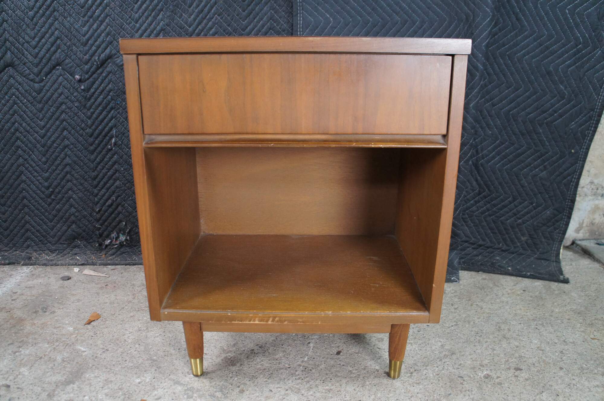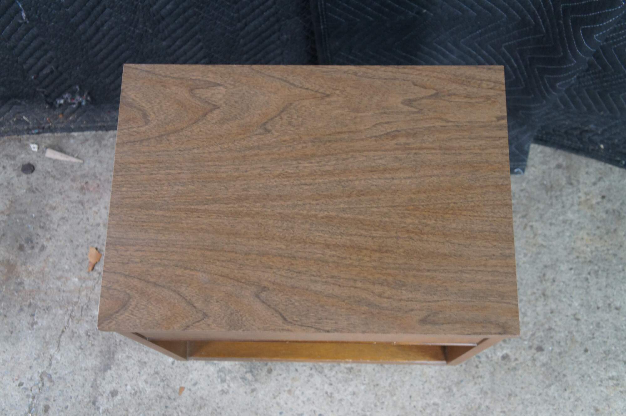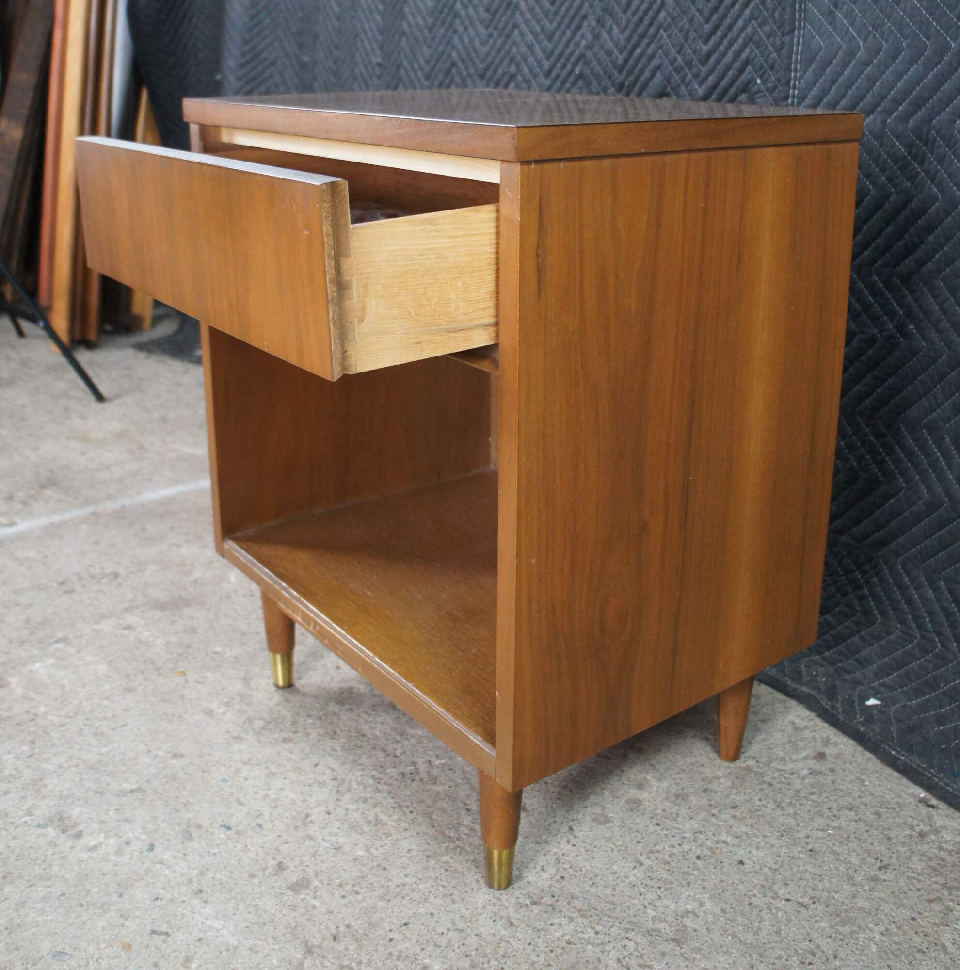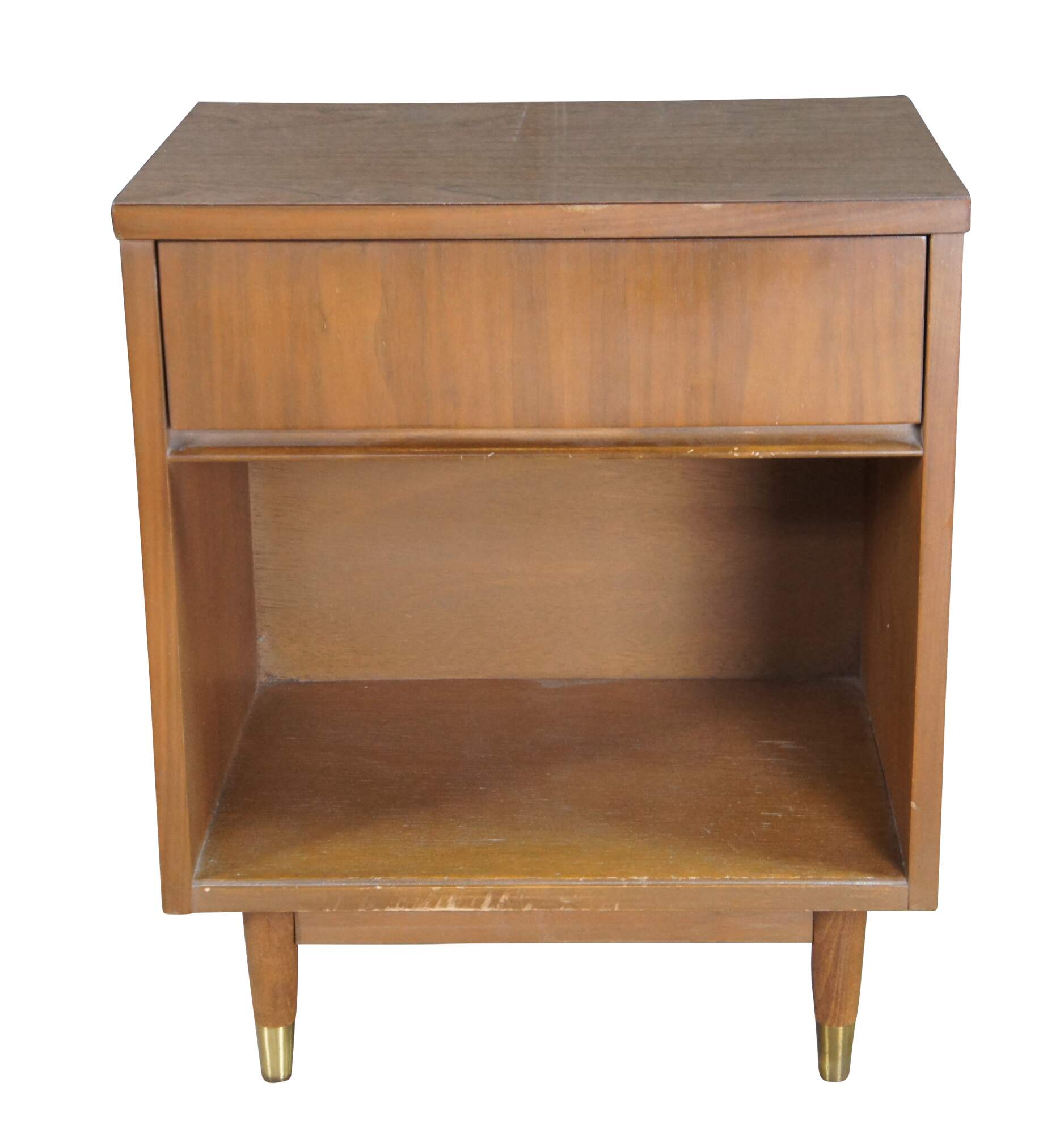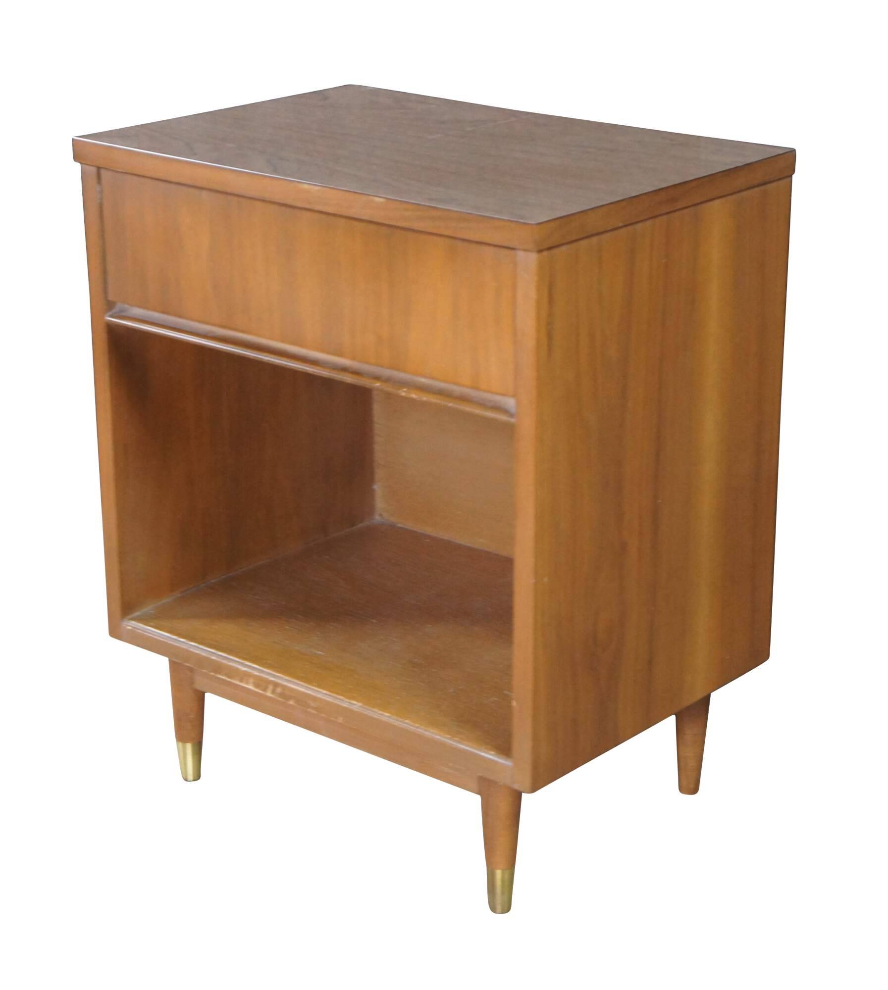 An antique 1960s Mid Century Modern Walnut night stand. Features a rectangular form with a laminate top and dovetailed drawer over lower shelf. The cabinet is supported by tapered legs with brass caps along the front. Marked 2080-91 along backside, circa 1966