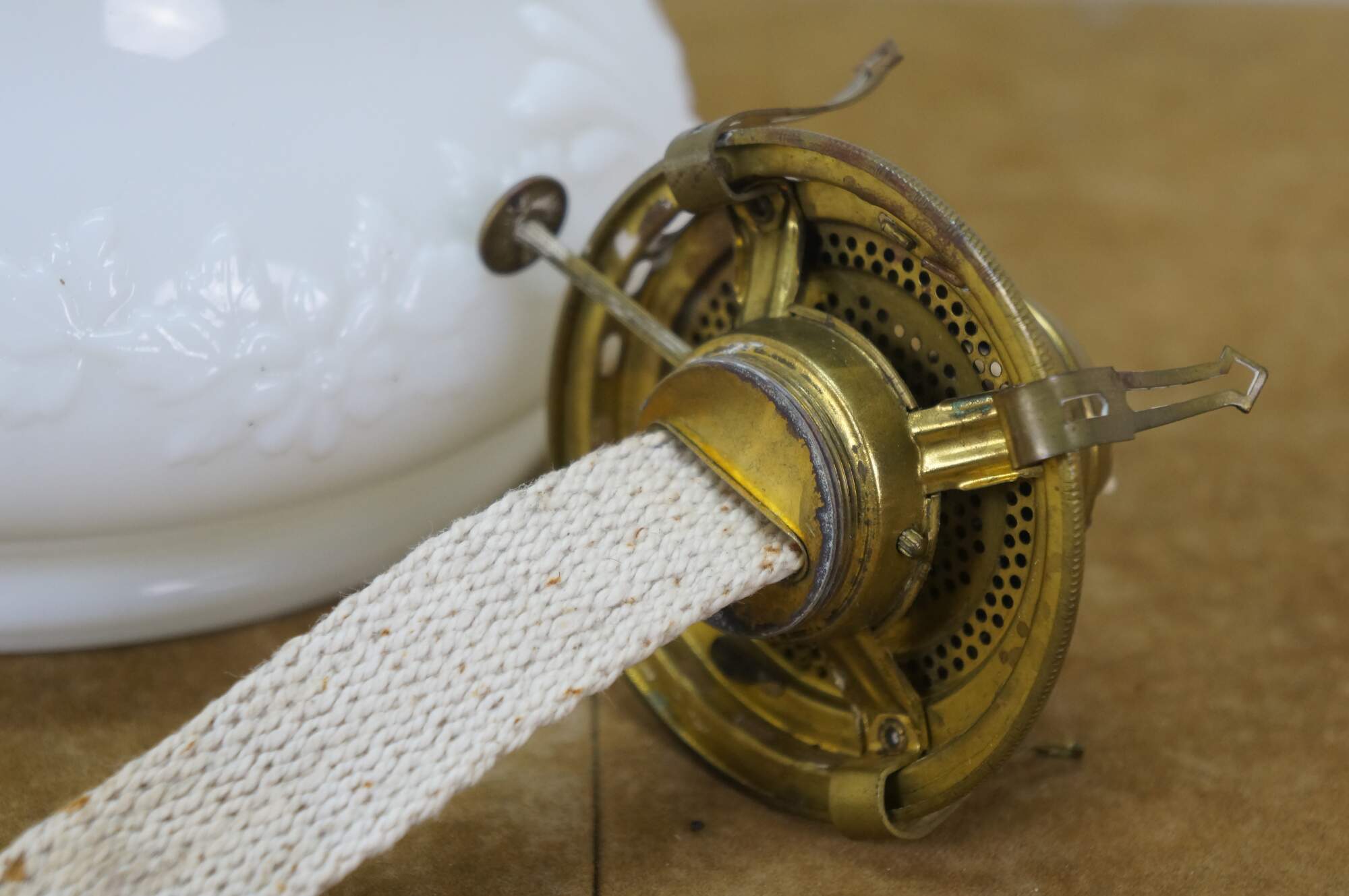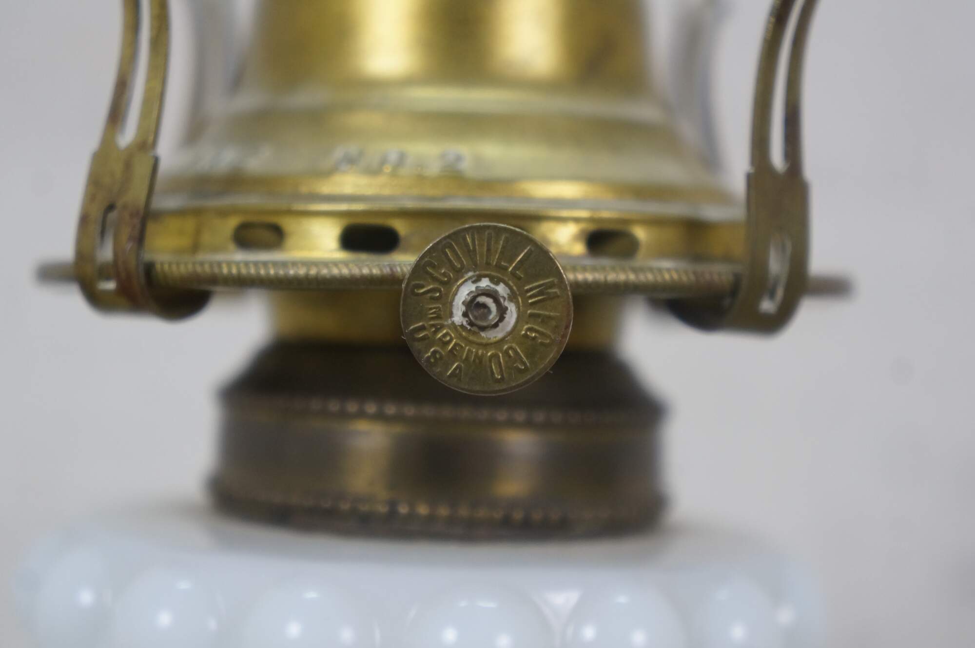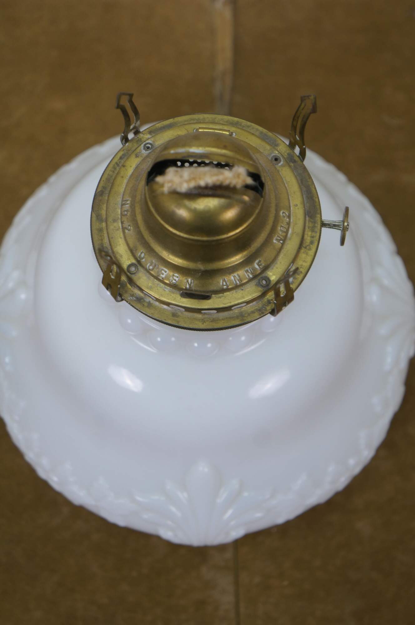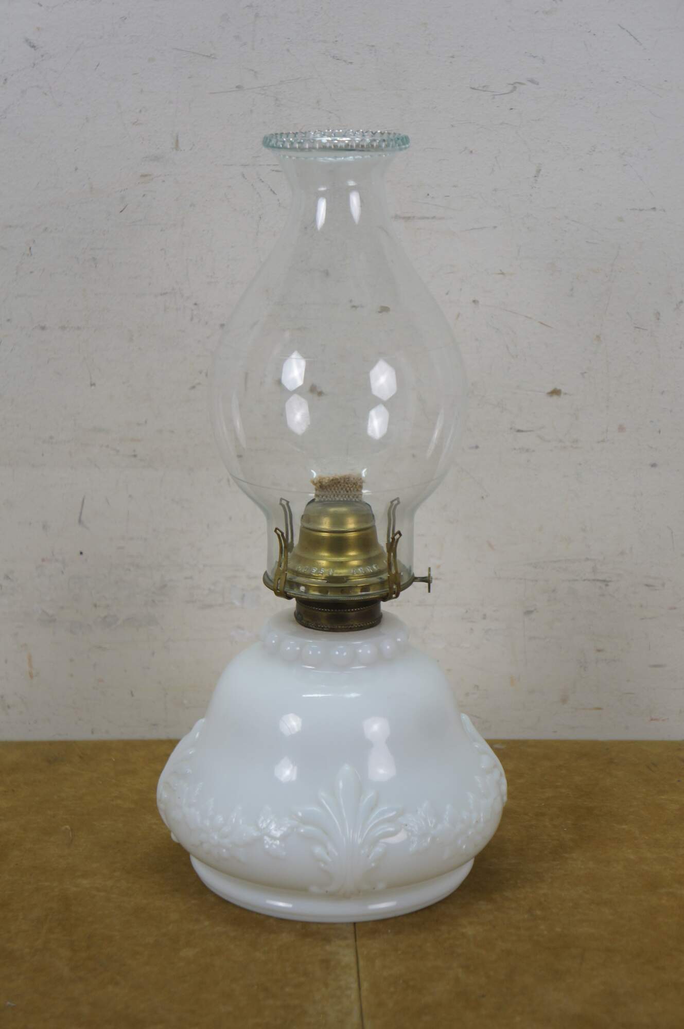 Late 19th to early 20th century Victorian oil lamp - milk glass reservoir pressed with floral swags and foliate plumes. Scovill Manufacturing Company Queen Anne No 2 burner with wick. Clear glass hurricane with beaded rim and stamped with the image of the man in the moon with a wreath surrounding several five pointed stars.