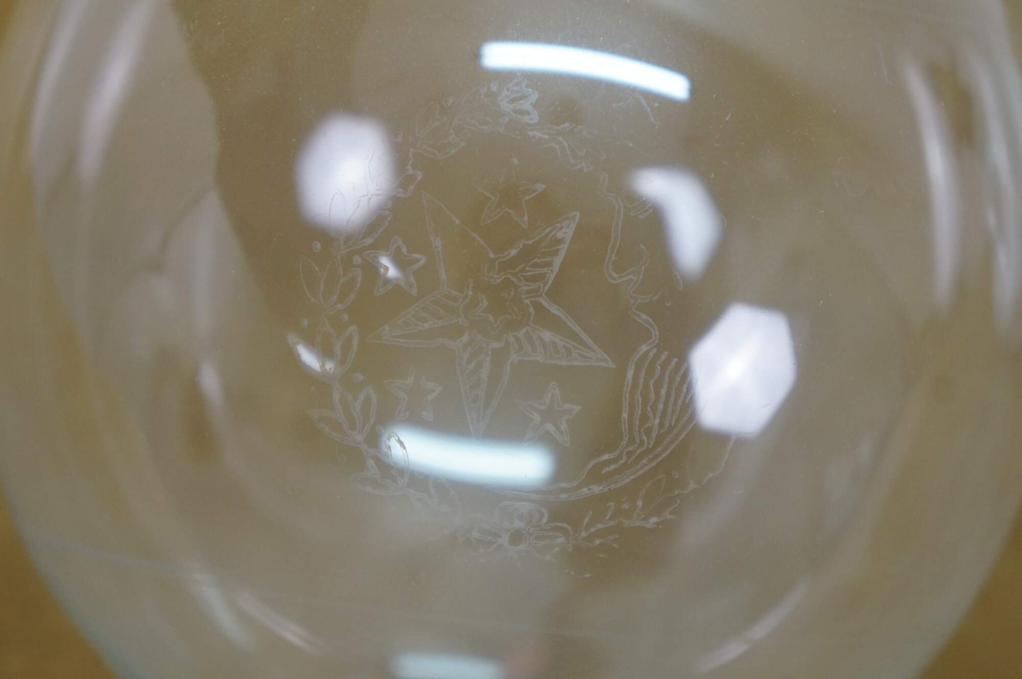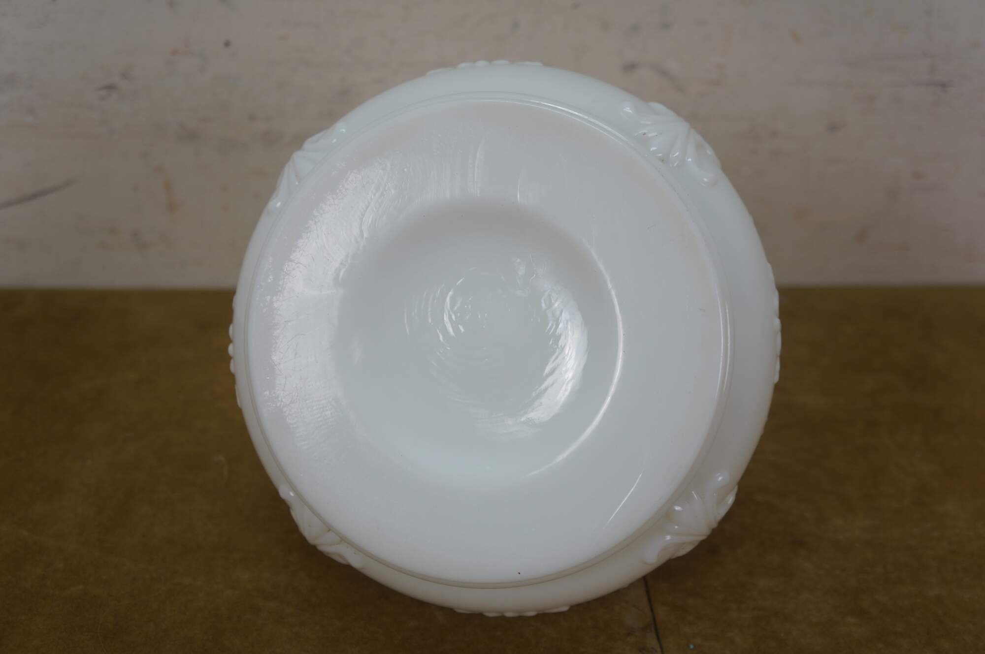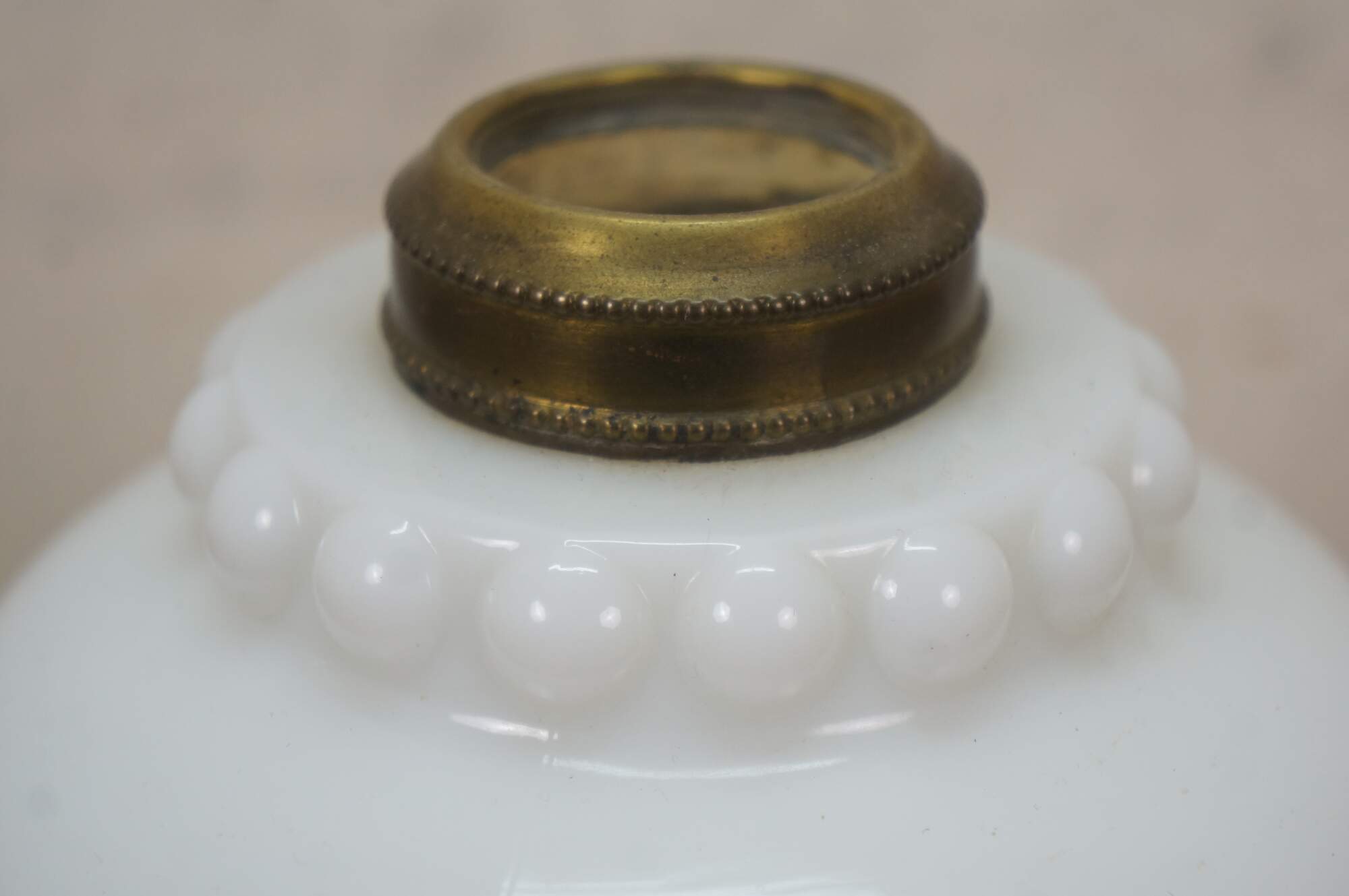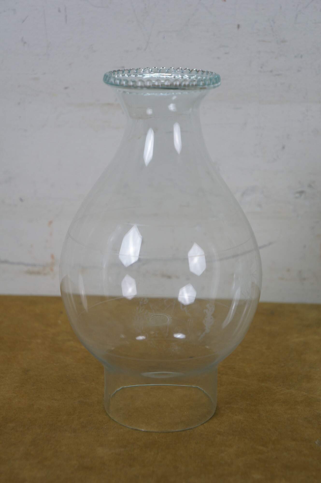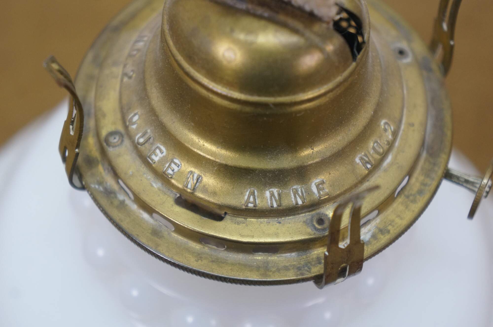 Late 19th to early 20th century Victorian oil lamp - milk glass reservoir pressed with floral swags and foliate plumes. Scovill Manufacturing Company Queen Anne No 2 burner with wick. Clear glass hurricane with beaded rim and stamped with the image of the man in the moon with a wreath surrounding several five pointed stars.