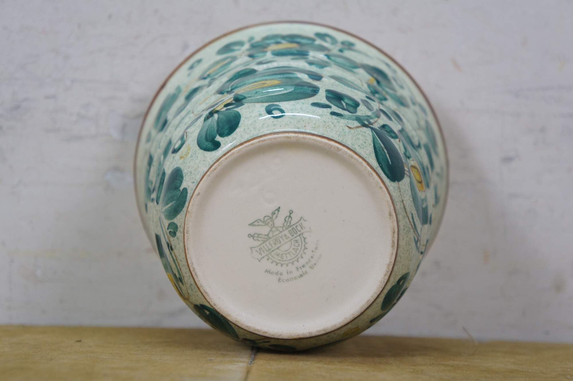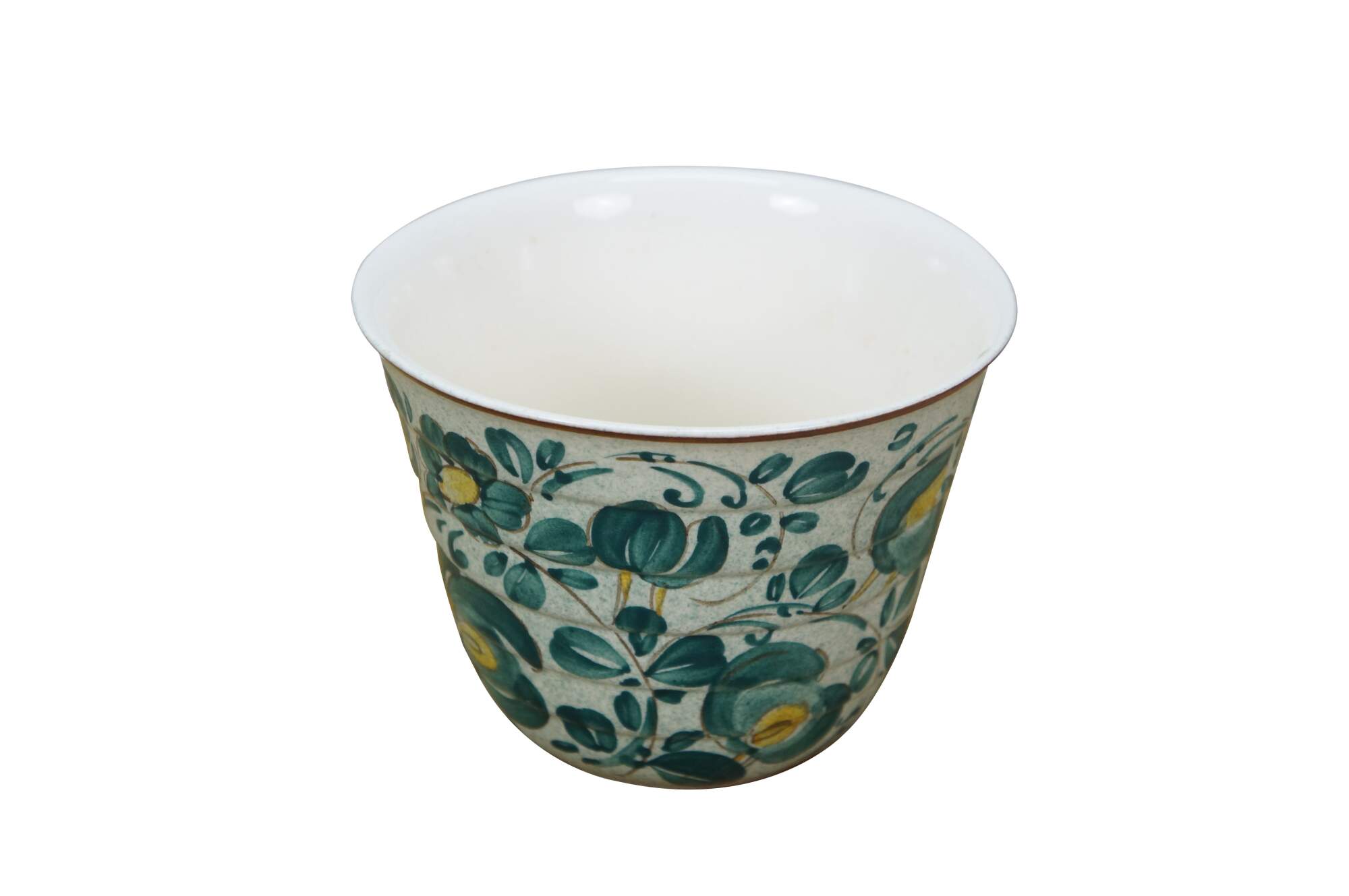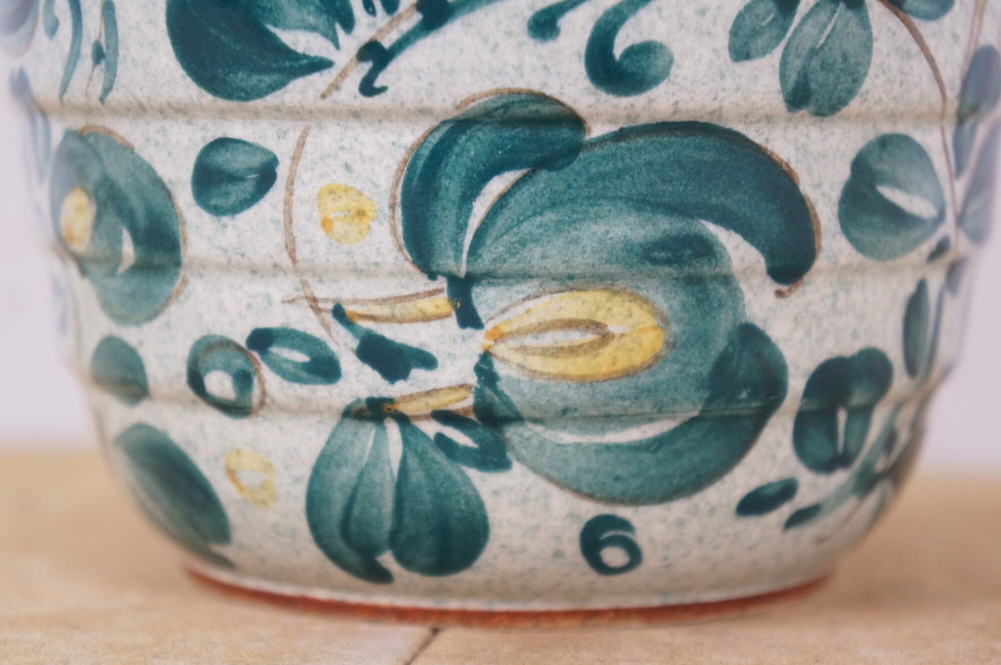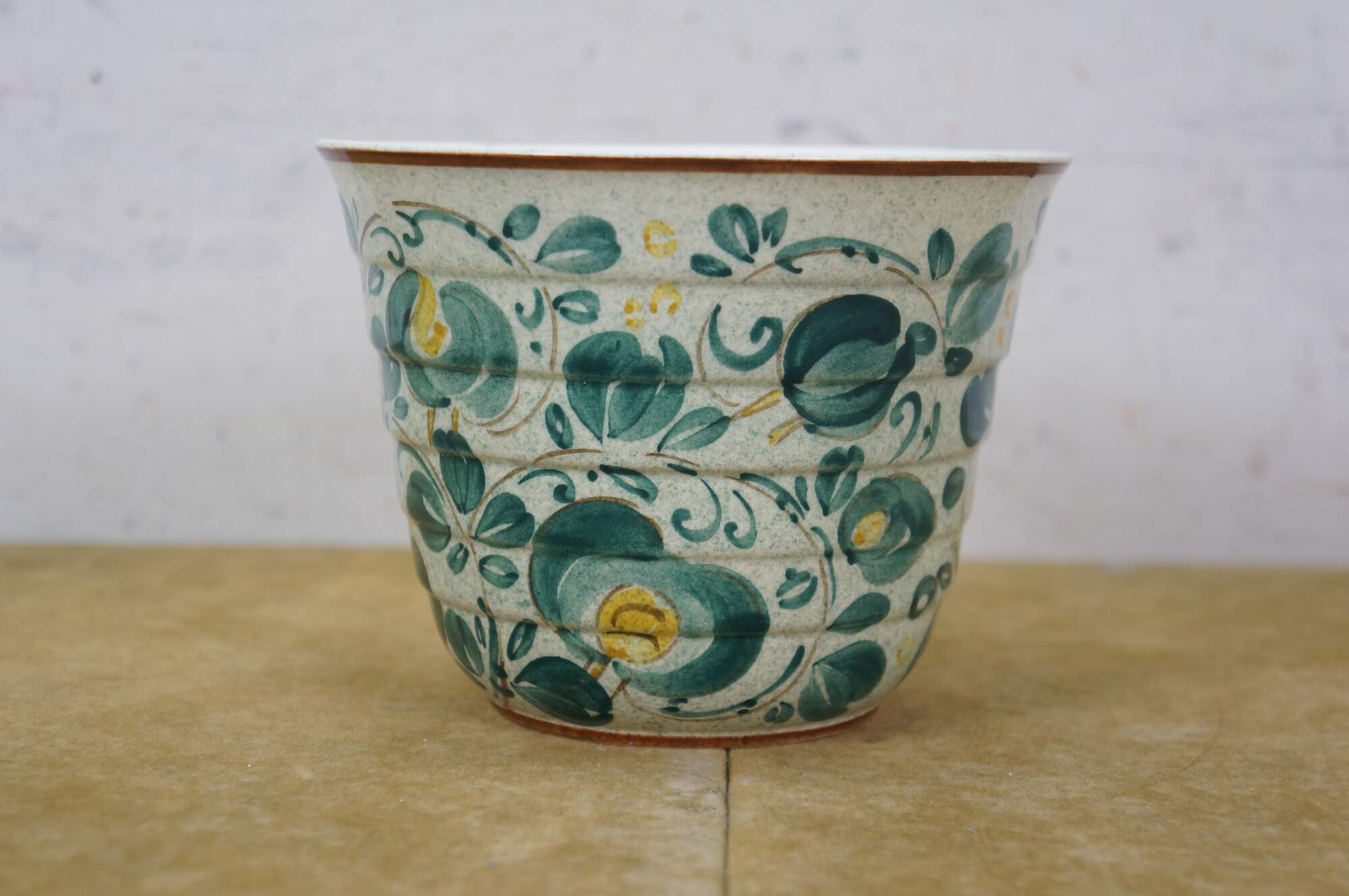 Mid 20th century Villeroy & Boch porcelain cachepot / planter with a tiered grooved exterior, with a speckled green finish and hand painted swirls of semi-abstract dark teal and yellow flowers. Brown trim at the rim. Mark used circa 1945-1956.