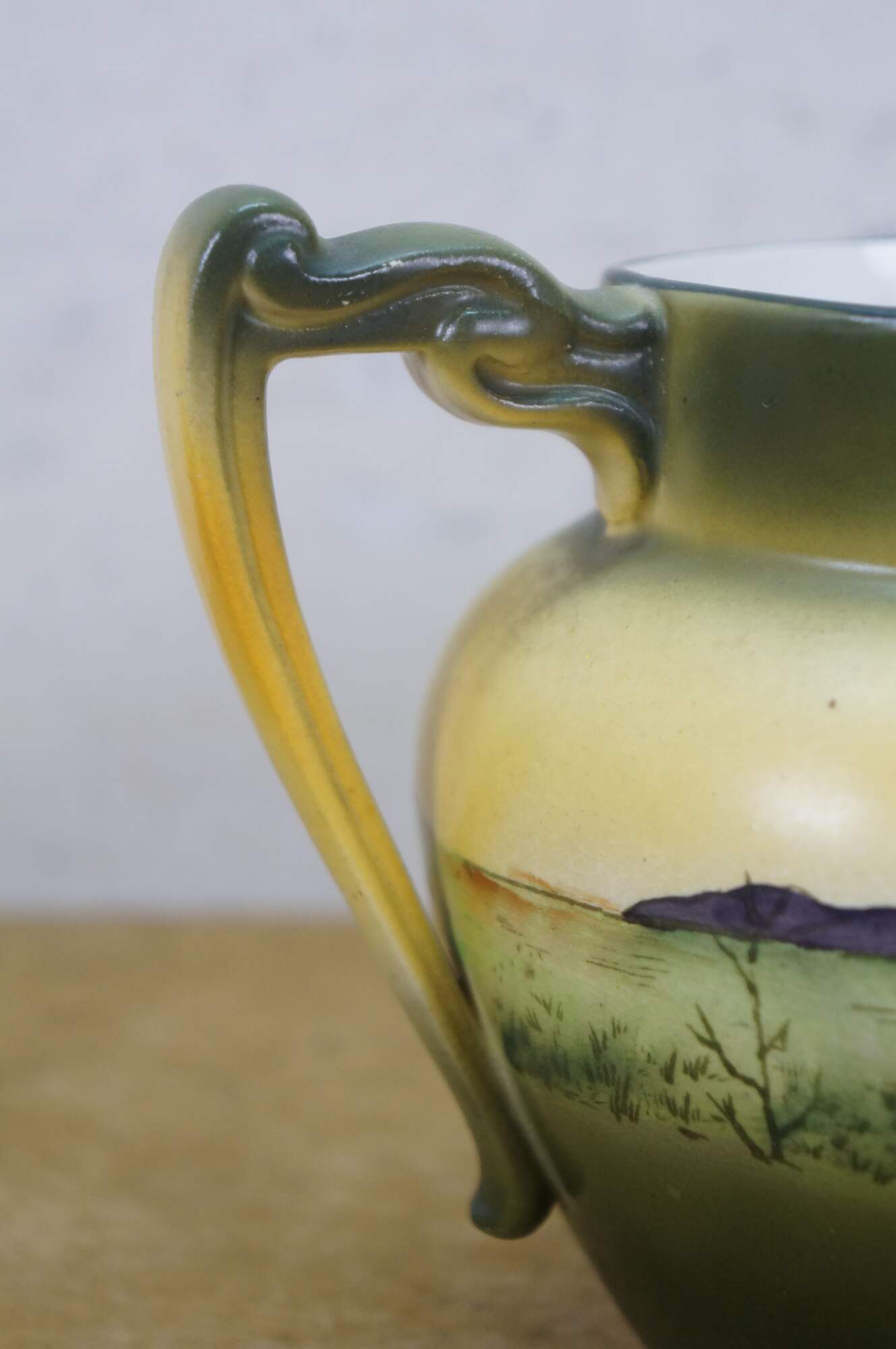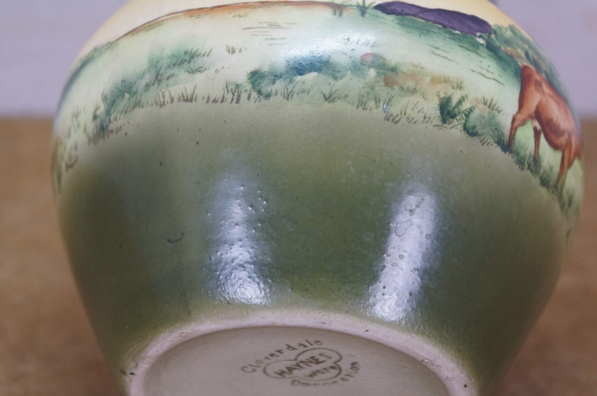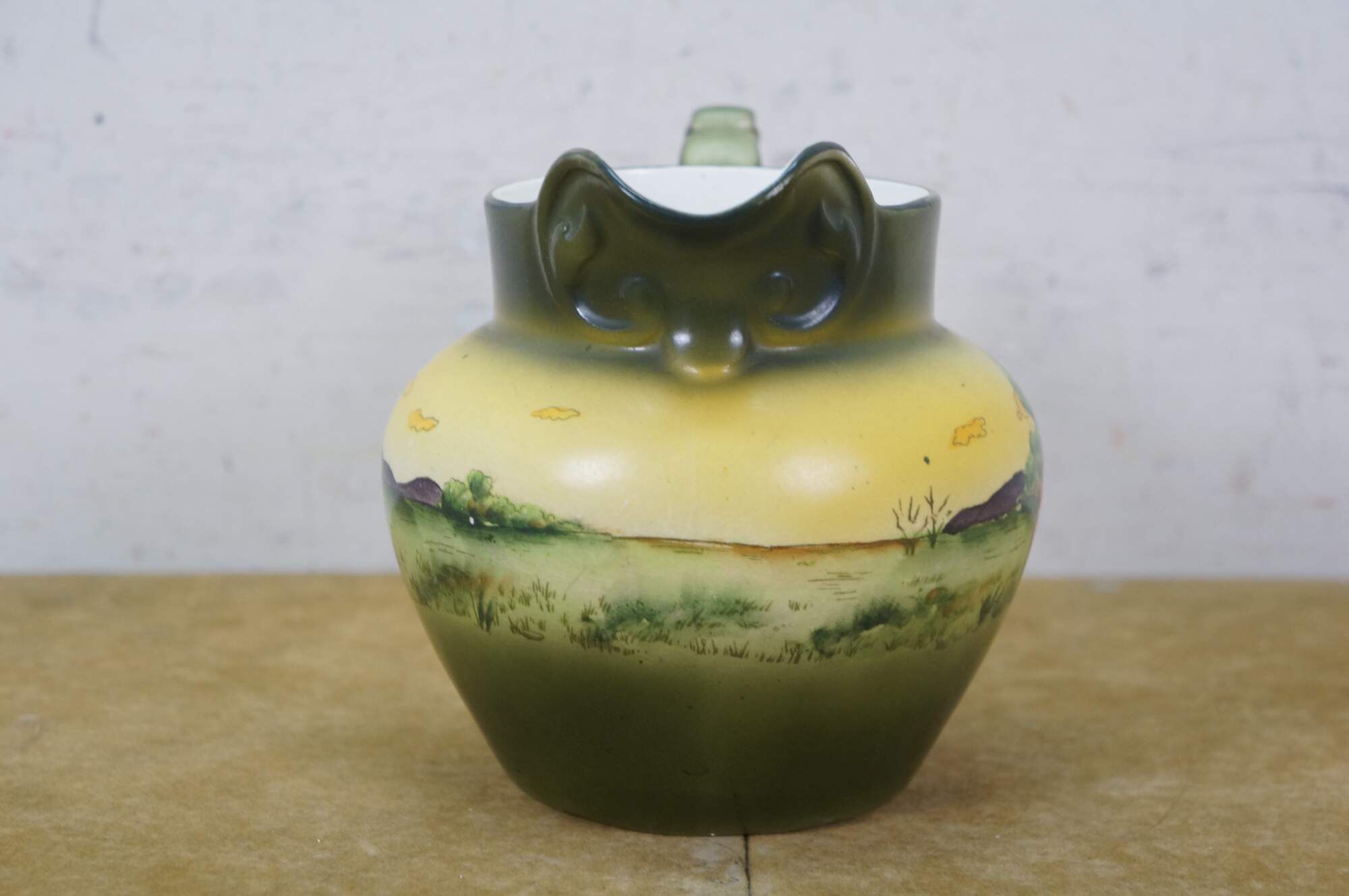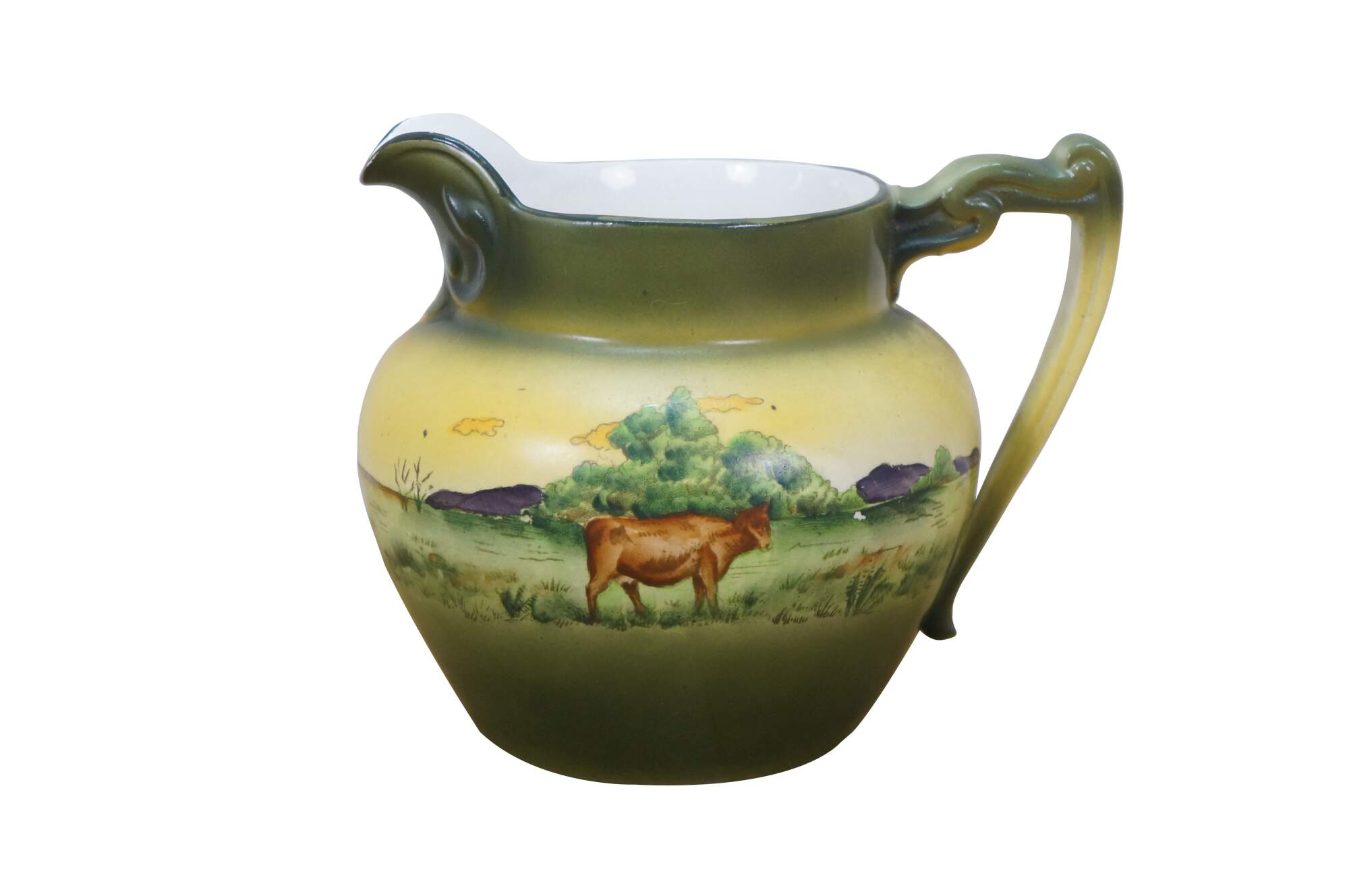 Late 19th to early 20th century porcelain Haynes Ware farmhouse cream pitcher by D.F. Haynes & company in the Cloverdale pattern. Fully decorated in green and yellow with a hand painted country landscape focused on a brown cow.