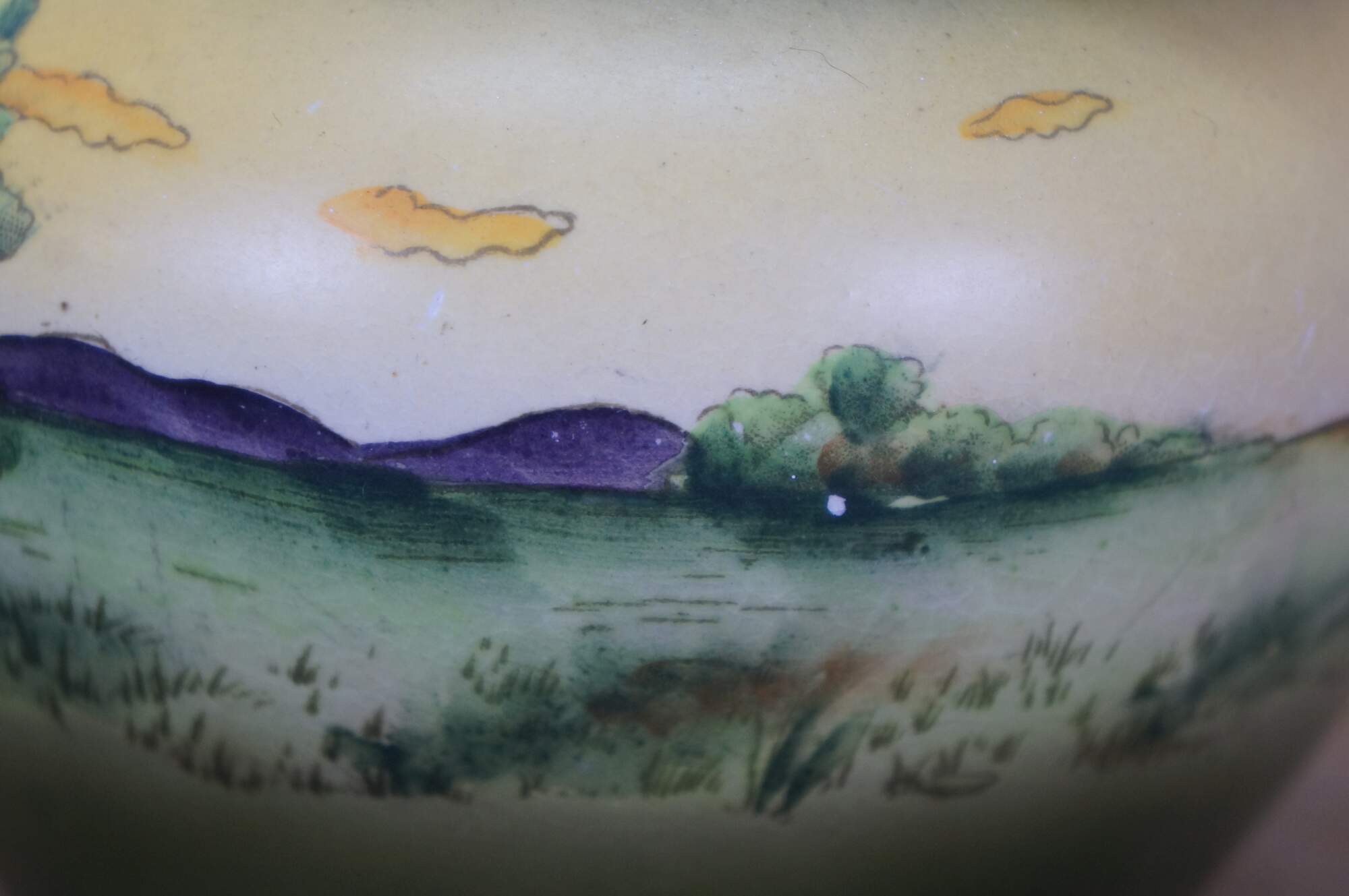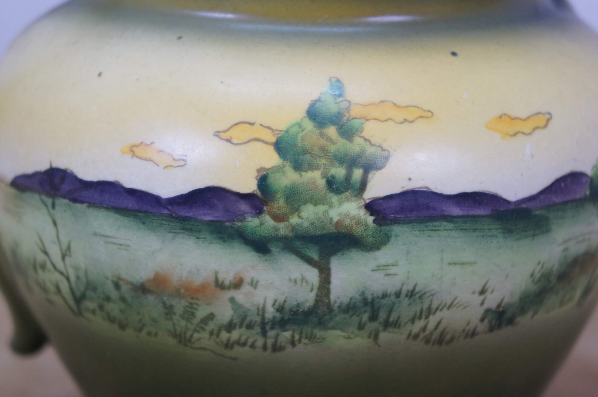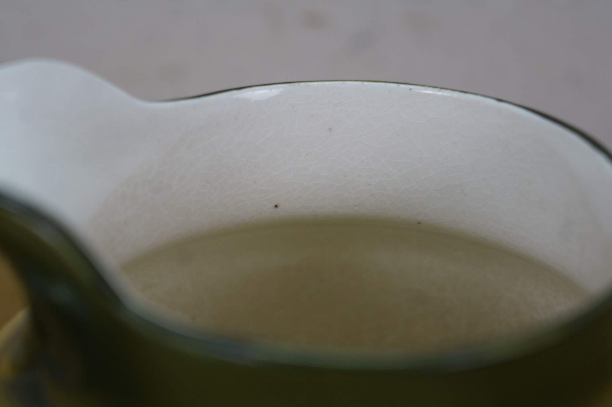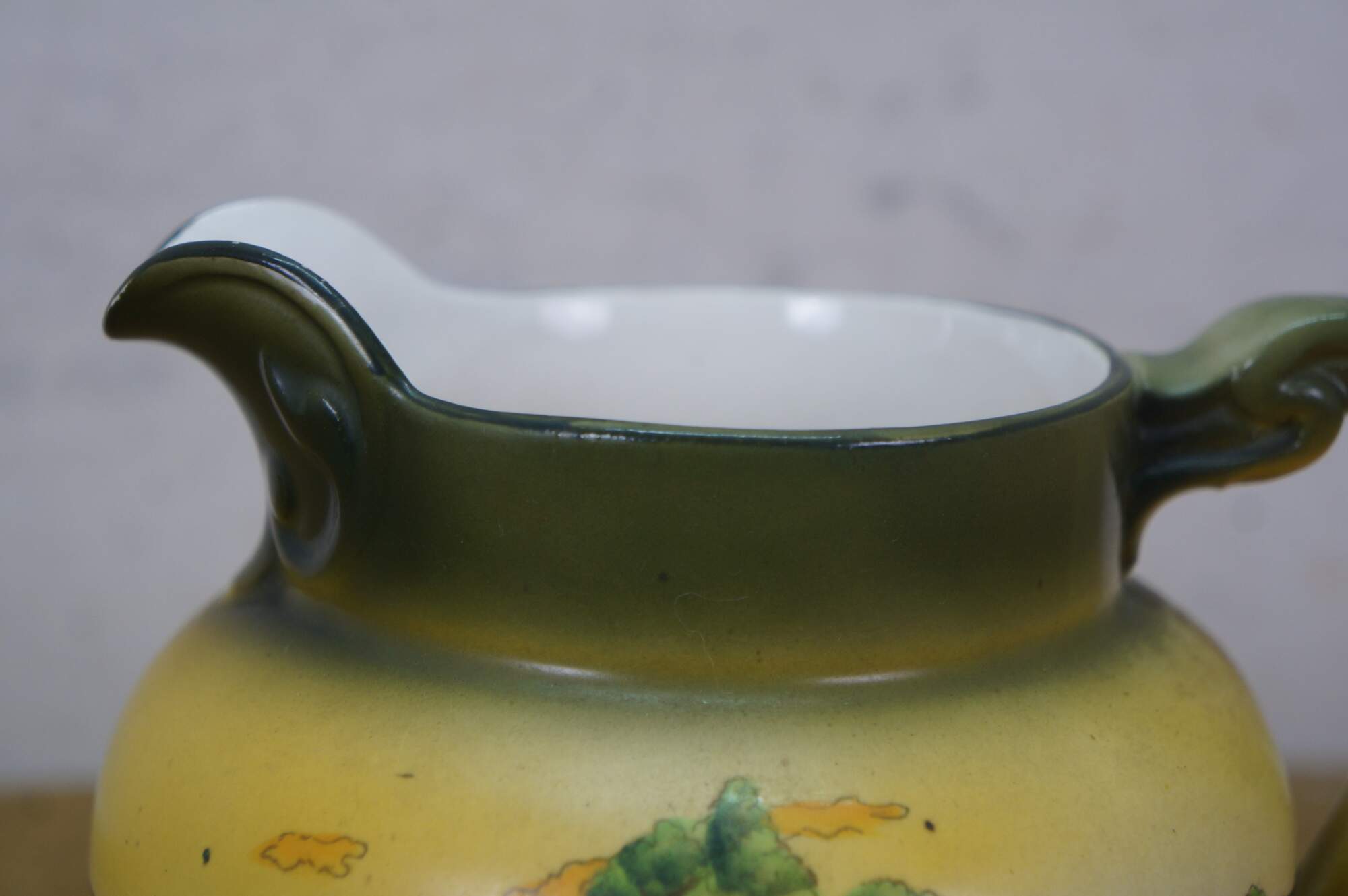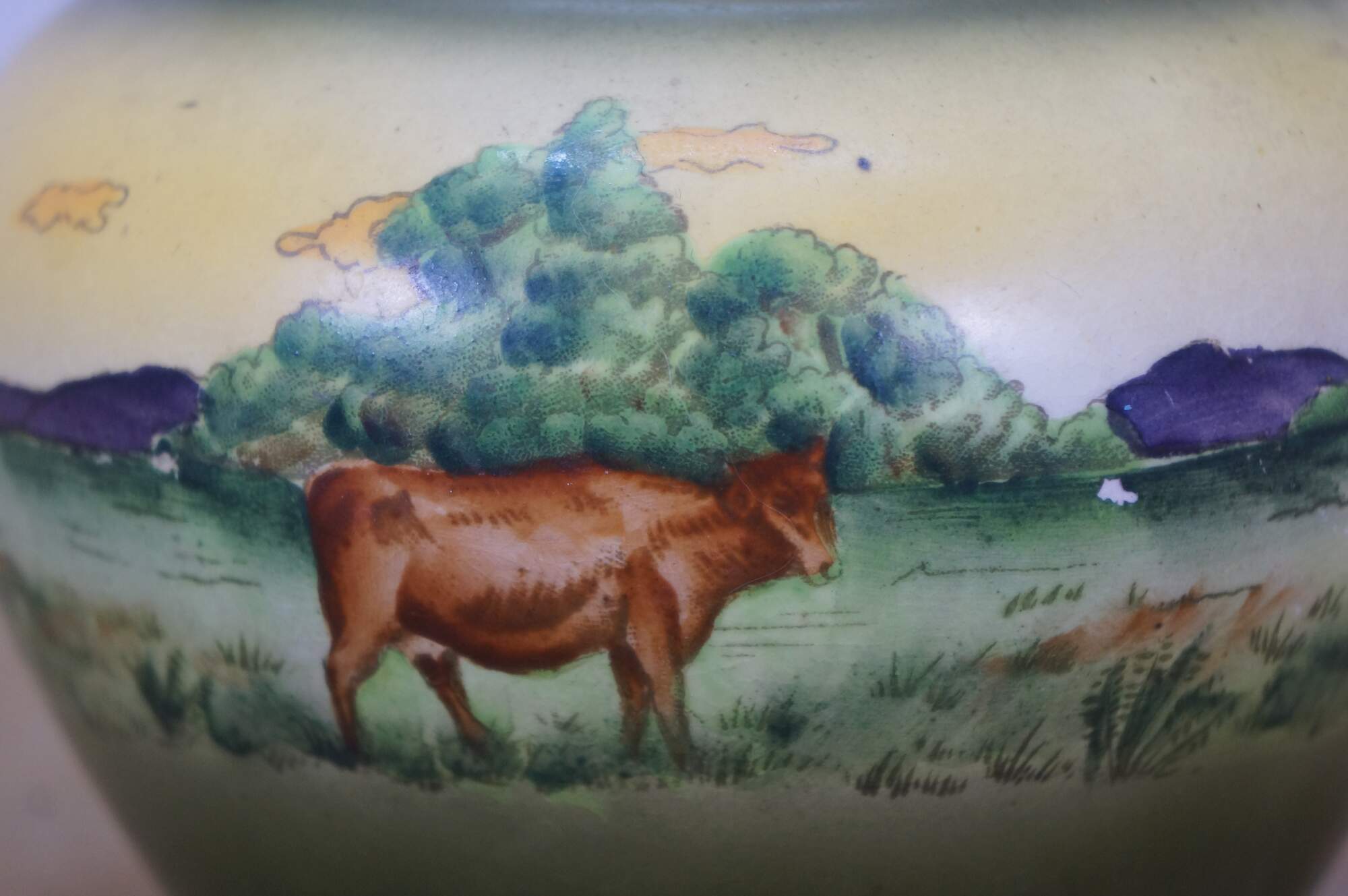 Late 19th to early 20th century porcelain Haynes Ware farmhouse cream pitcher by D.F. Haynes & company in the Cloverdale pattern. Fully decorated in green and yellow with a hand painted country landscape focused on a brown cow.