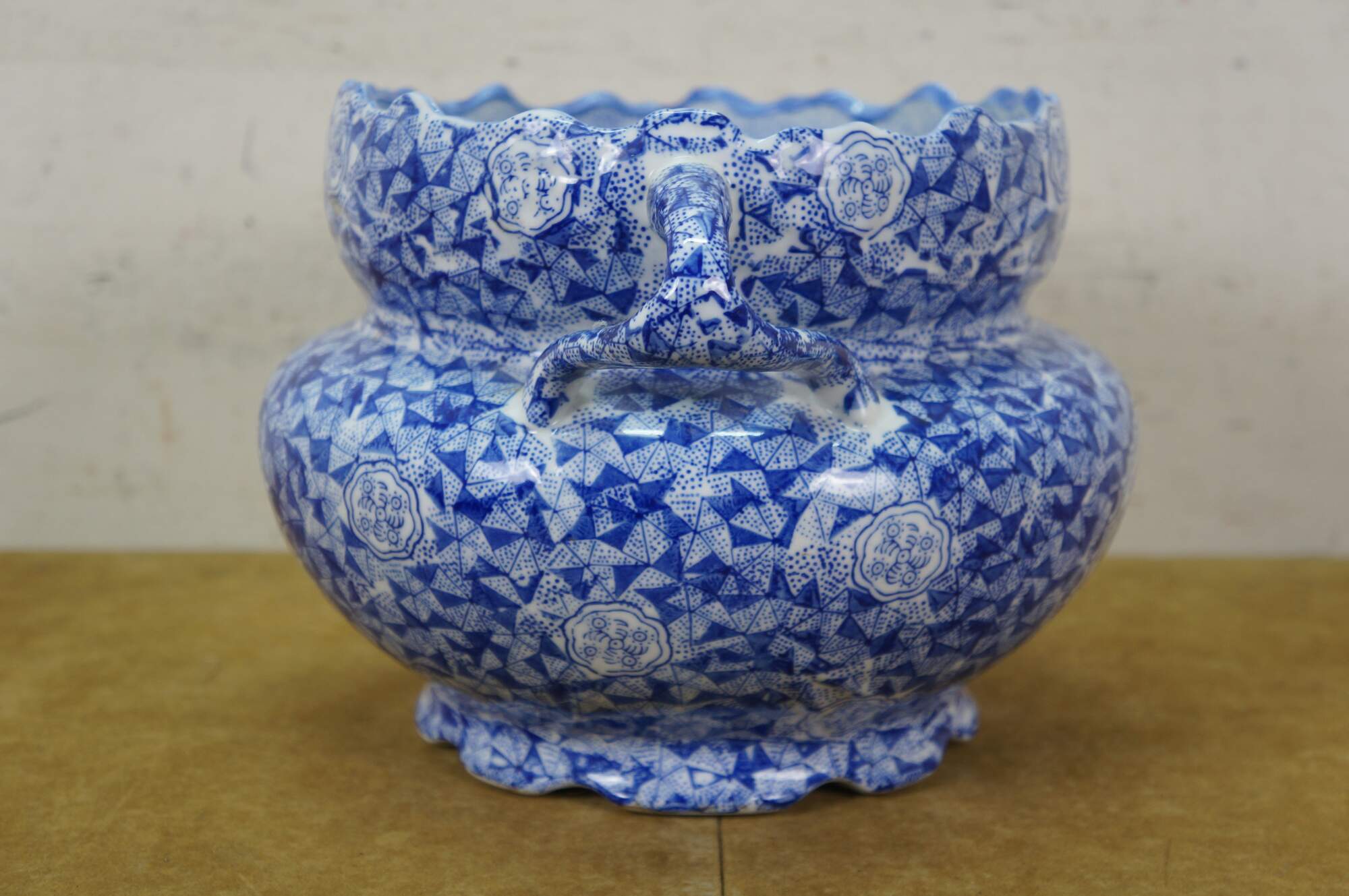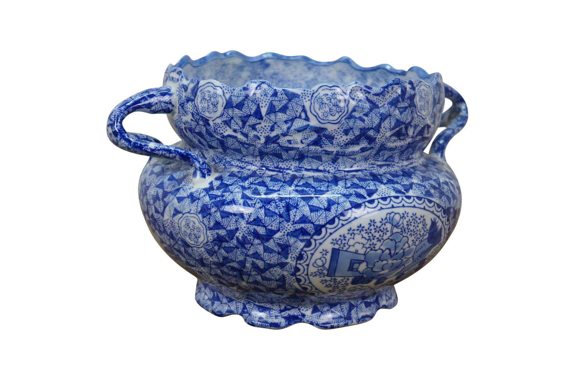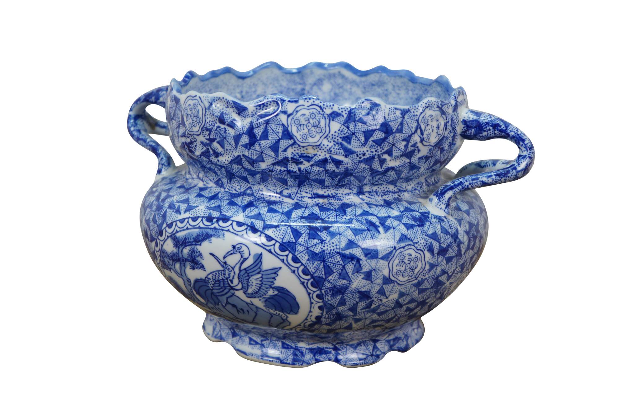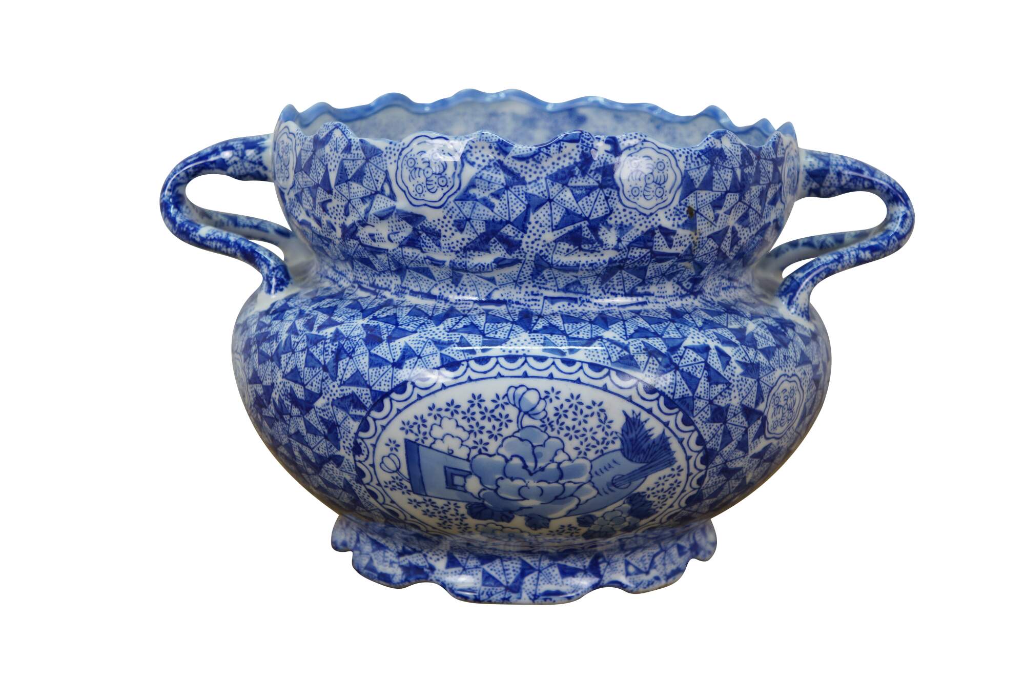 Late 20th century blue and white transferware porcelain cachepot / planter in the Delft style. Double handled with scalloped rim and footed base - decorated with Chinoiserie motifs including cranes by a gnarled pine and a still life of flowers, paint palette and book.
