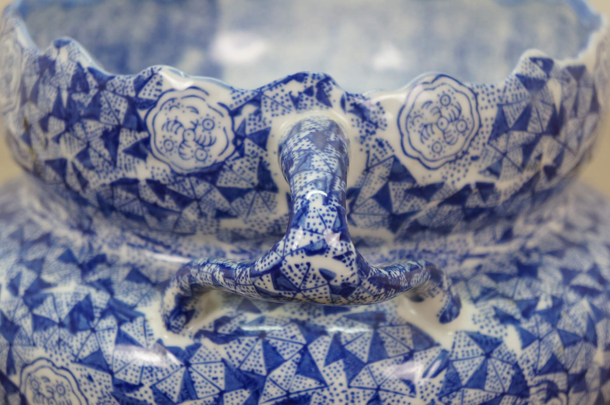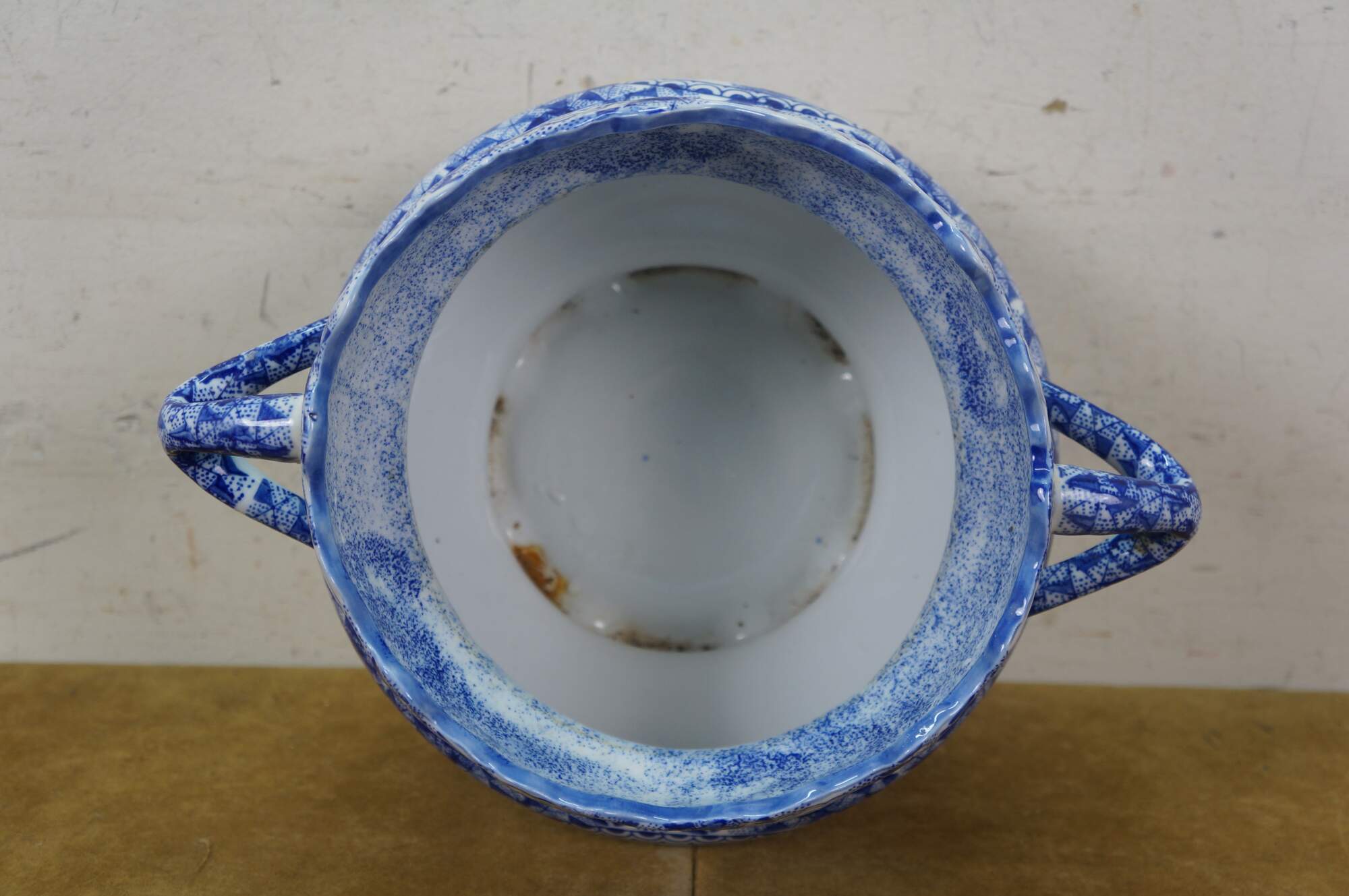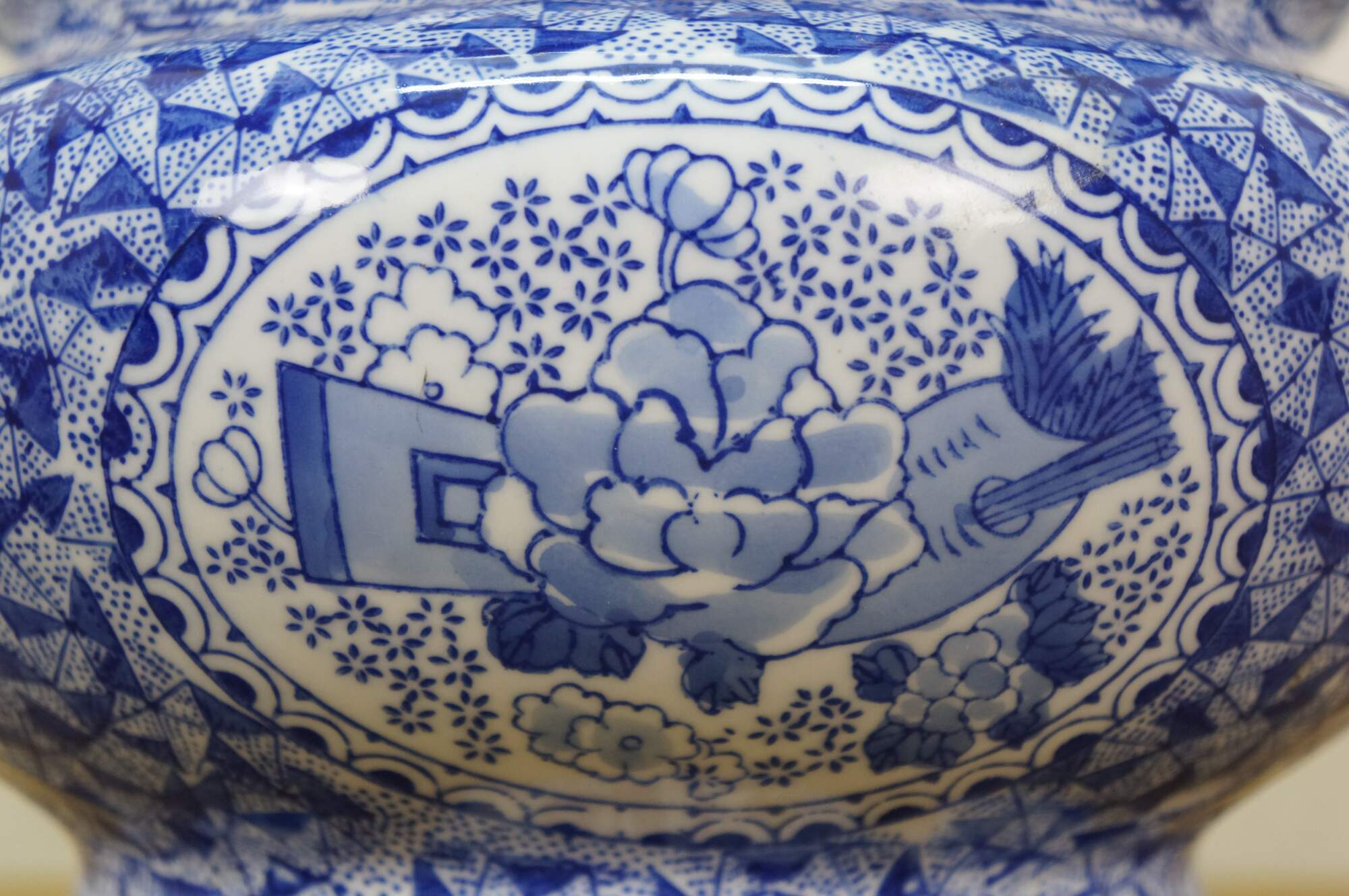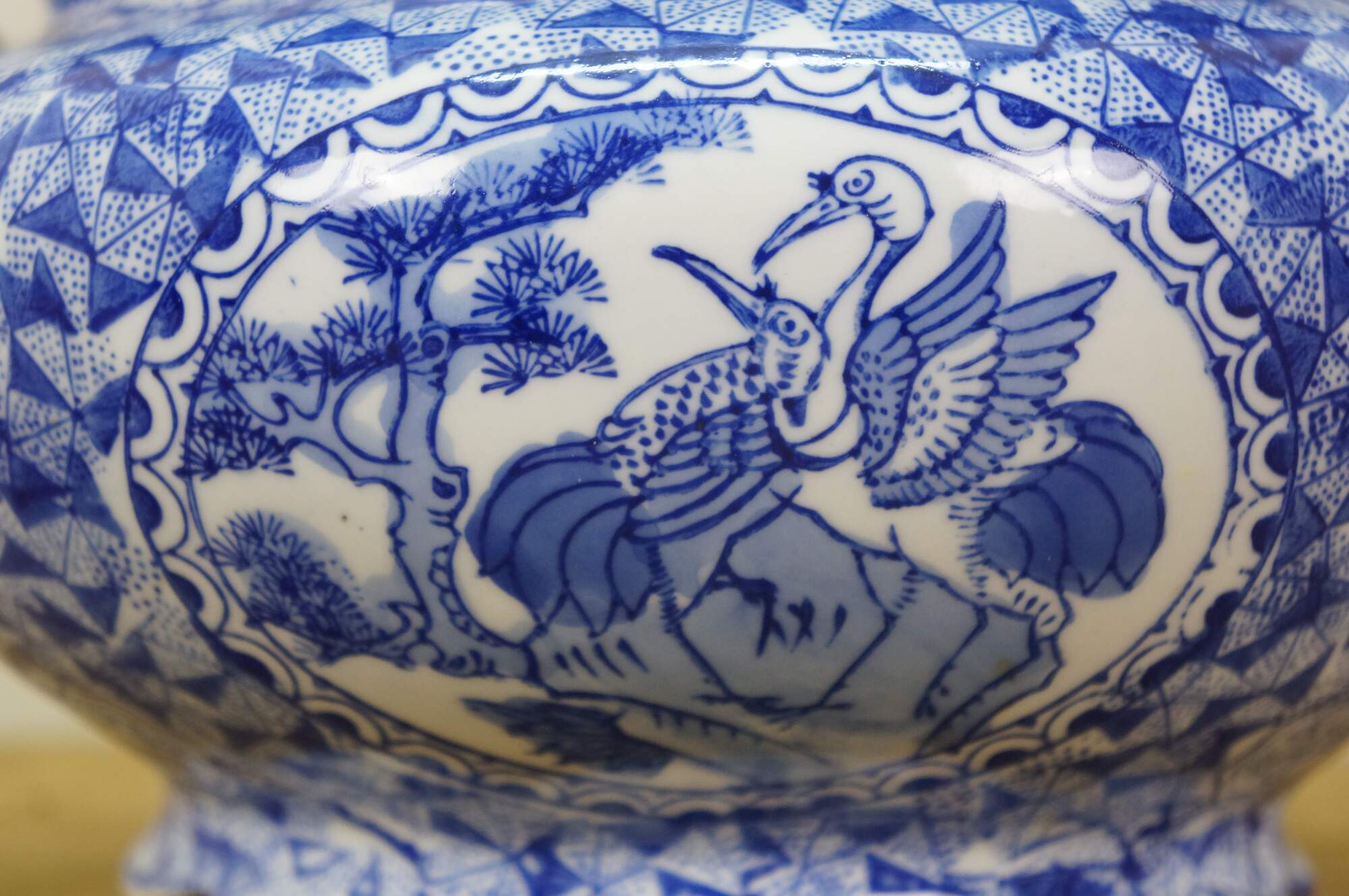 Late 20th century blue and white transferware porcelain cachepot / planter in the Delft style. Double handled with scalloped rim and footed base - decorated with Chinoiserie motifs including cranes by a gnarled pine and a still life of flowers, paint palette and book.