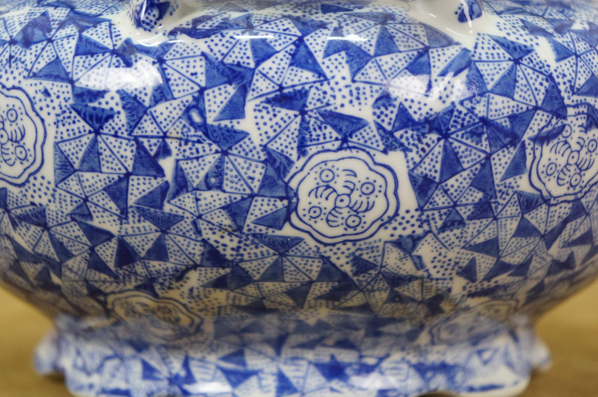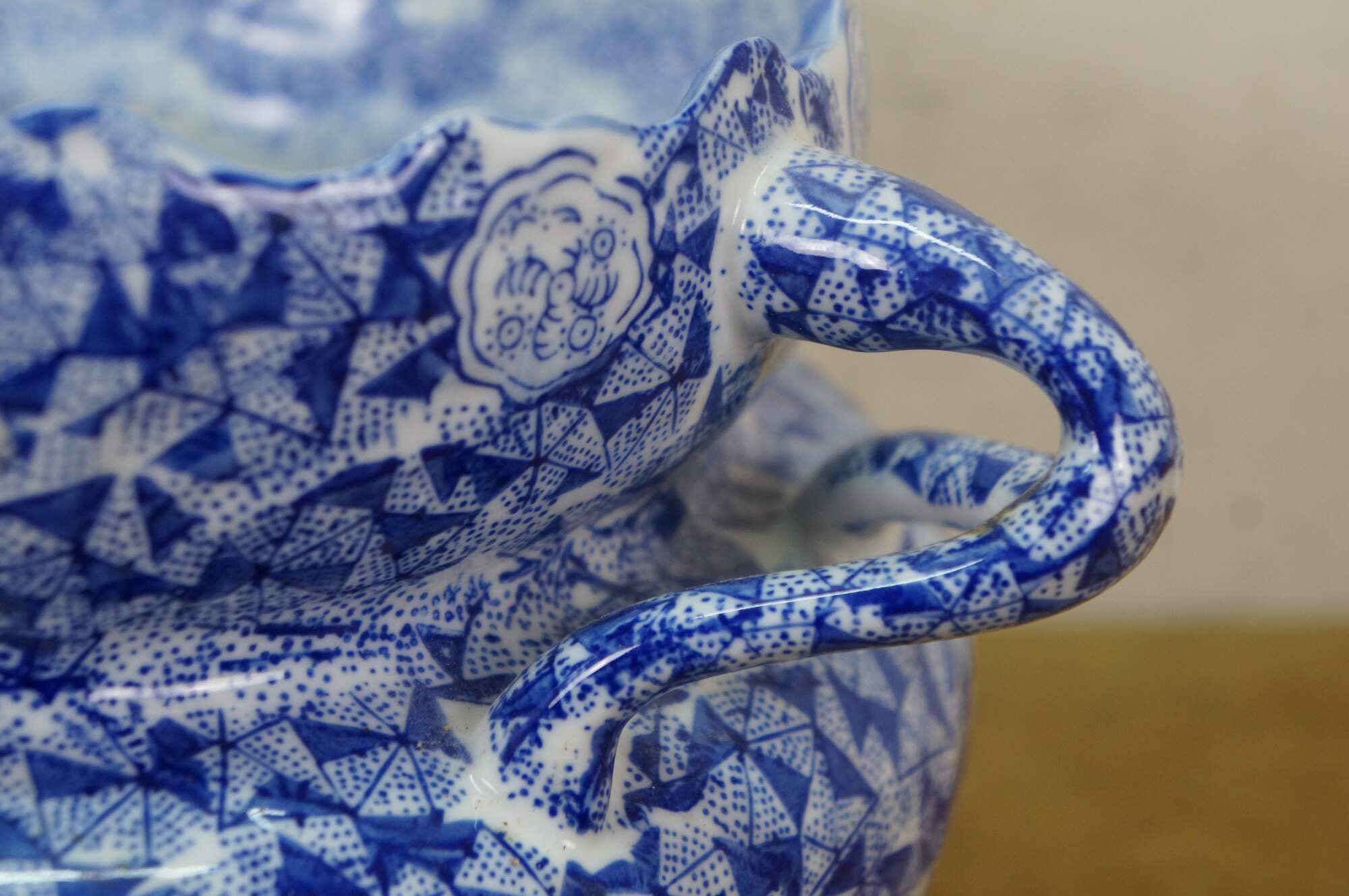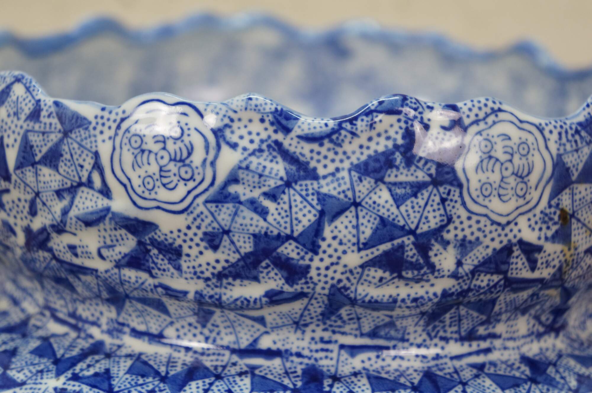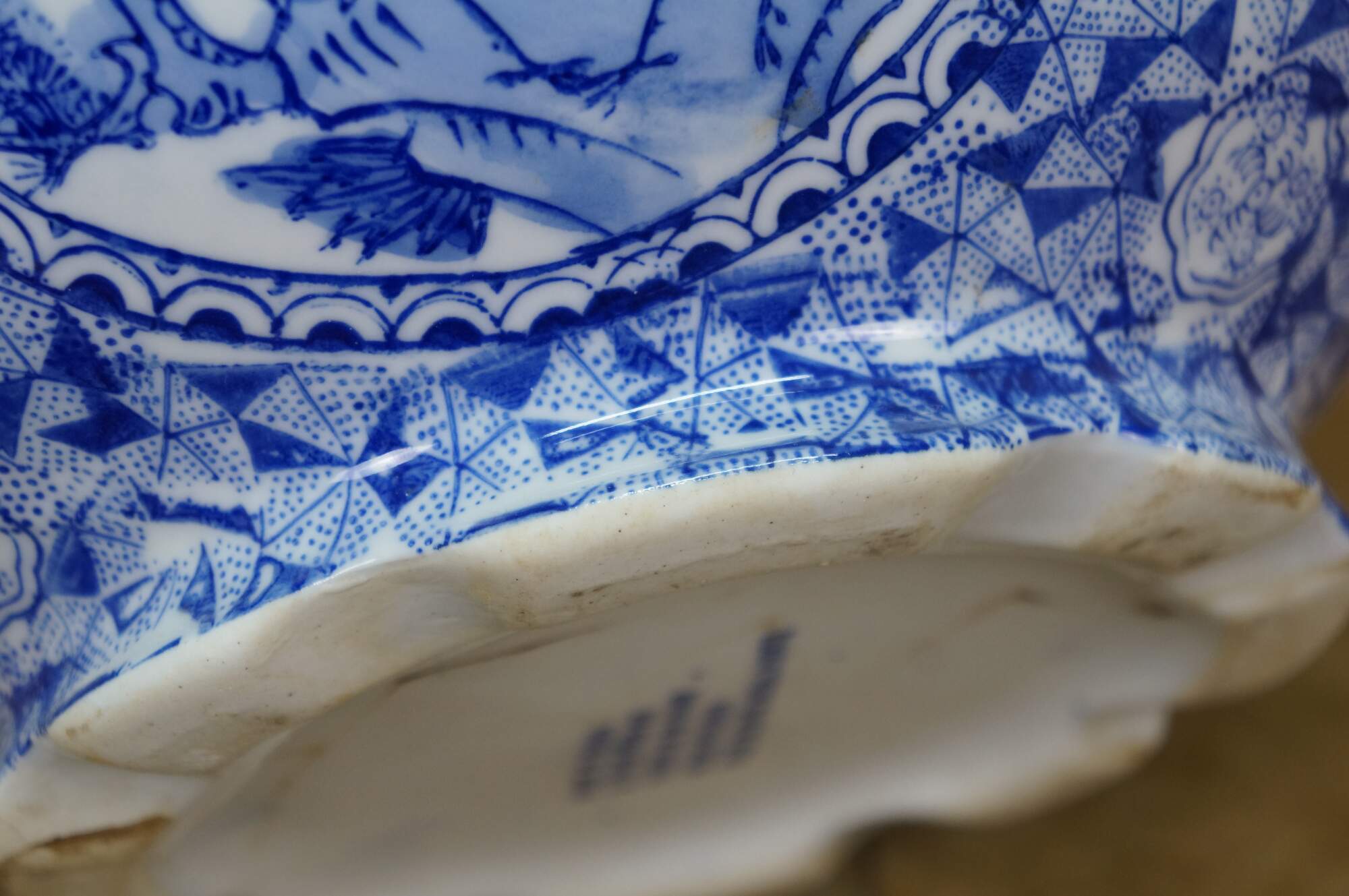 Late 20th century blue and white transferware porcelain cachepot / planter in the Delft style. Double handled with scalloped rim and footed base - decorated with Chinoiserie motifs including cranes by a gnarled pine and a still life of flowers, paint palette and book.