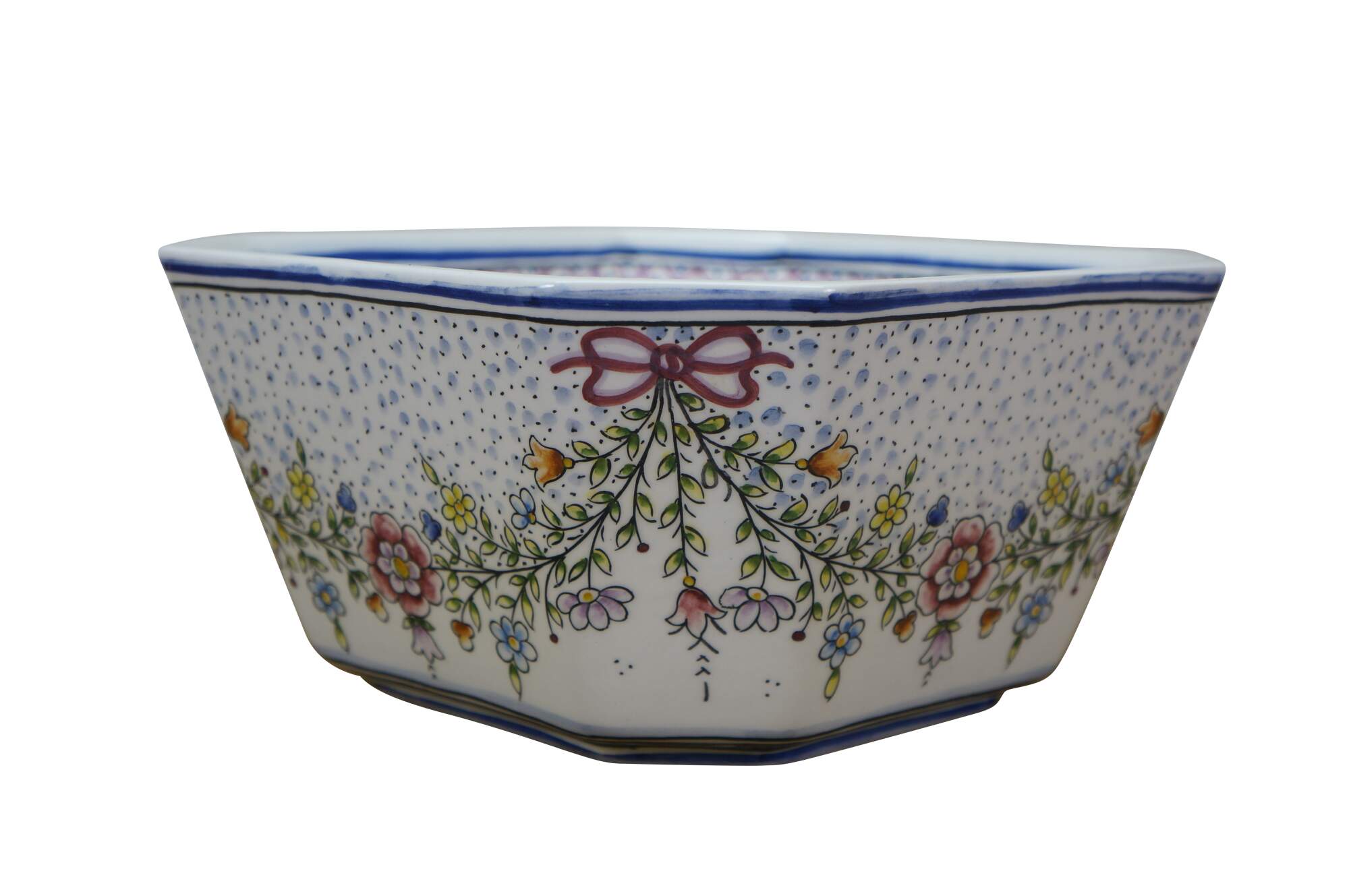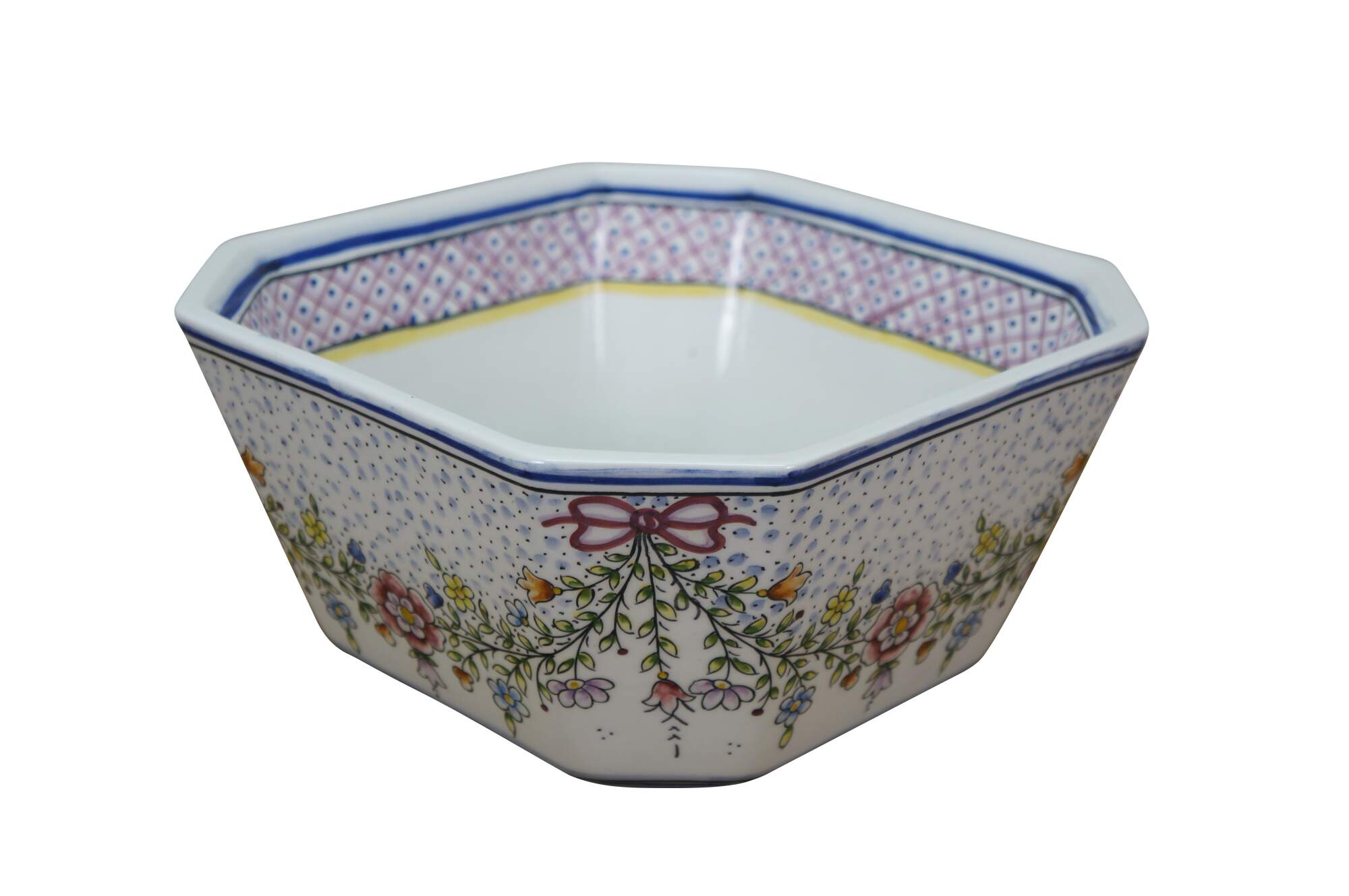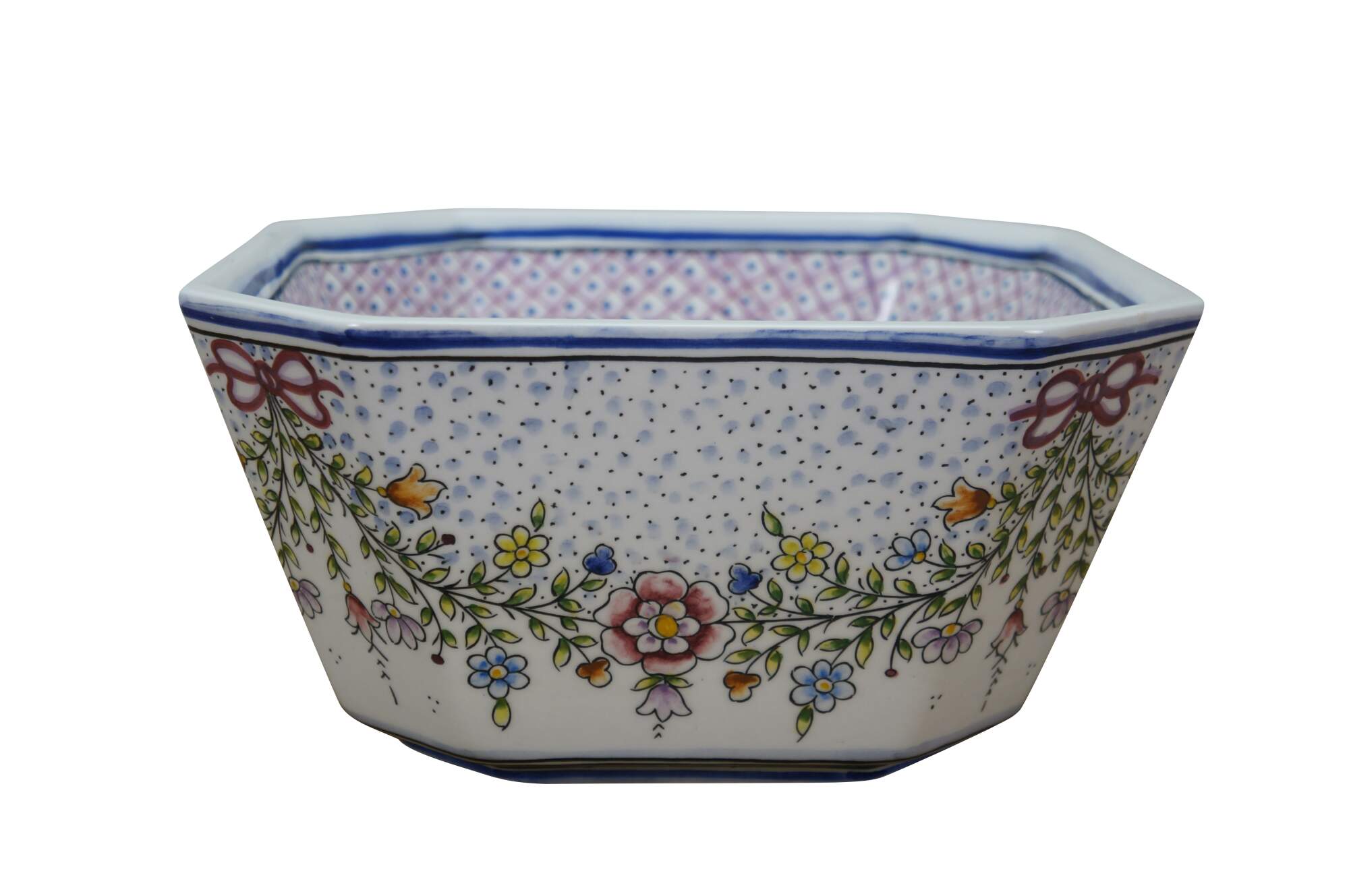 Late 20th century Portuguese ceramic faience bowl. White porcelain hand decorated with blue and pink geometric bands on the inside edge, and garland swags of flowers tied with ribbons outside. Octagonal form. 170 - Arte Ceramica - Arcer - Coimbra Portugal - Sec. XVII - Hand Painted - AMD Z.