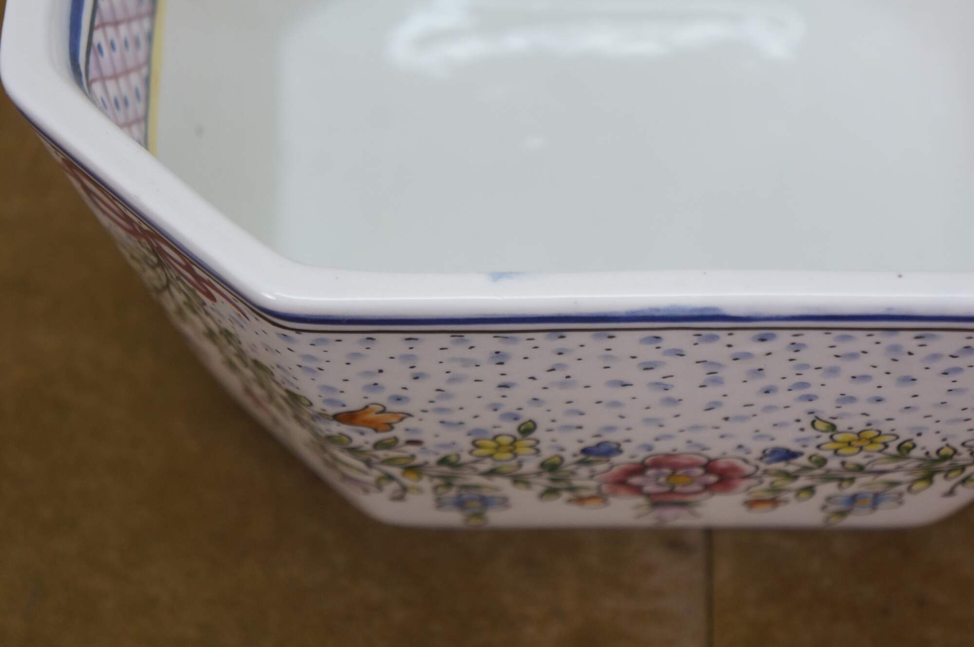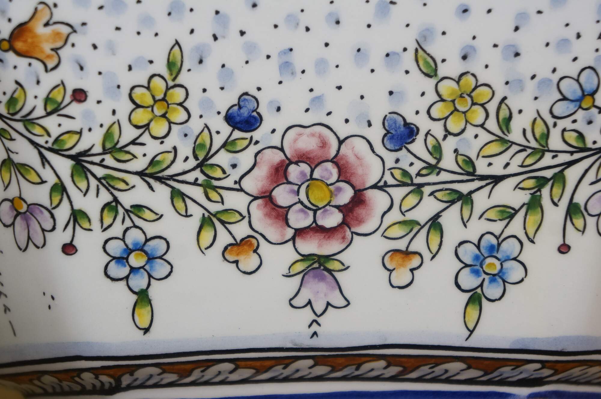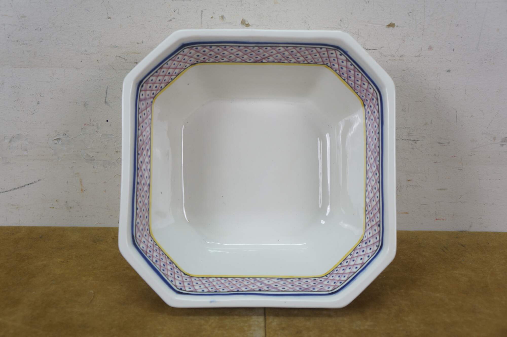 Late 20th century Portuguese ceramic faience bowl. White porcelain hand decorated with blue and pink geometric bands on the inside edge, and garland swags of flowers tied with ribbons outside. Octagonal form. 170 - Arte Ceramica - Arcer - Coimbra Portugal - Sec. XVII - Hand Painted - AMD Z.