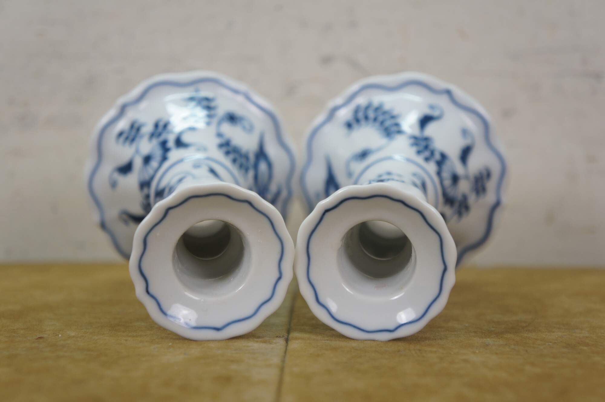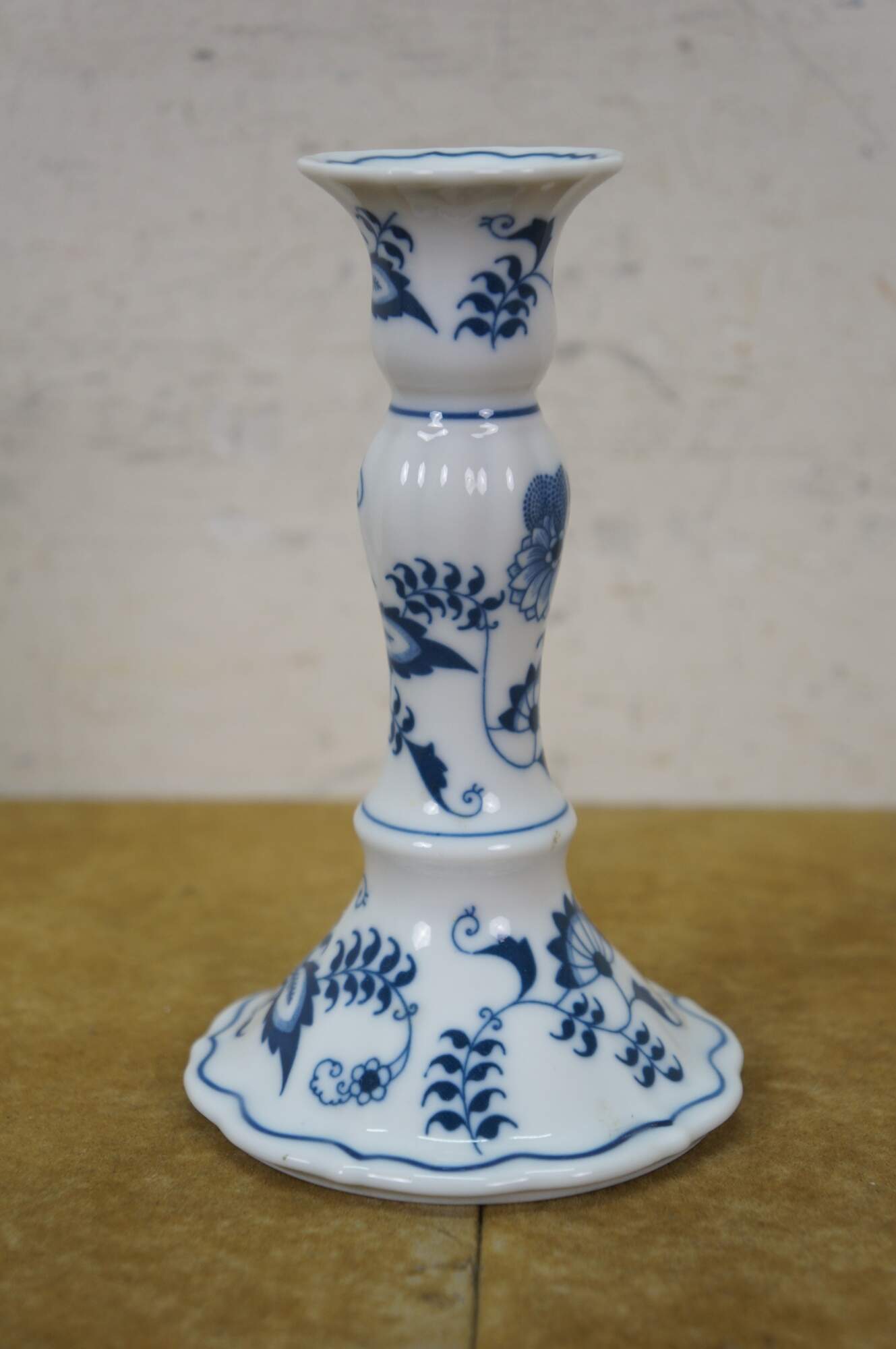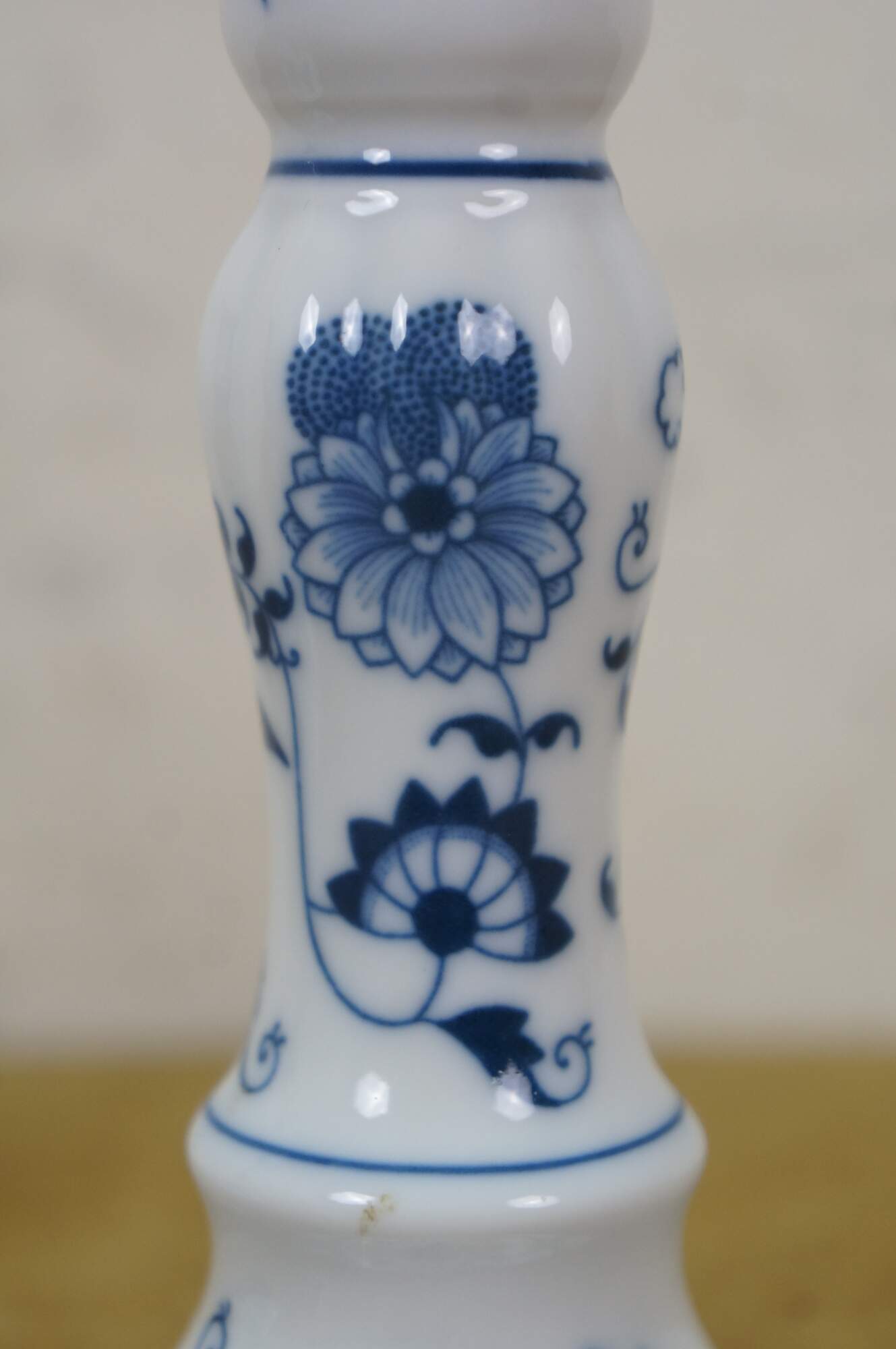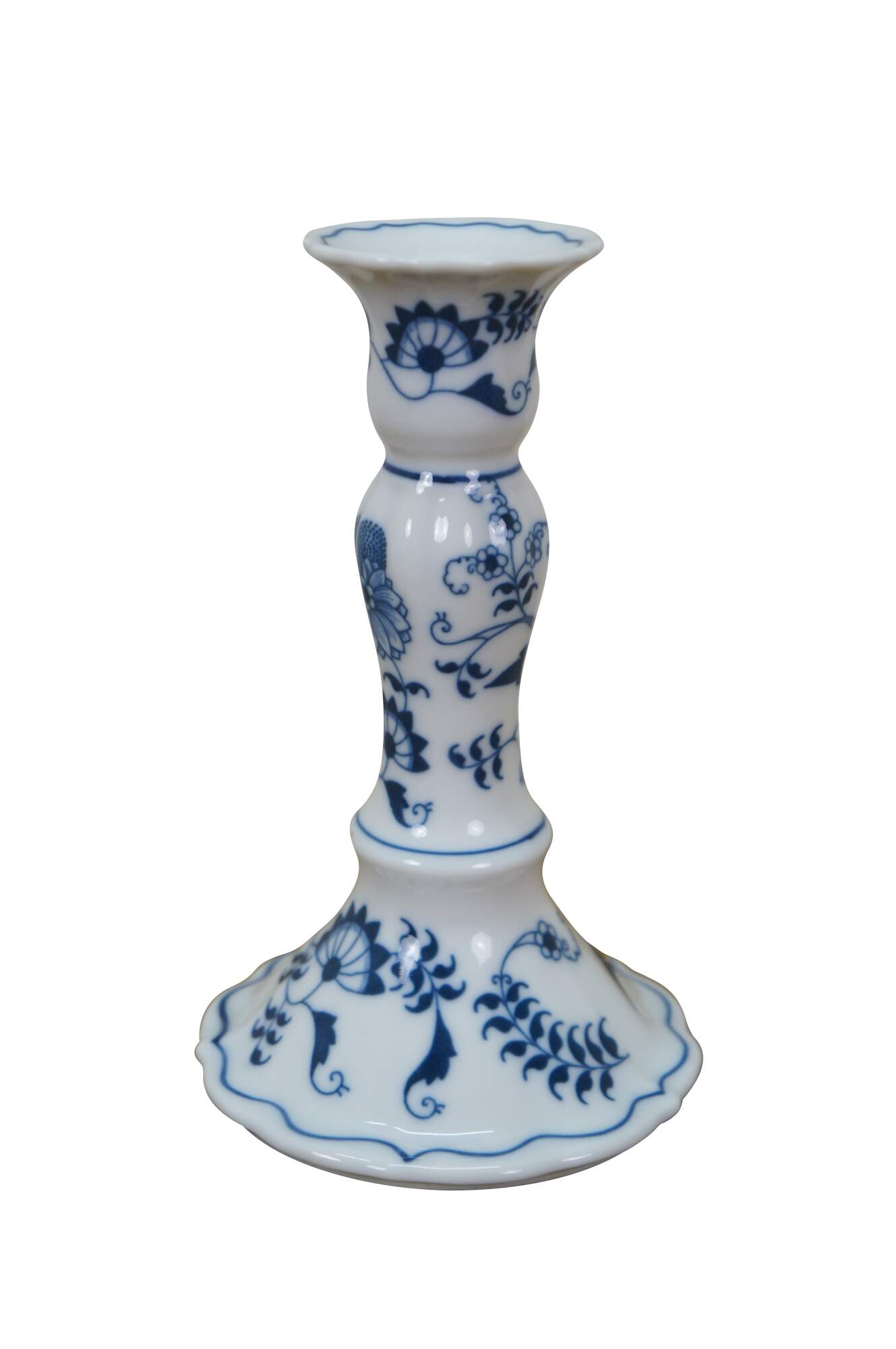 Pair of late 20th century Blue Danube porcelain taper candlestick holders. White porcelain with blue onion inspired floral and foliate design. Made in Japan.
