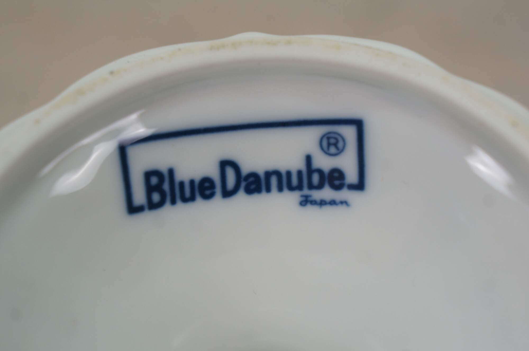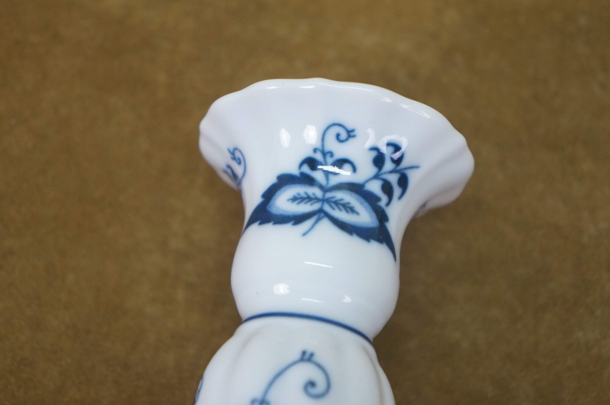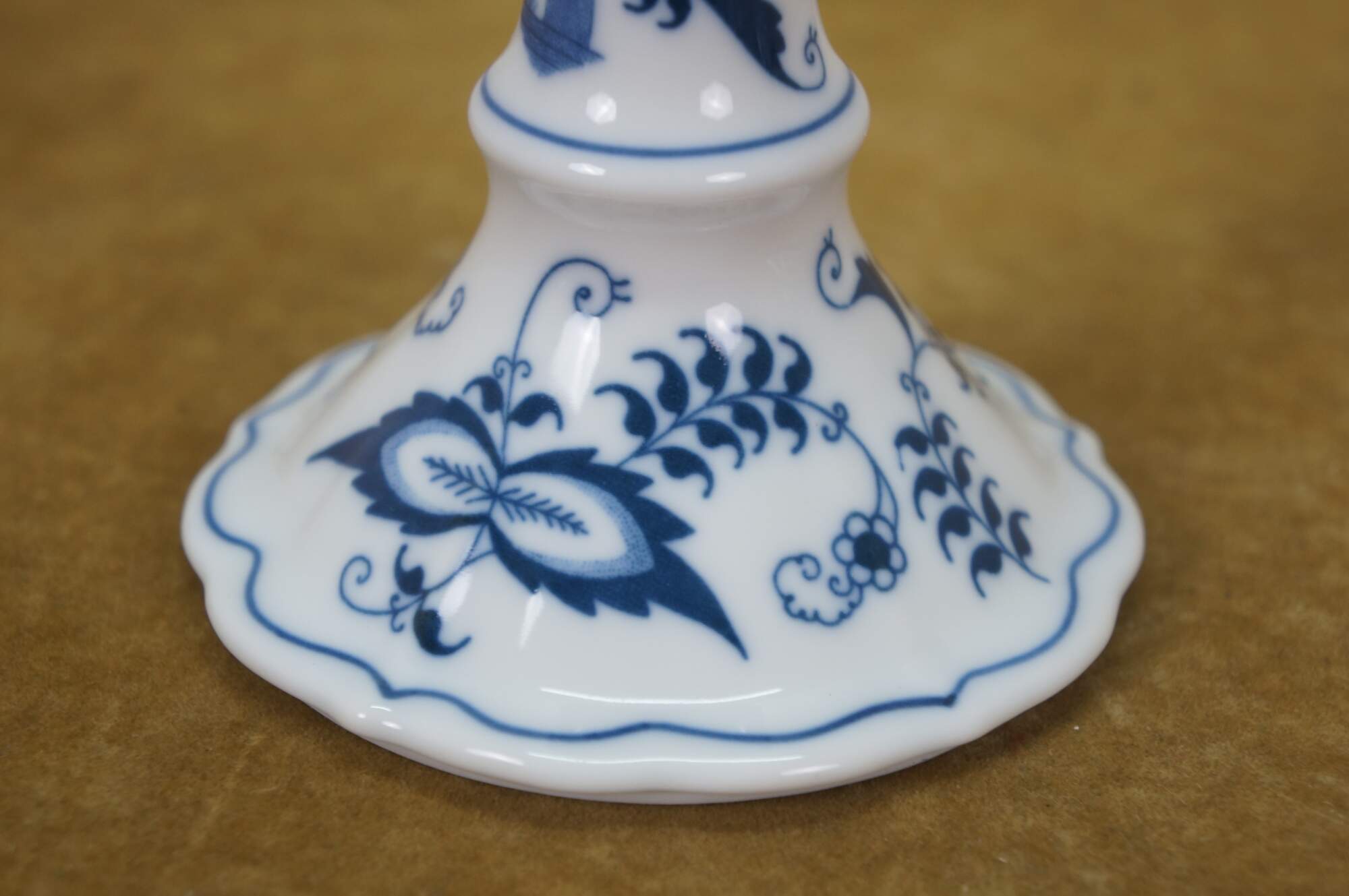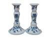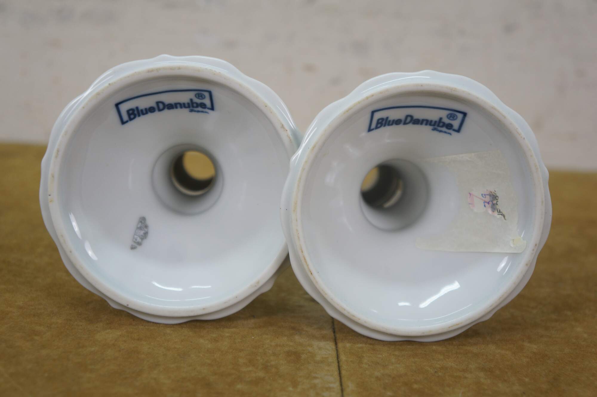 Pair of late 20th century Blue Danube porcelain taper candlestick holders. White porcelain with blue onion inspired floral and foliate design. Made in Japan.
