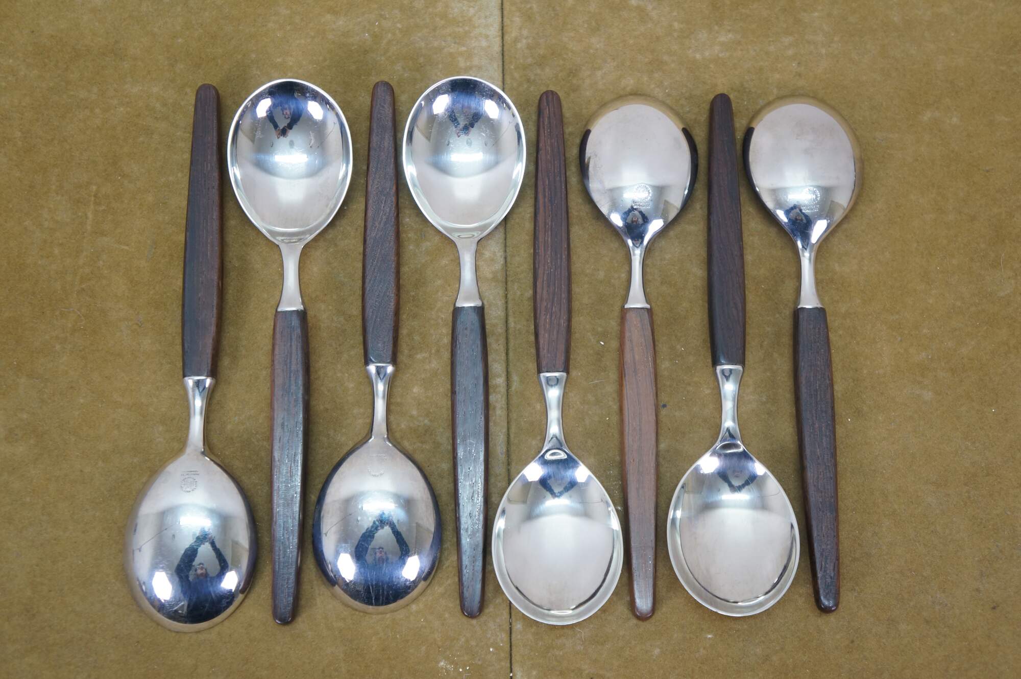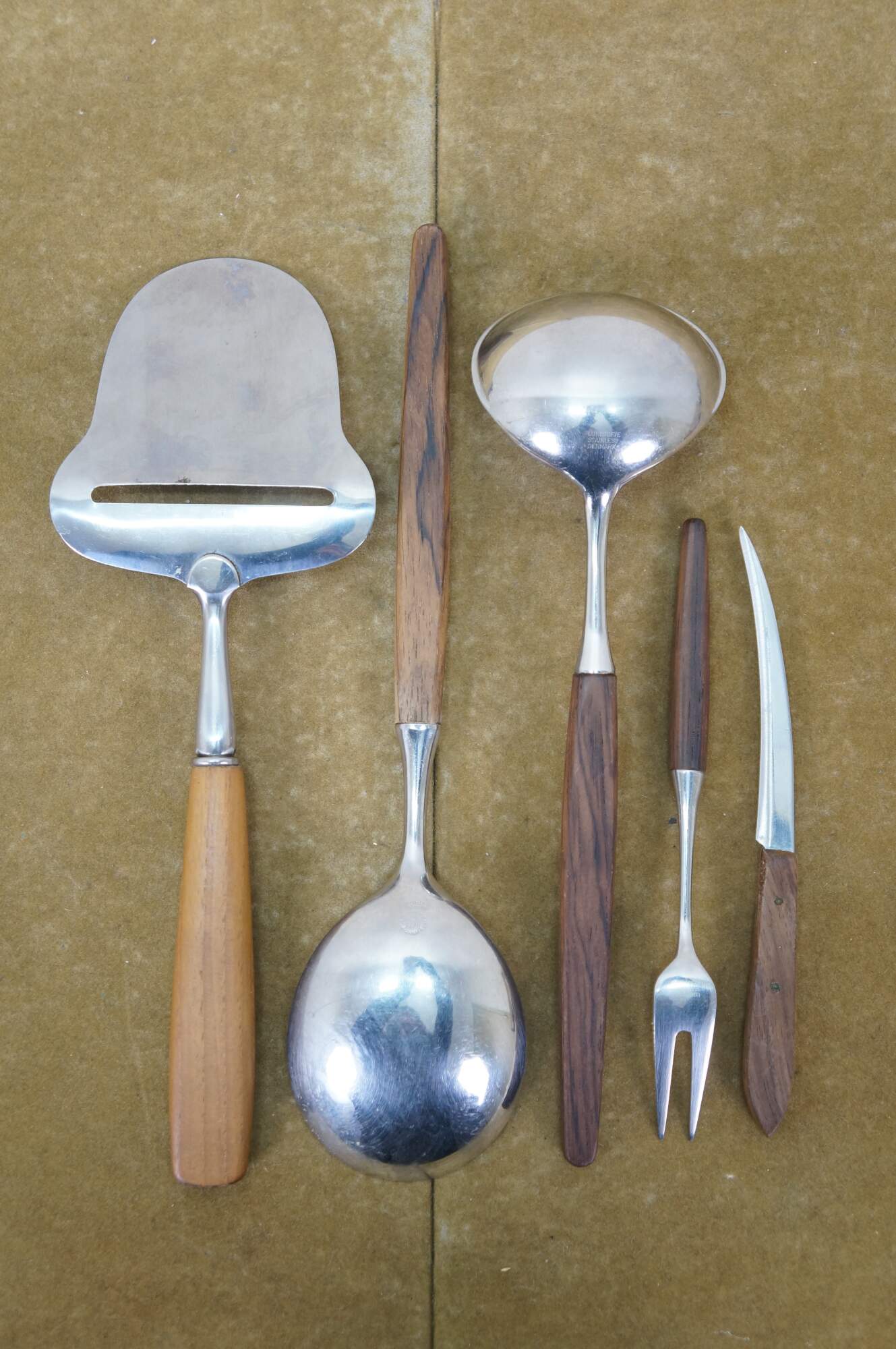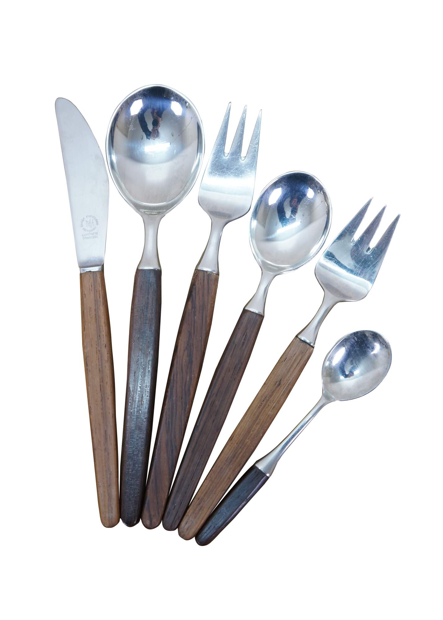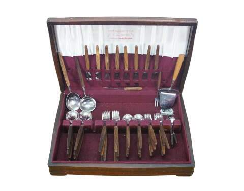 Mid to late 20th century Dansk Designs wood handled flatware / serving utensils designed by Tias Eckhoff and including some mismatched pieces. Majority are made in Lundtofte, Denmark. Includes: Cheese Server, Serving Spoon, Sauce Ladle, Cheese Knife, Cocktail Fork, 8 Knives, 8 Table Spoons, 8 Dinner Forks, 8 Tea Spoons, 4 Demitasse Spoons, and Rogers Bros tarnish resistant wood storage chest. Cheese server and cheese knife by other manufacturers.