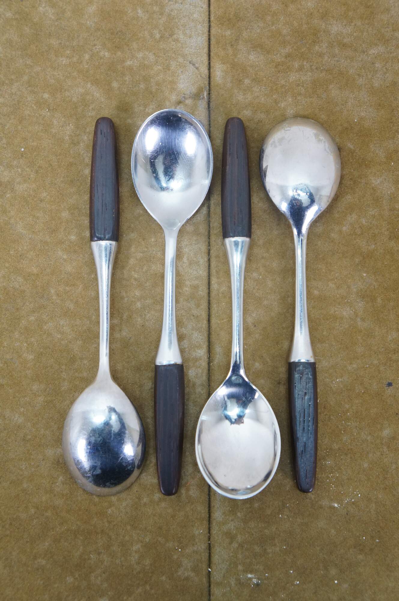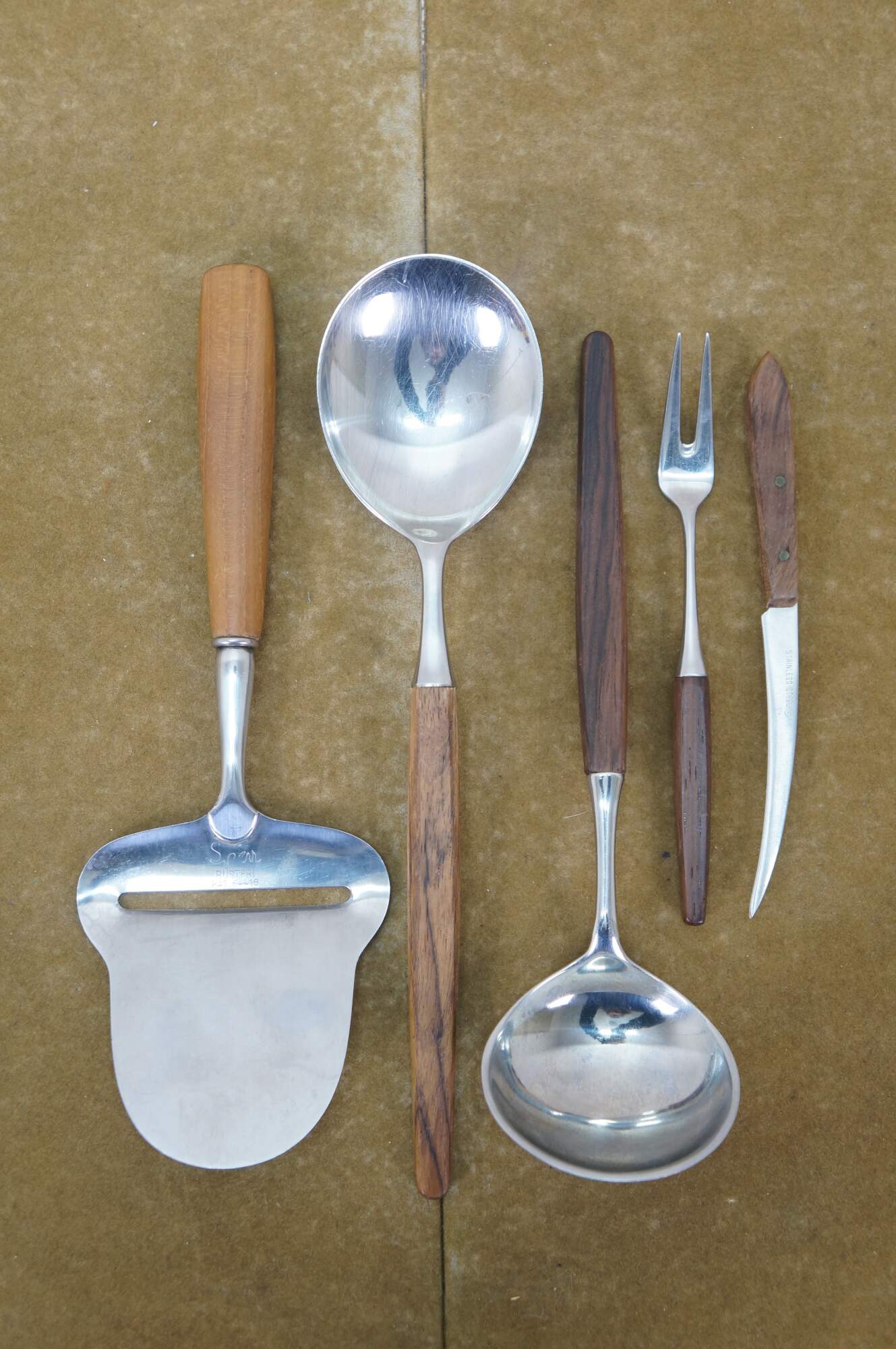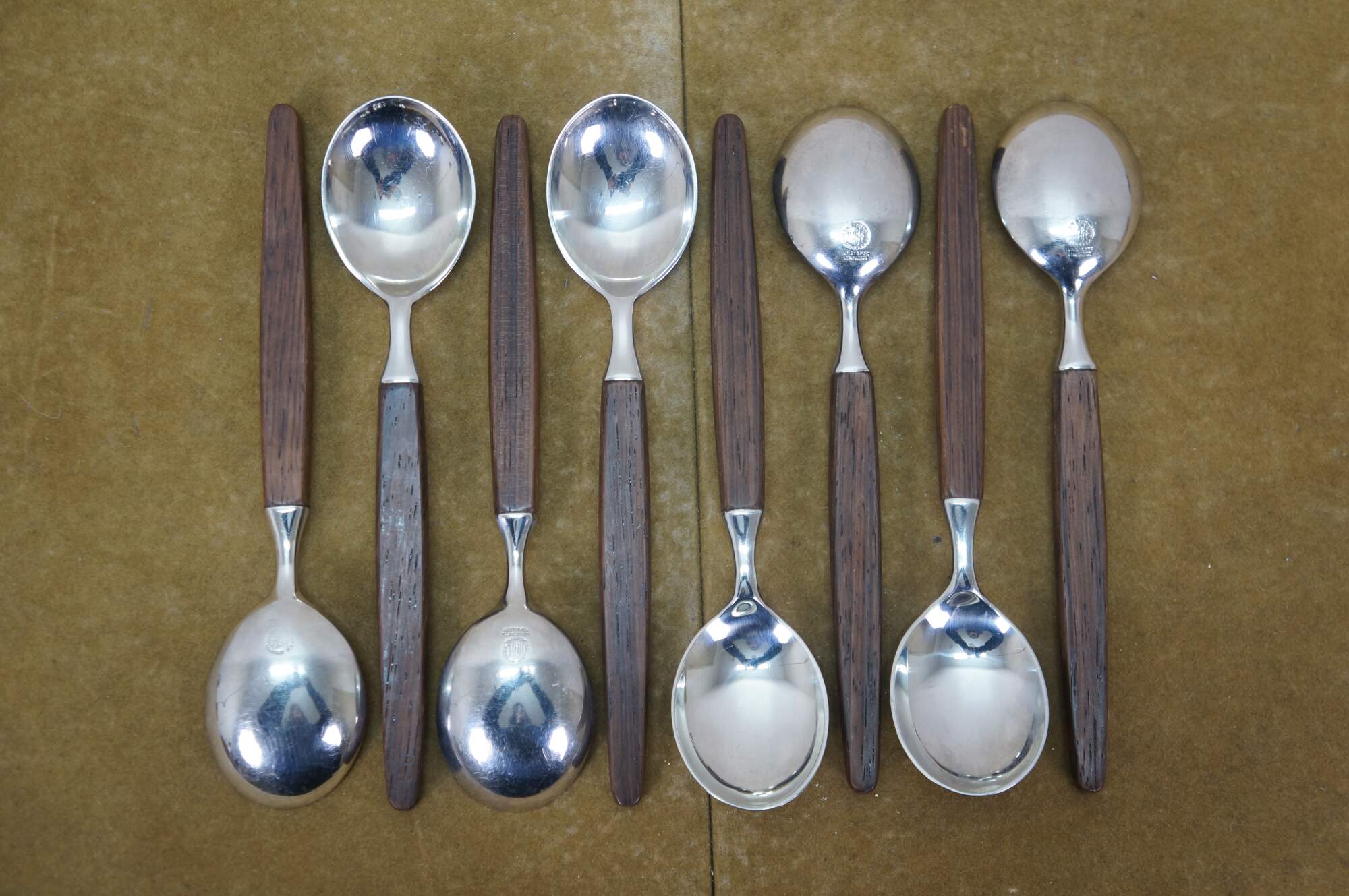 Mid to late 20th century Dansk Designs wood handled flatware / serving utensils designed by Tias Eckhoff and including some mismatched pieces. Majority are made in Lundtofte, Denmark. Includes: Cheese Server, Serving Spoon, Sauce Ladle, Cheese Knife, Cocktail Fork, 8 Knives, 8 Table Spoons, 8 Dinner Forks, 8 Tea Spoons, 4 Demitasse Spoons, and Rogers Bros tarnish resistant wood storage chest. Cheese server and cheese knife by other manufacturers.