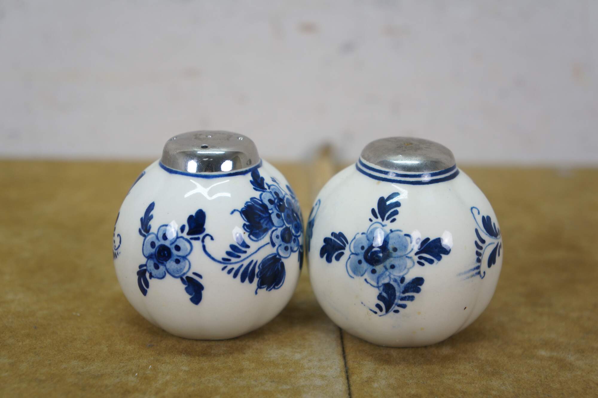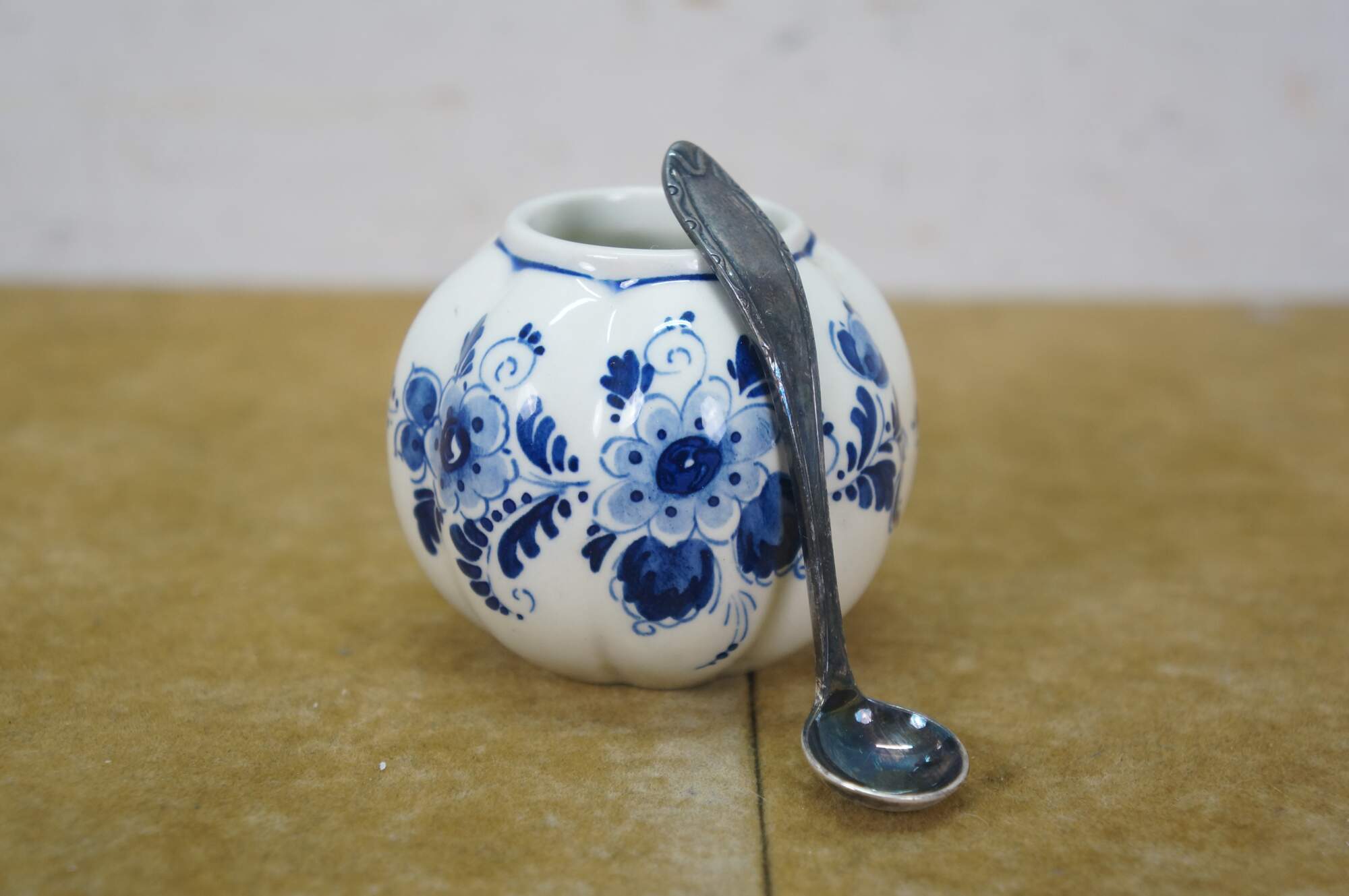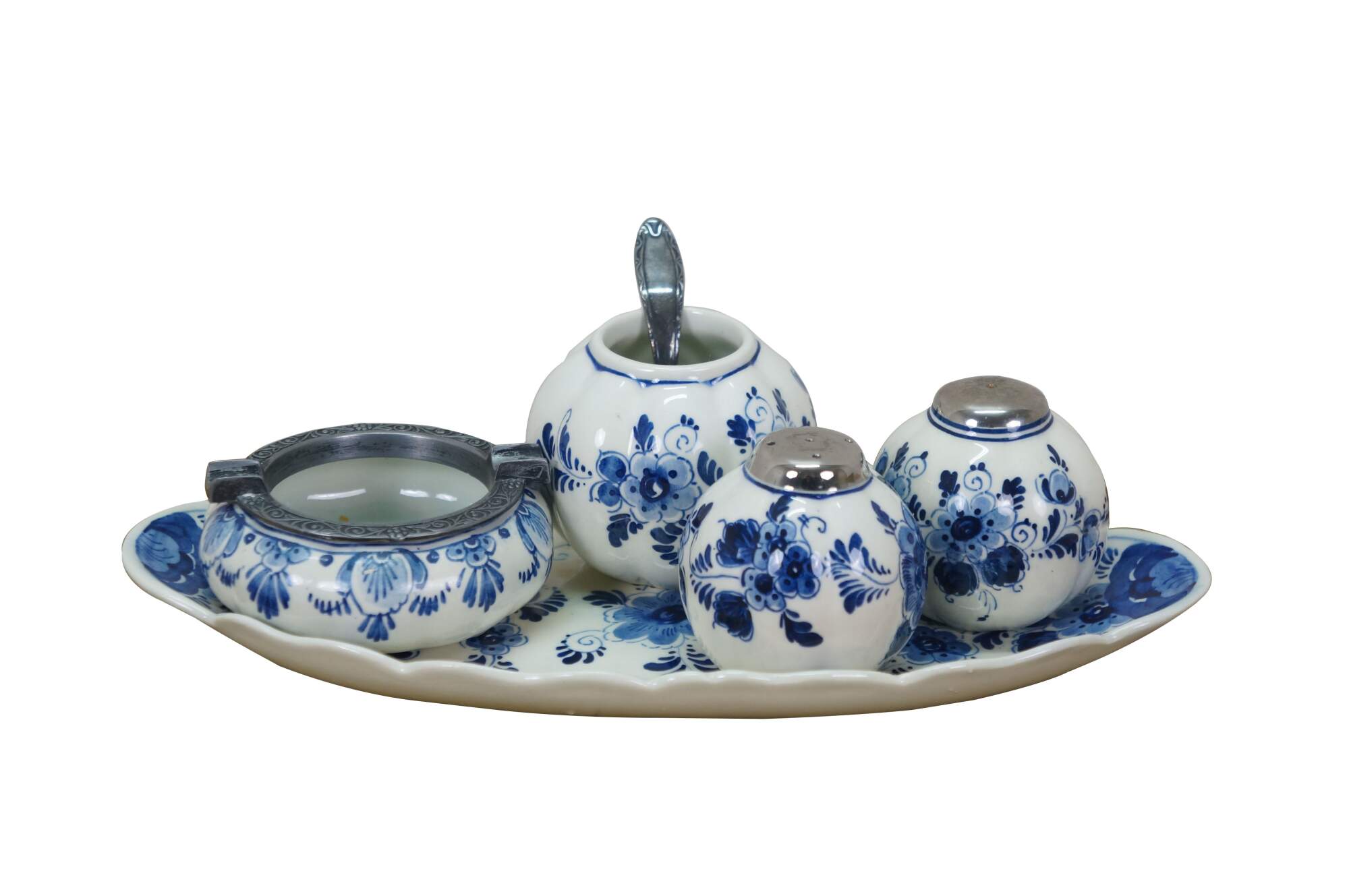 Vintage 20th century set of six pieces of Delfts Blauw hand painted blue and white floral porcelain tableware. Made in Holland. Includes: Tray / underplate, ashtray with two cigarette rests, salt and pepper shakers, and a jam pot with silverplate spoon.