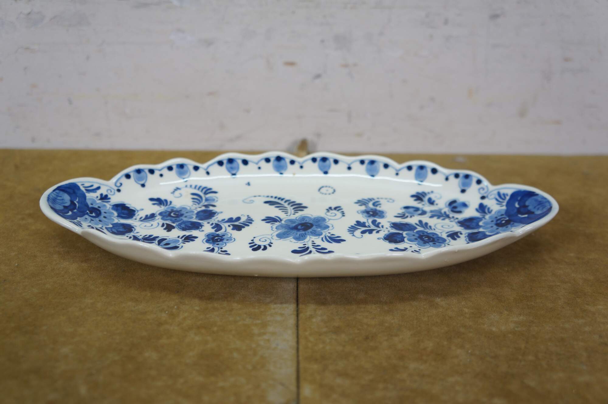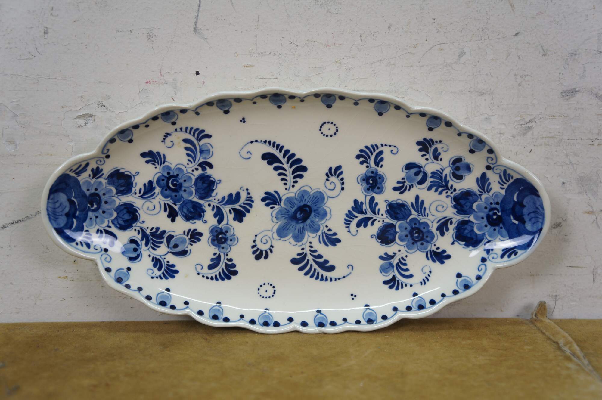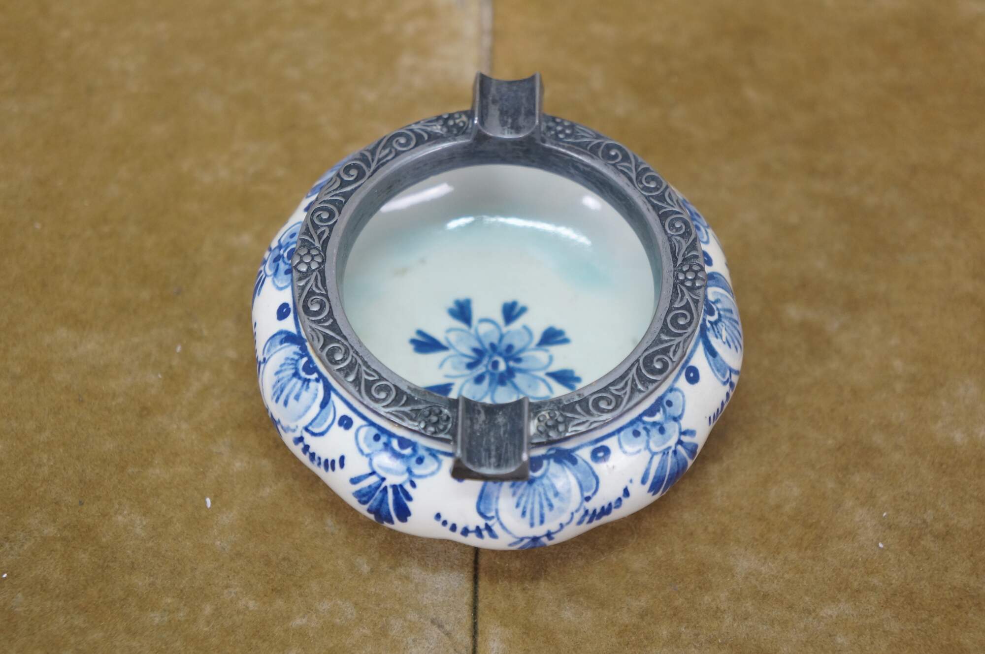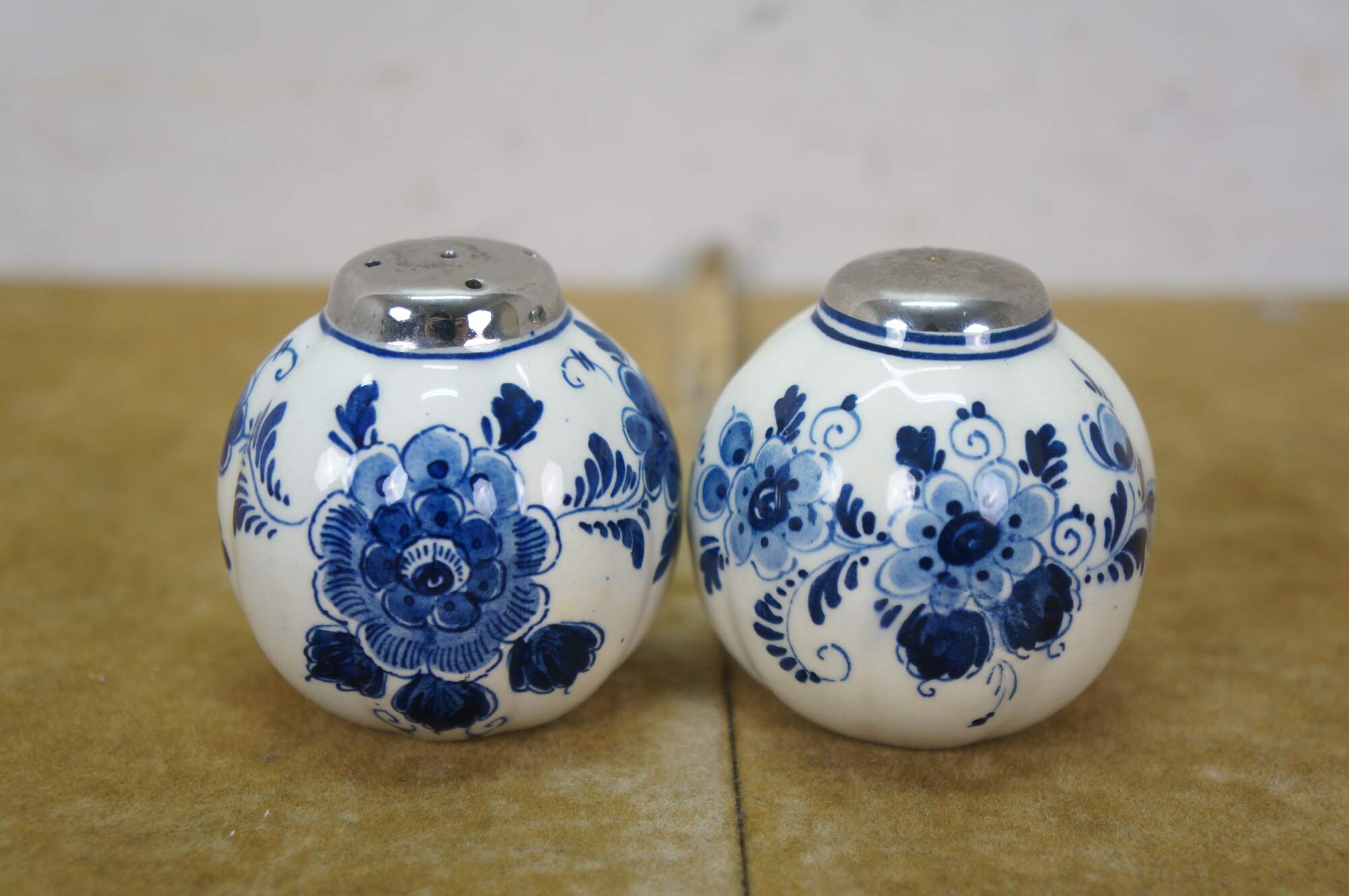 Vintage 20th century set of six pieces of Delfts Blauw hand painted blue and white floral porcelain tableware. Made in Holland. Includes: Tray / underplate, ashtray with two cigarette rests, salt and pepper shakers, and a jam pot with silverplate spoon.