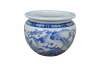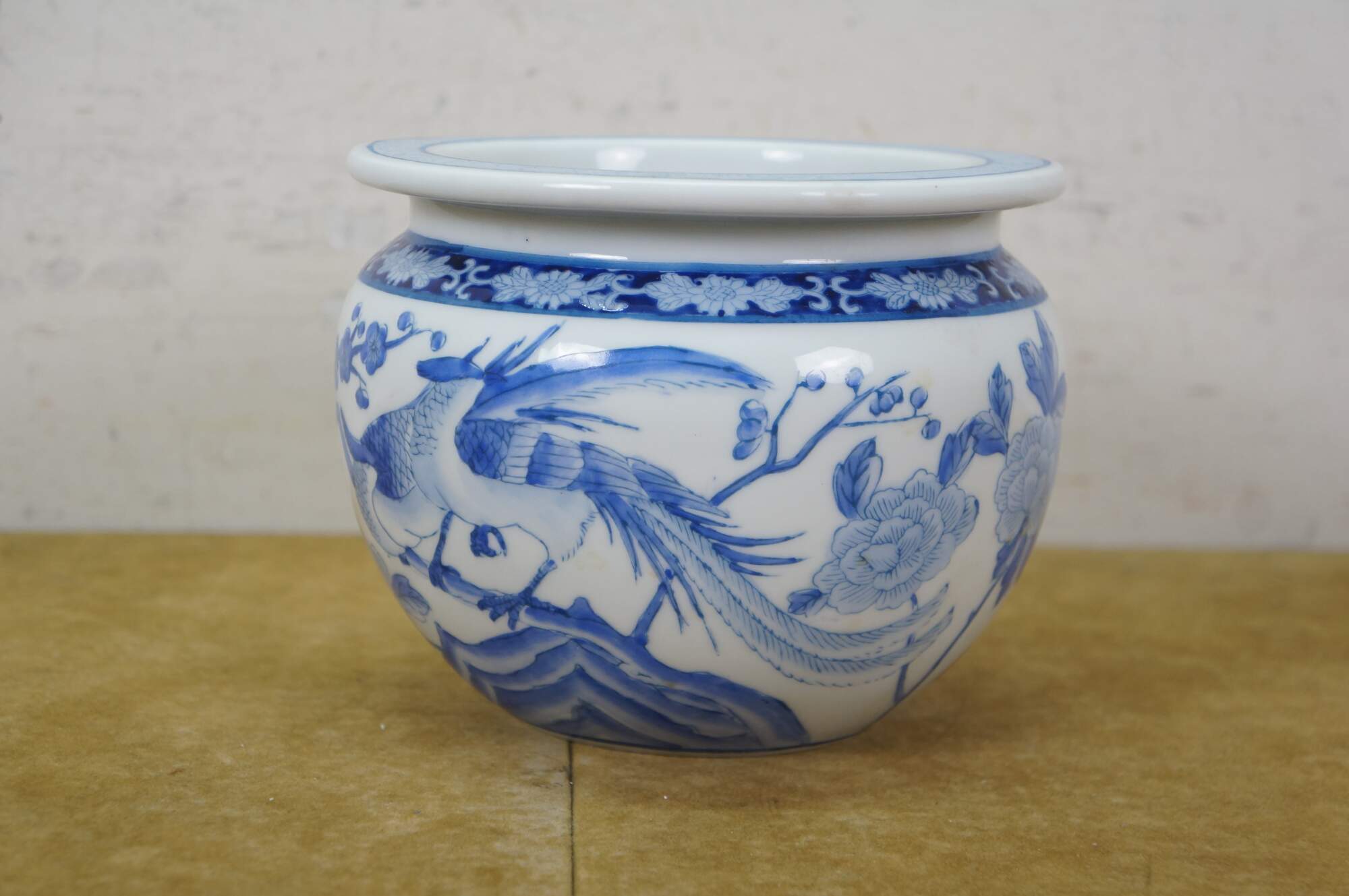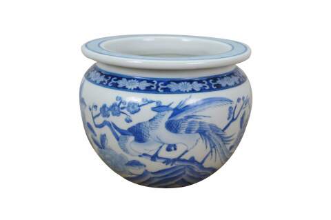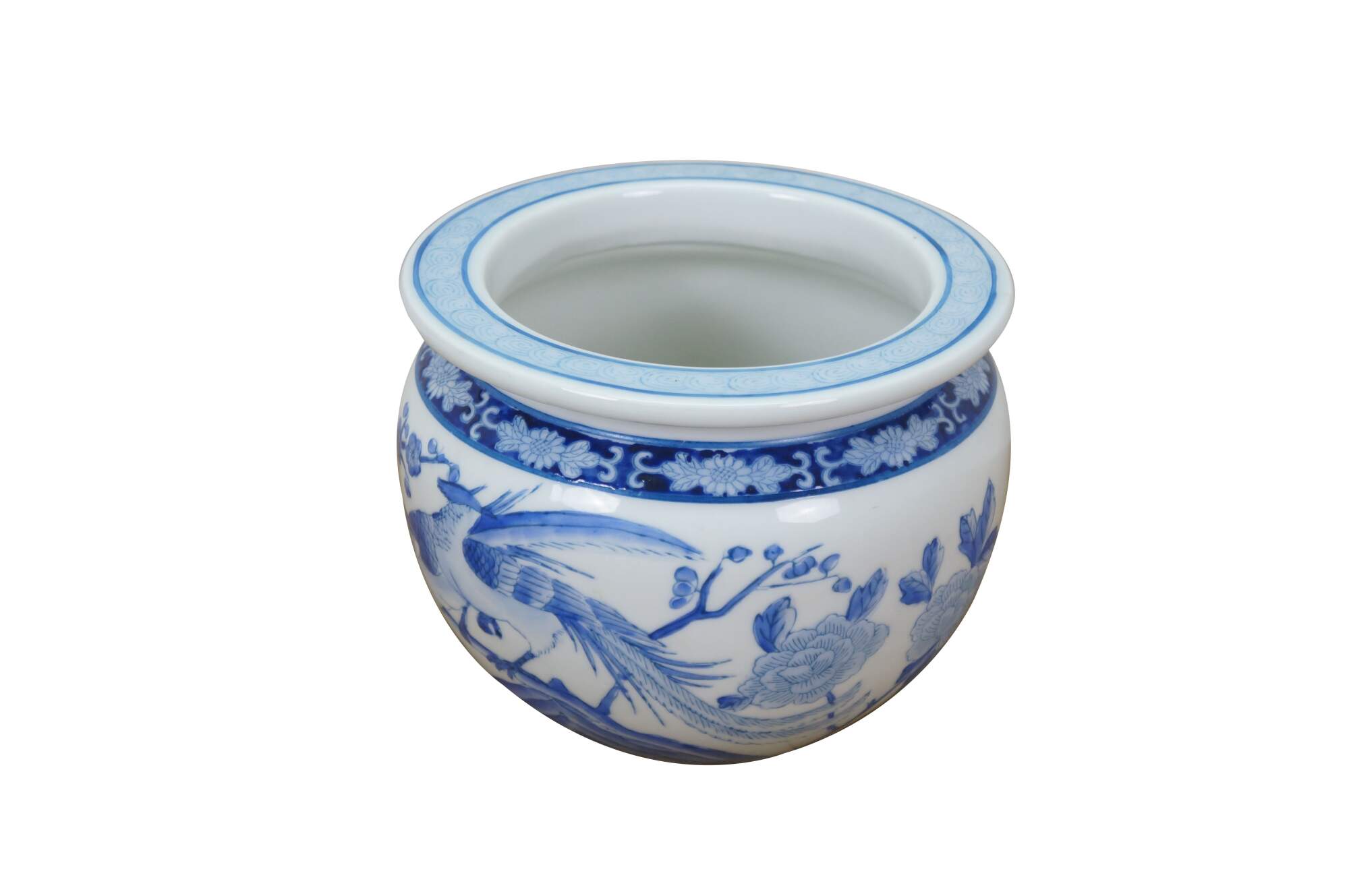 Macau Chinoiserie Blue & White Phoenix Pheasant Bird Fish Bowl Planter Cachepot