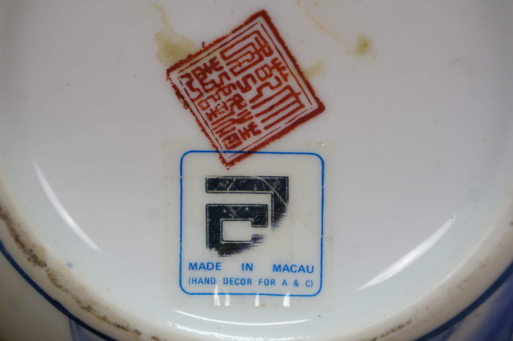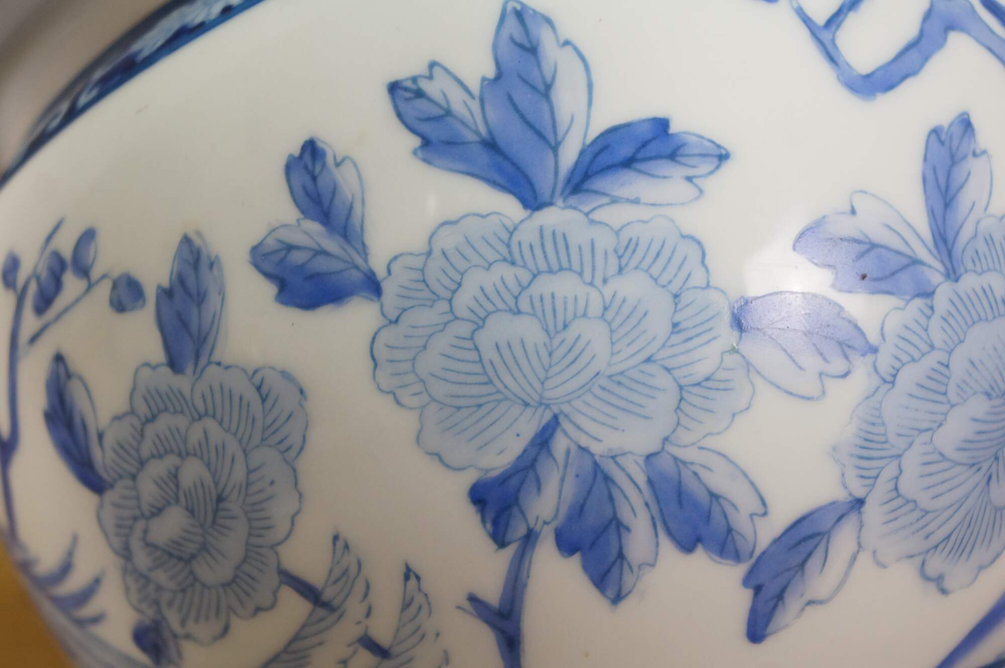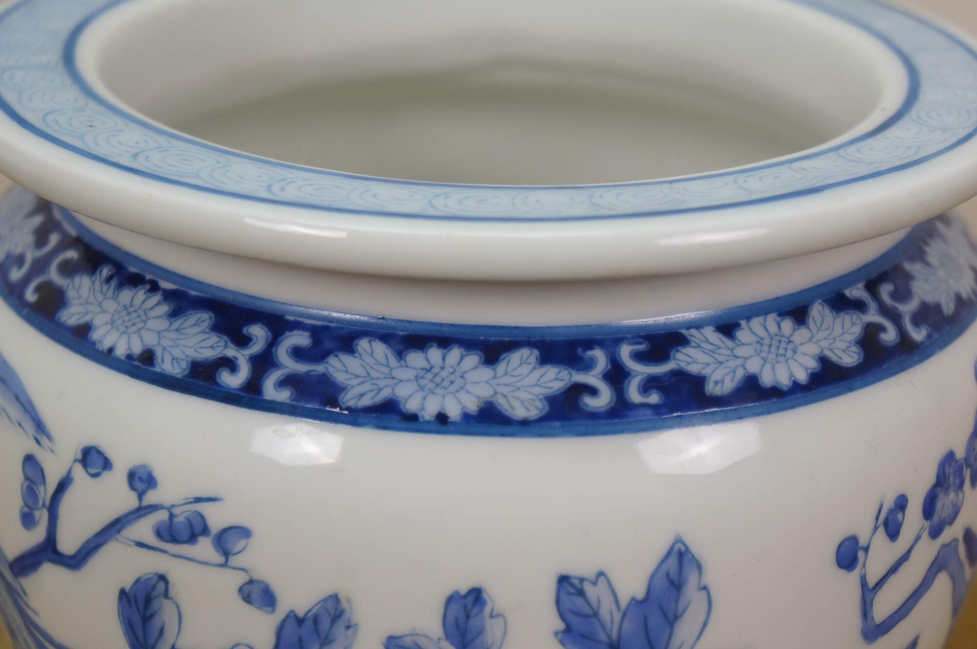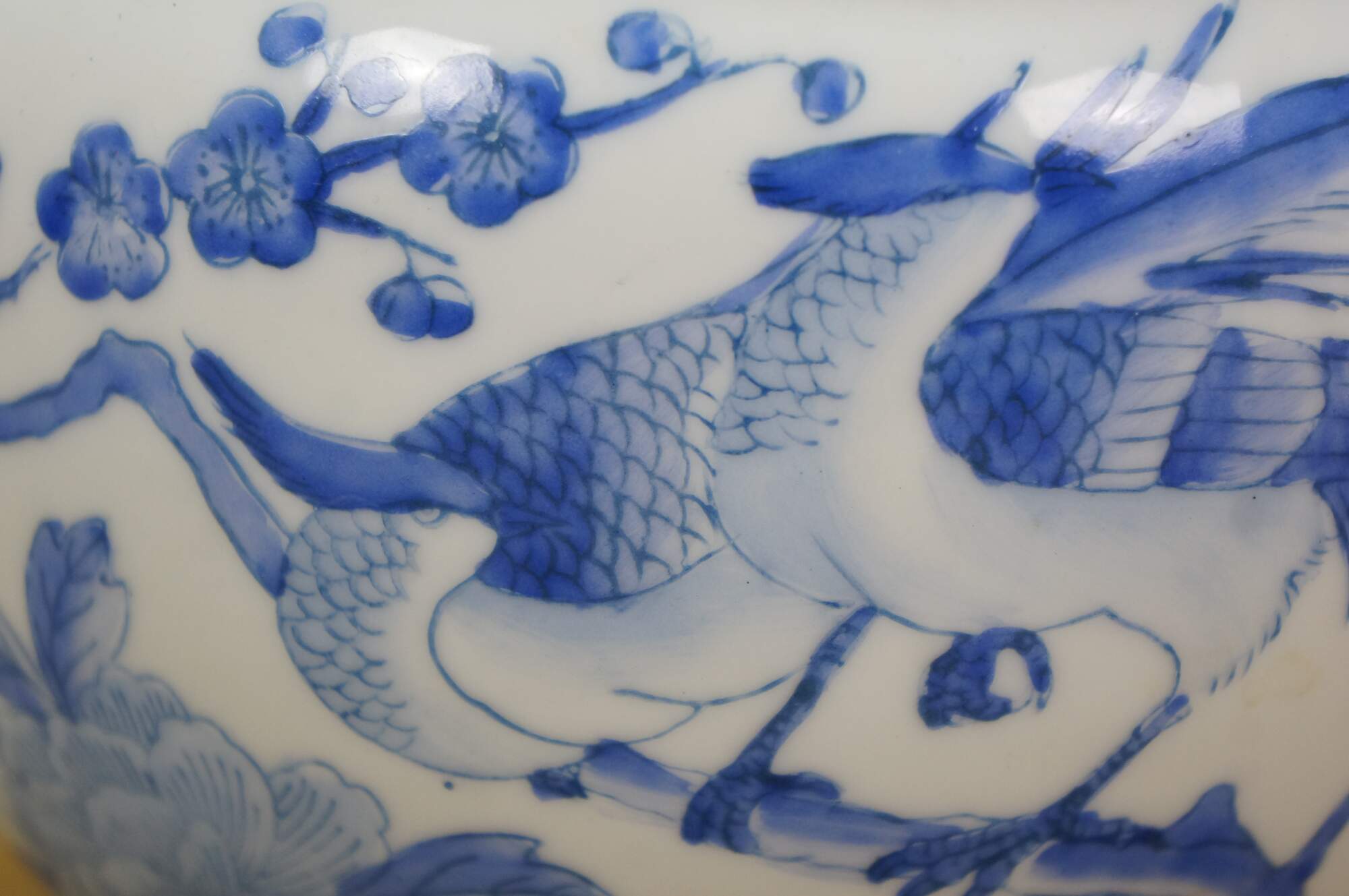 Vintage 20th century blue and white chinoiserie porcelain fish bowl / planter, decorated with a design of pheasants perched on flowering branches, with floral and cloud borders. Made in Macau - Hand Decor for A&C.