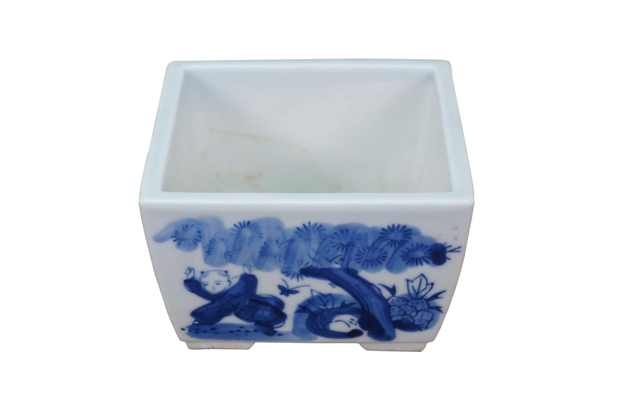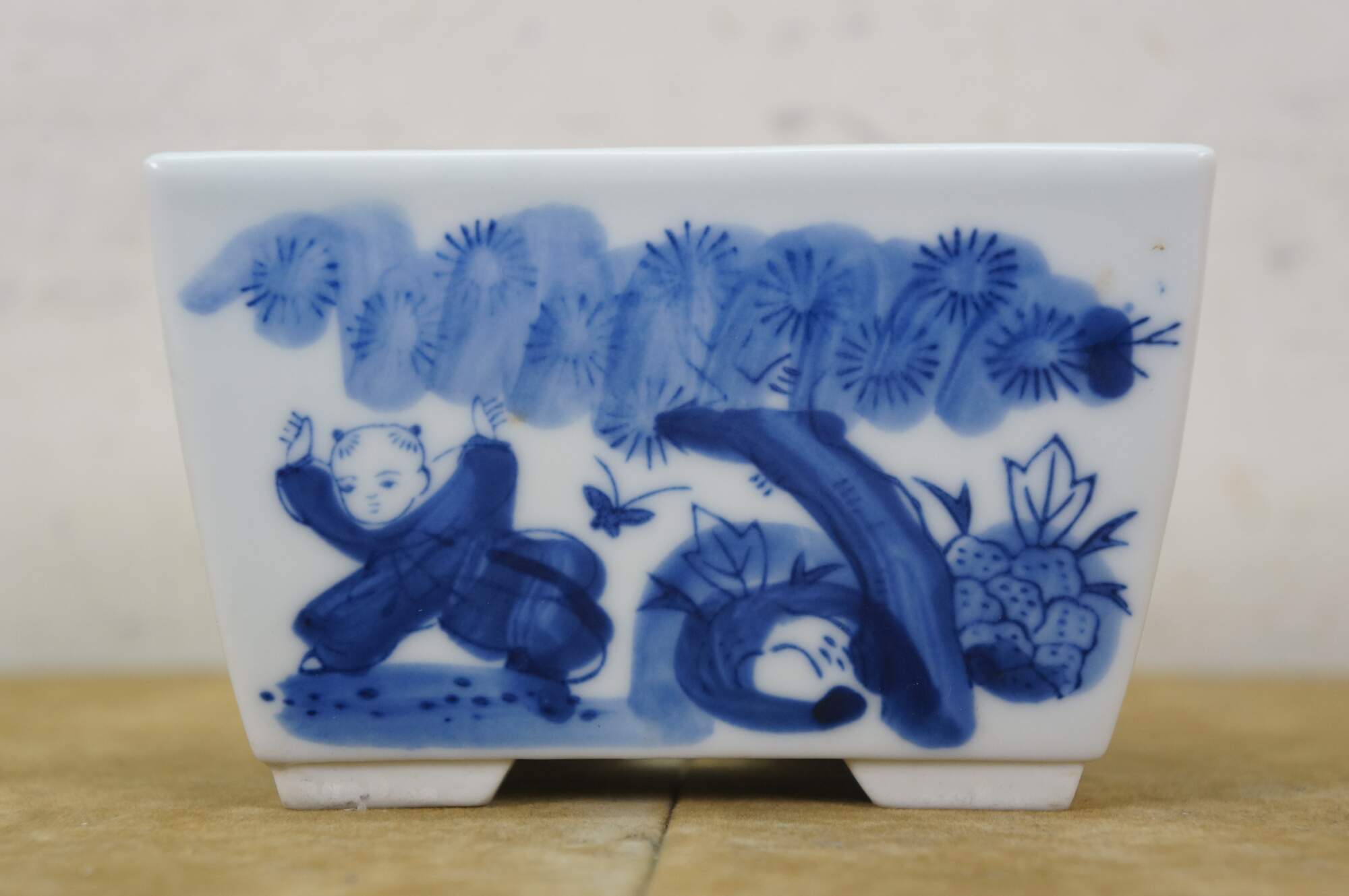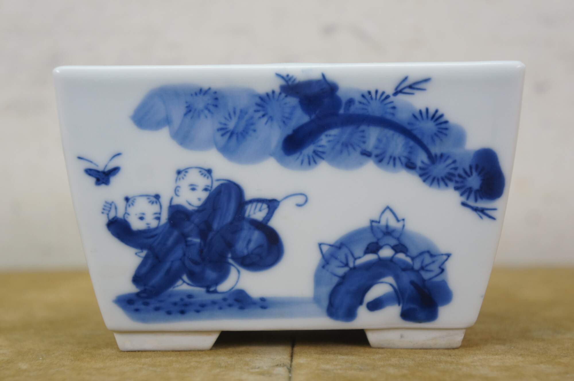 Circa early to mid 20th century Showa period Japanese imari porcelain bonsai bowl / planter. Square form with feet at corners and drain hole, hand painted in blue with scenes of children playing in a garden.