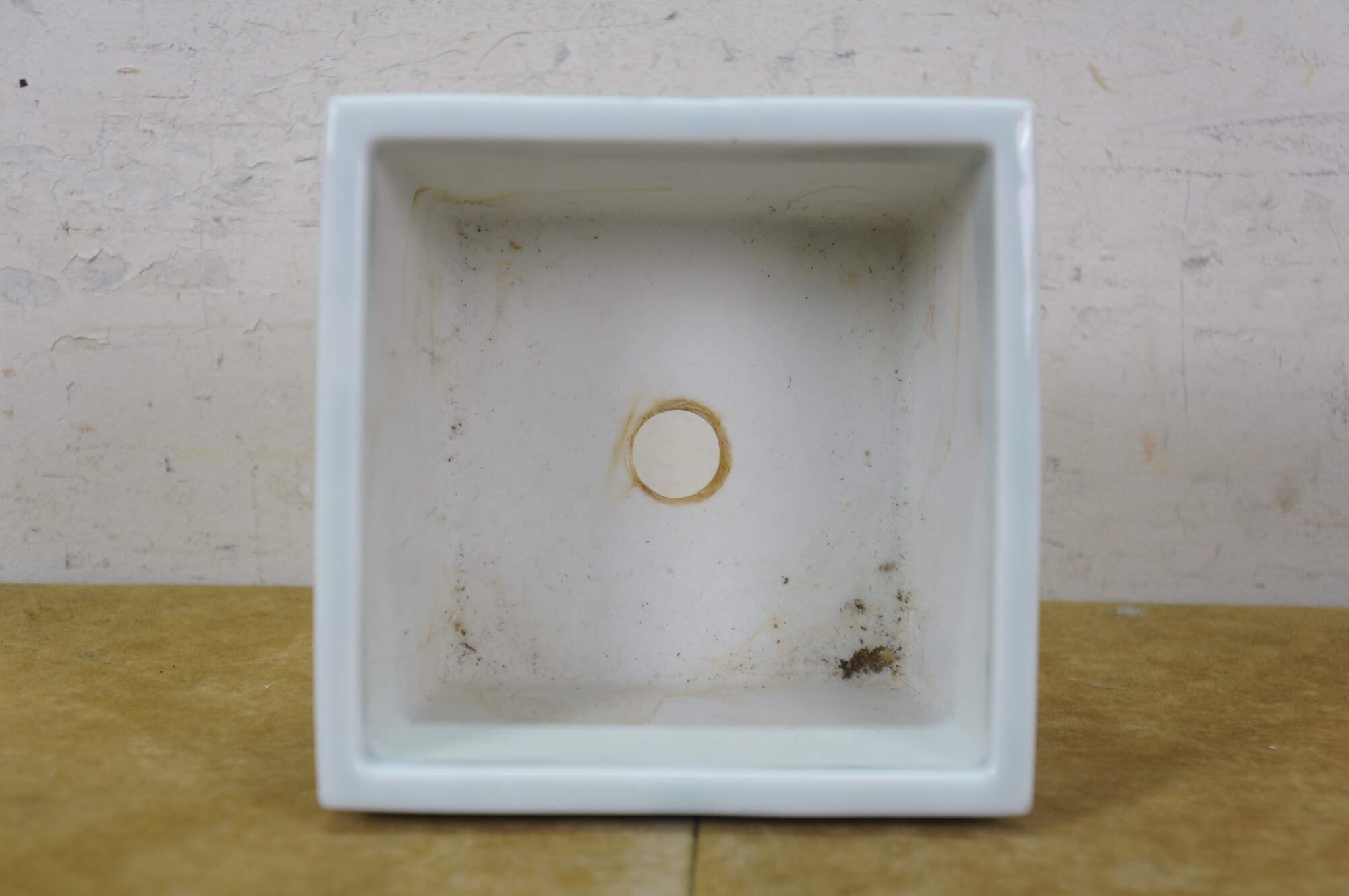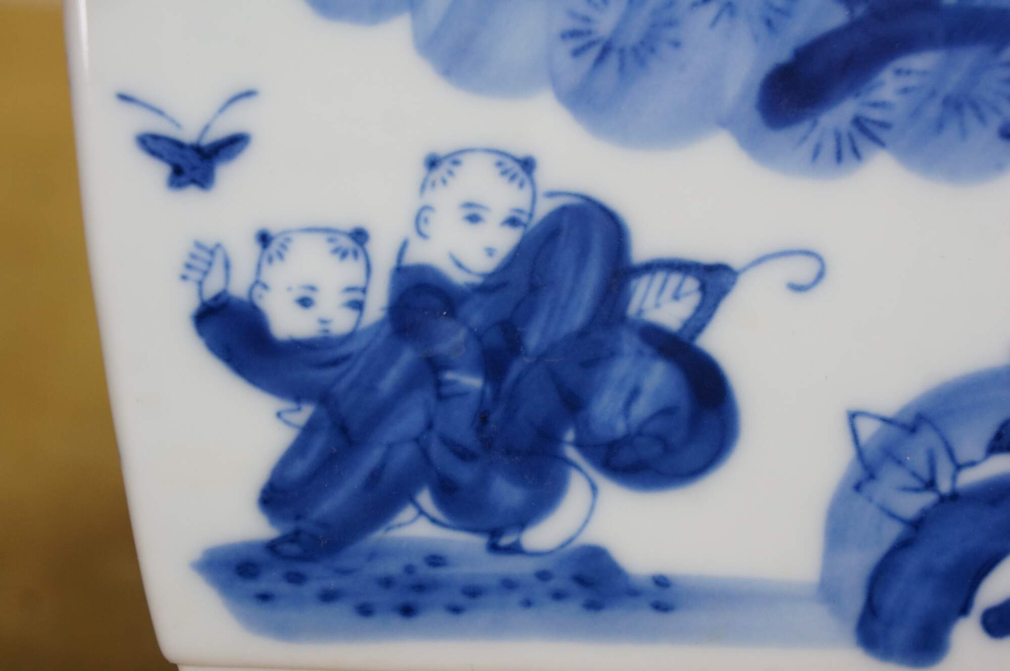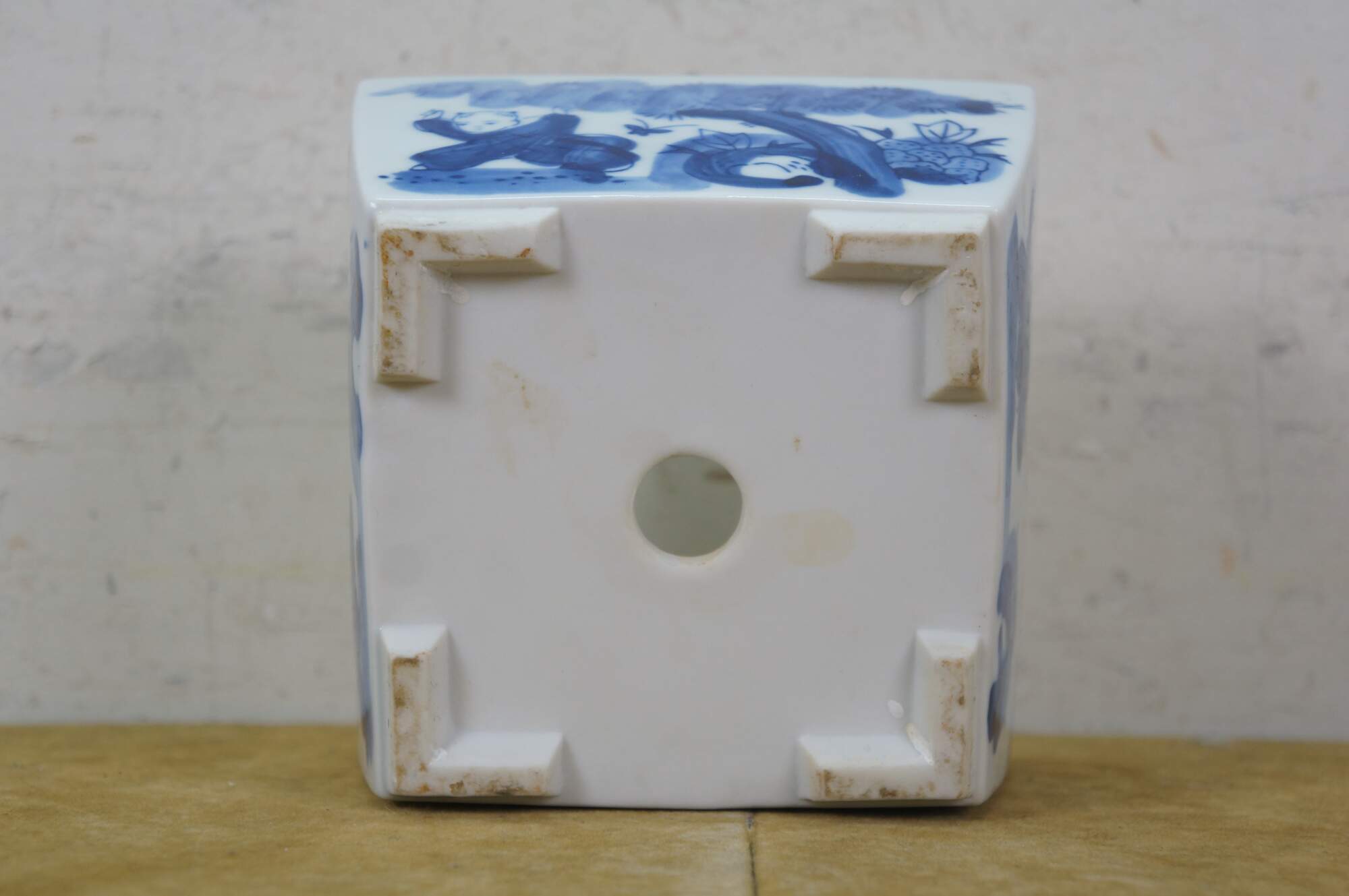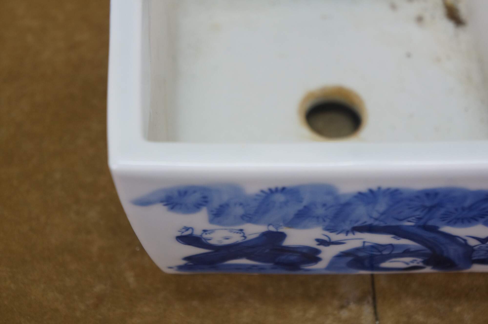 Circa early to mid 20th century Showa period Japanese imari porcelain bonsai bowl / planter. Square form with feet at corners and drain hole, hand painted in blue with scenes of children playing in a garden.